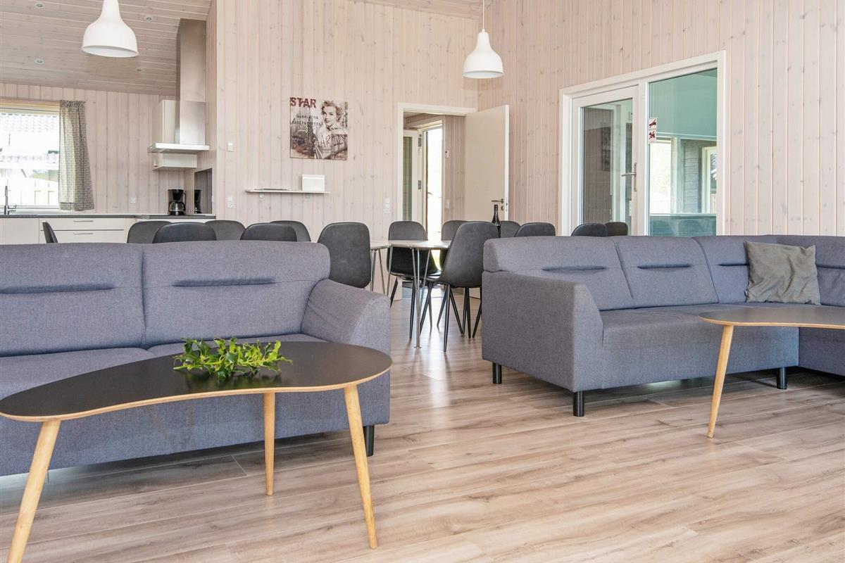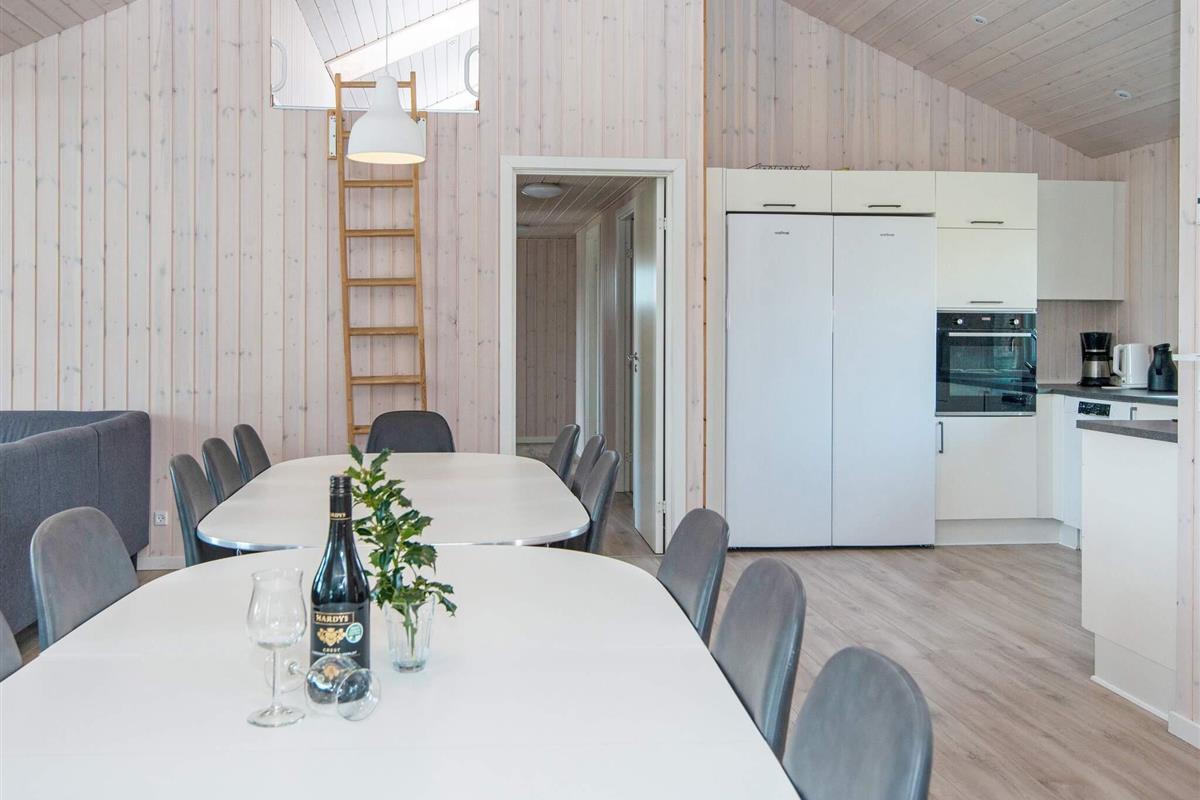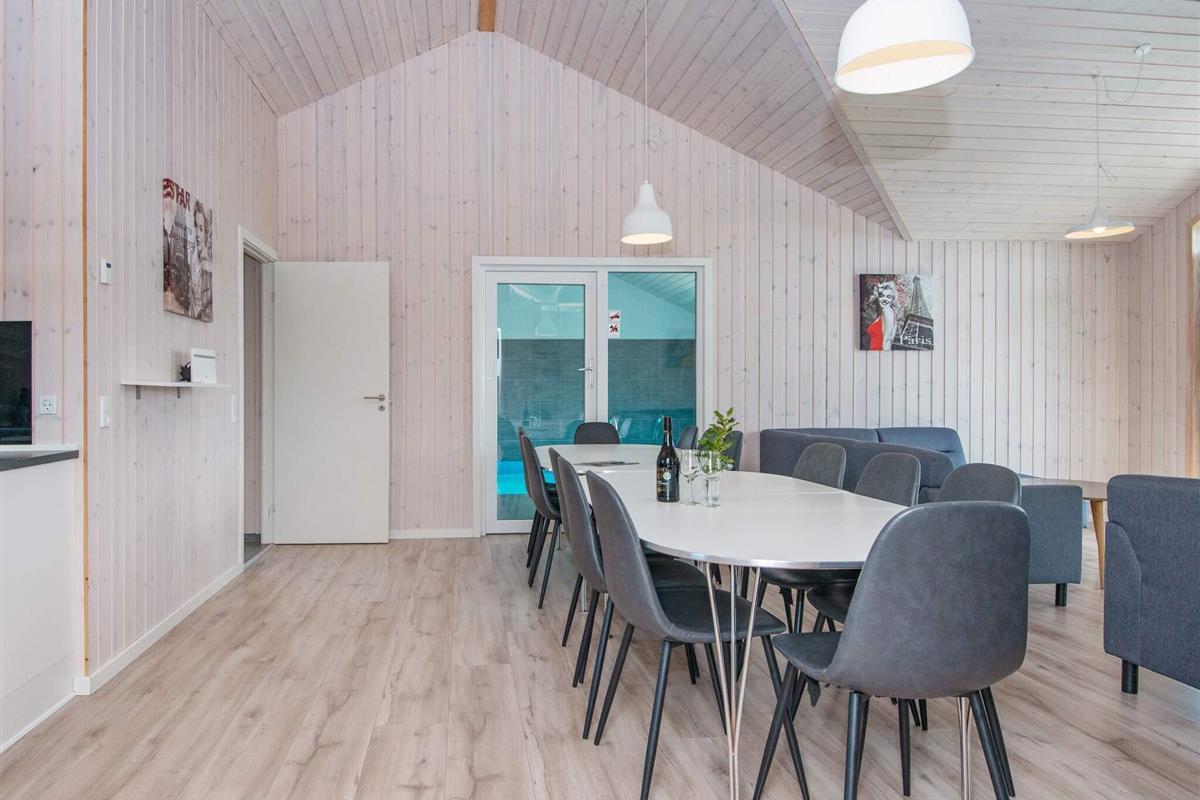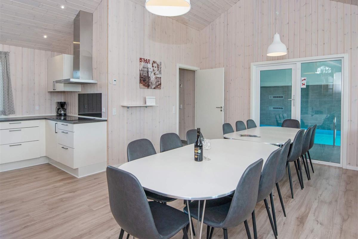 #Das geräumige Ferienhaus hat einen offenen Küchen-/Wohnbereich mit Essecke. Zur guten Küchenausstattung gehören auch Cerankochfeld, Backofen und Geschirrspüler. Das Haus ist generell umfassend ausgestattet und bietet sich mit seinen 5 Schlafzimmern und seinem Schlafboden mit 6 weiteren Schlafplätzen auch für einen Mehrfamilienurlaub an. Dafür stehen drei Badezimmer bereit, eines davon im Anschluss an den Poolbereich mit Whirlpool. Sollte das Wetter mal nicht so mitspielen, gibt es im sogenannten Aktivitätsraum einen Tischkicker sowie einen Gamer-Bereich mit großem TV, Nintendo Classic Mini mit 30 Spielen, u.a. Pac-Man, Galaga, Dr. Mario, etc.