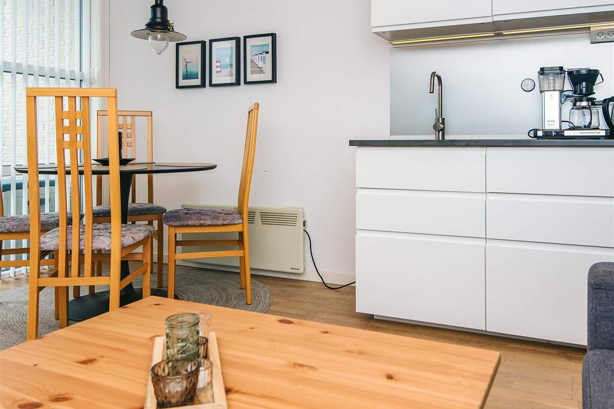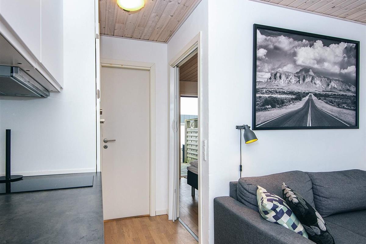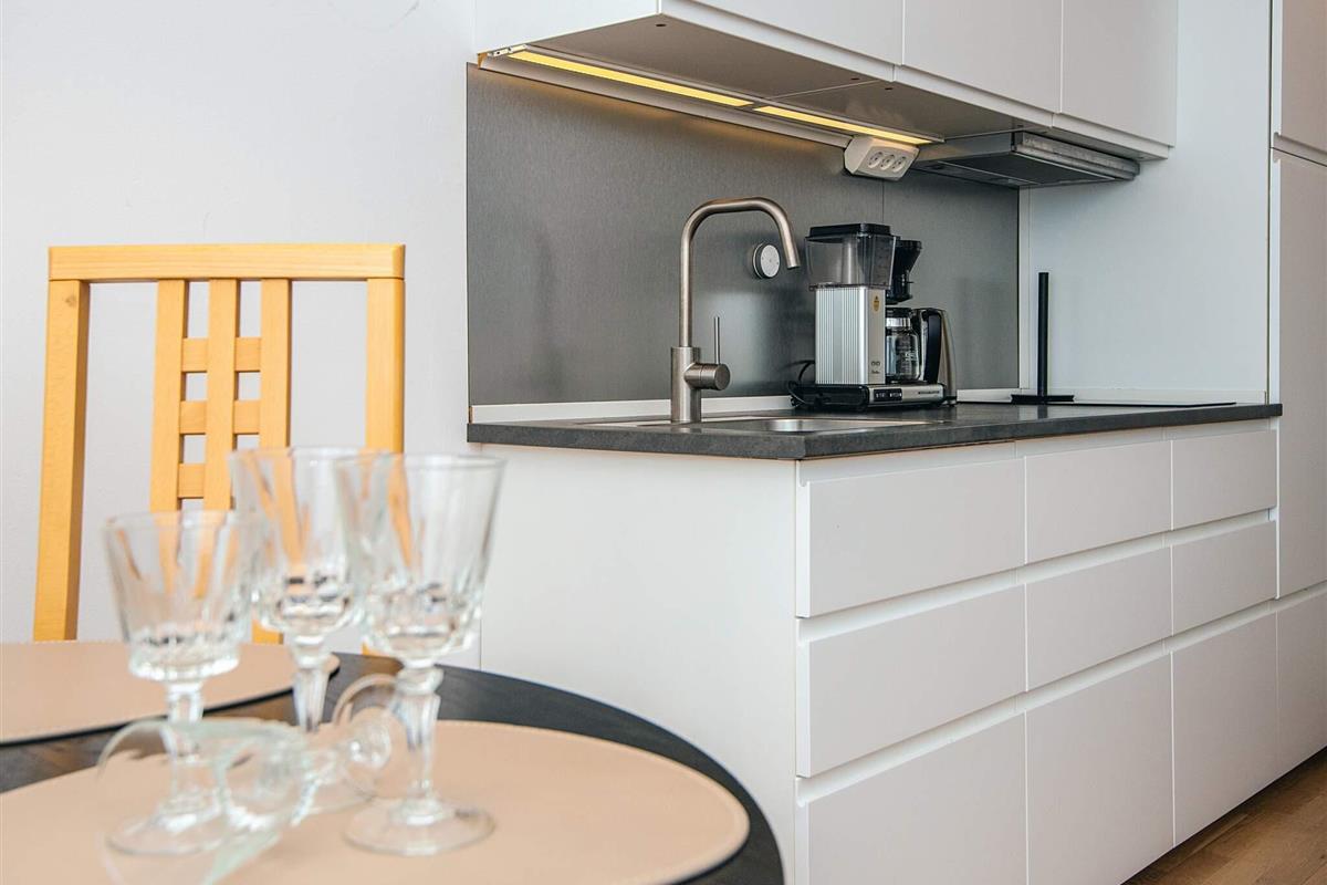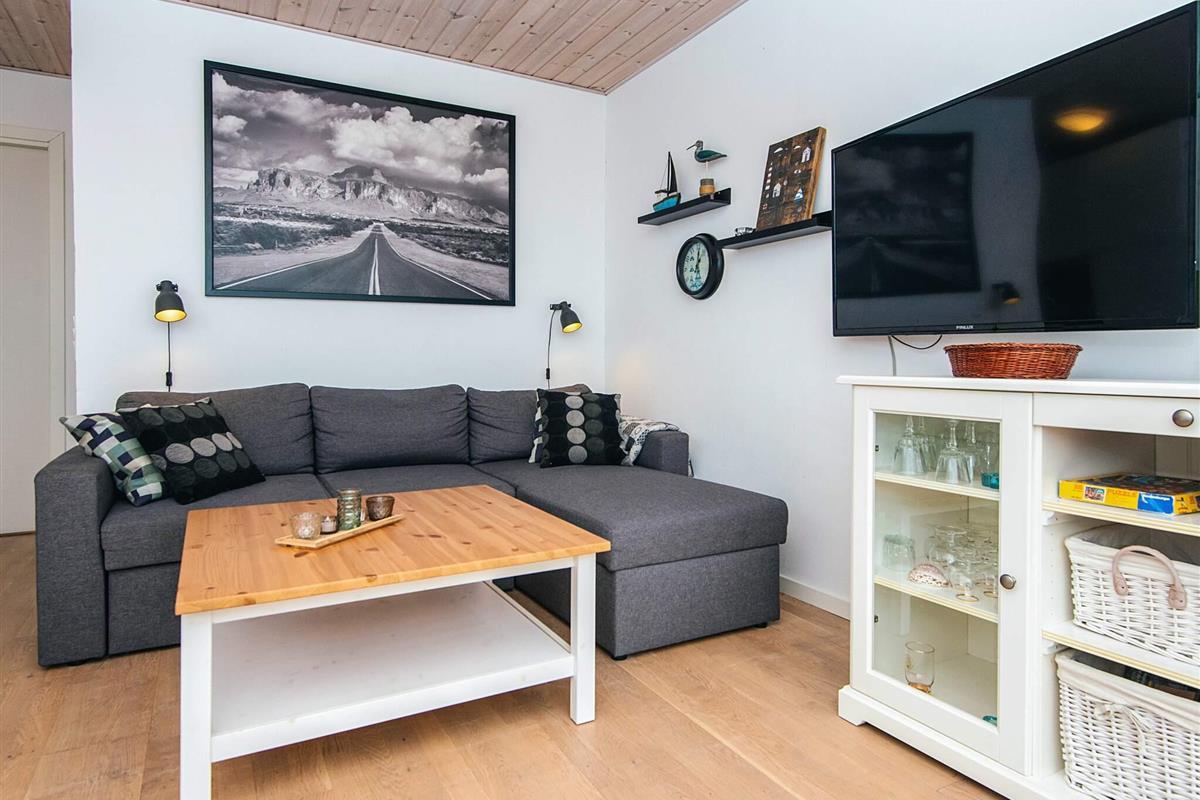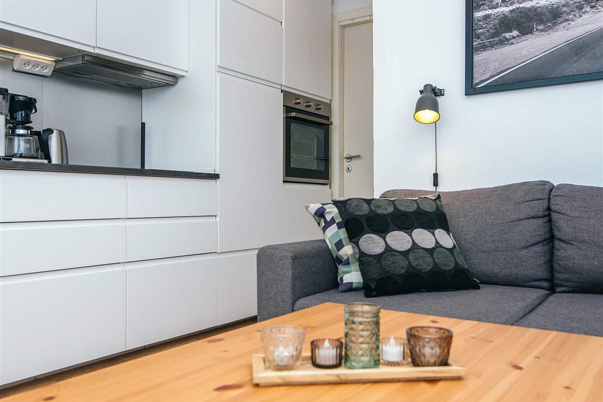 Die für die Saison 2019 umfassend renovierte Ferienwohnung ist hell und gemütlich eingerichtet. Küche und Bad sind neuwertig. Es gibt Chromecast mit der Möglichkeit, eigene TV-Dienste zu streamen. Die Küche ist offen in den Wohnbereich mit doppelter Schlafcouch und Essecke integriert. Das Schlafzimmer mit zwei Einzelbetten fungiert zugleich als Eingangsdiele bzw. Durchgangsraum.