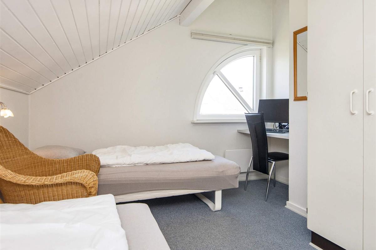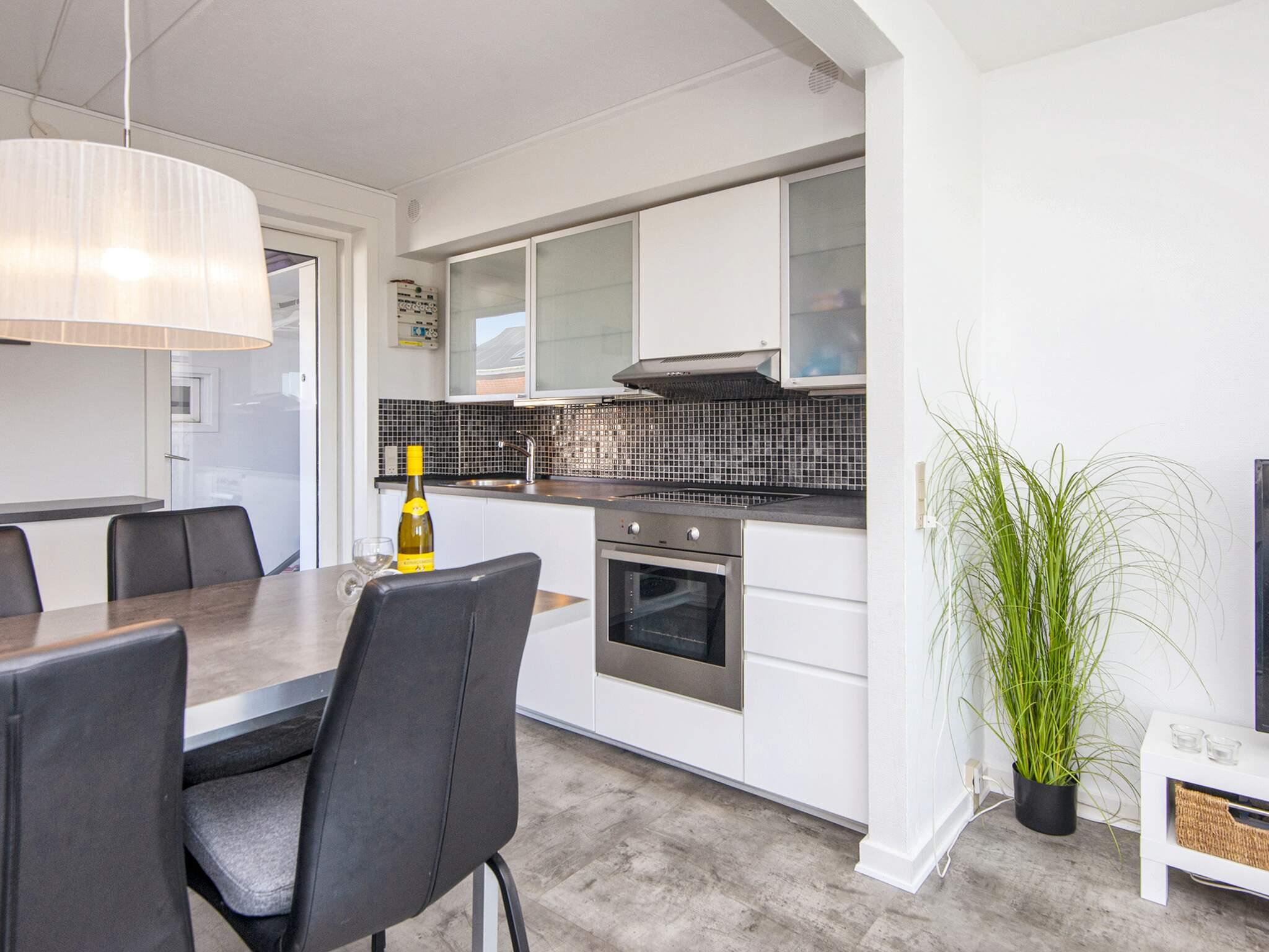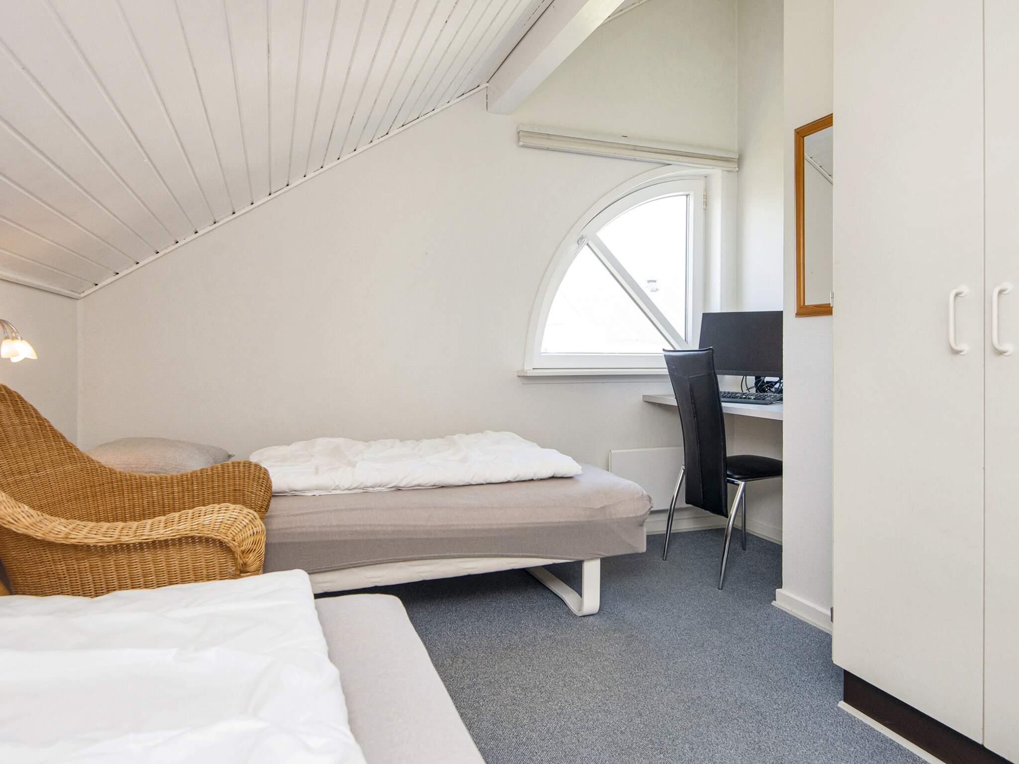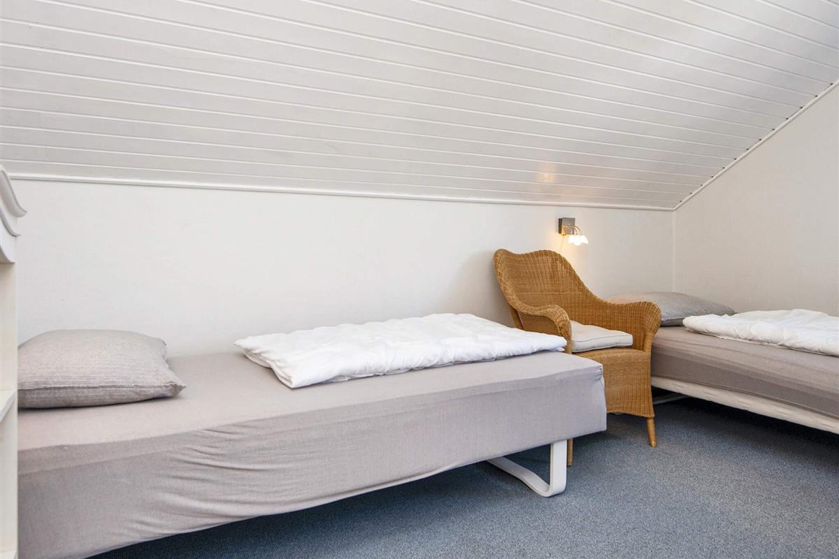 Es gibt im Ferienhaus insgesamt 3 Schlafzimmer; eines im Parterre mit zwei Kojen in einem Etagenbett (70x200 cm), das zweite in der 1. Etage mit zwei Einzelbetten (90x200 cm), das dritte ebenfalls oben mit zwei Einzelbetten, die zu einem Doppelbett zusammengestellt wurden (160x200 cm). Die Küche verfügt über einen Kühlschrank mit Gefrierfach, Backofen und 4 Induktionsfelder sowie Mikrowelle. Es gibt ein Badezimmer mit Dusche und WC.