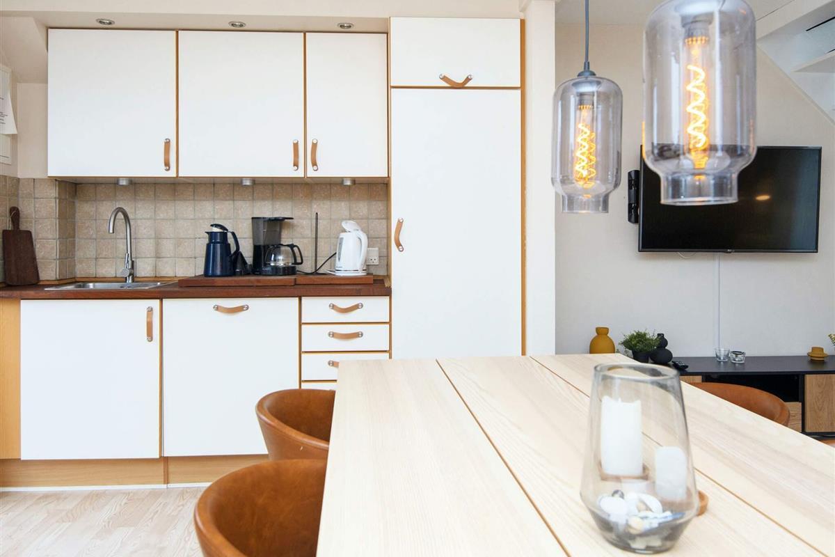 Das zweistöckige Ferienhaus ist gut aufgeteilt und verfügt über eine Küche, die offen mit dem Wohnzimmer verbunden ist. Von hier aus gelangen Sie hinaus auf private Terrassenflächen nach Osten und Westen – ideal für einen Morgenkaffee in der Sonne oder entspannte Abende im Freien.