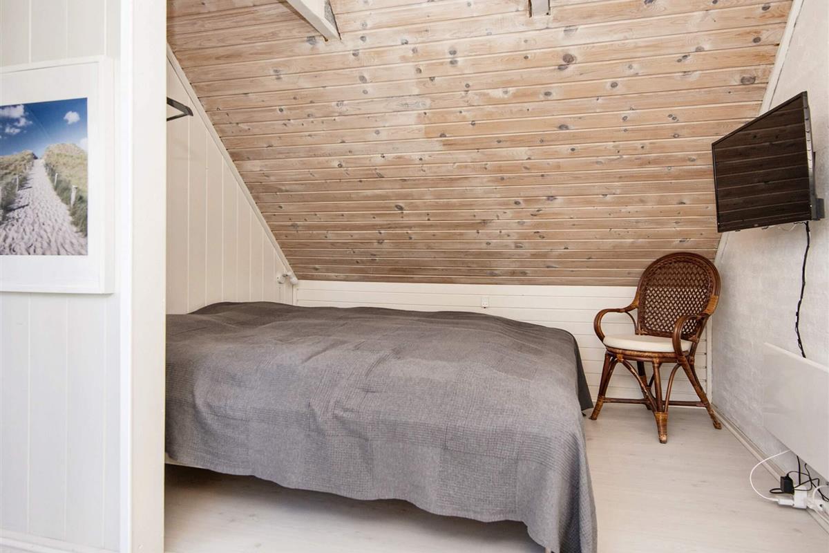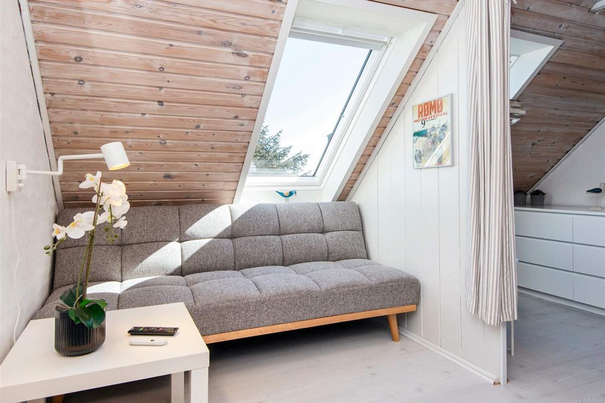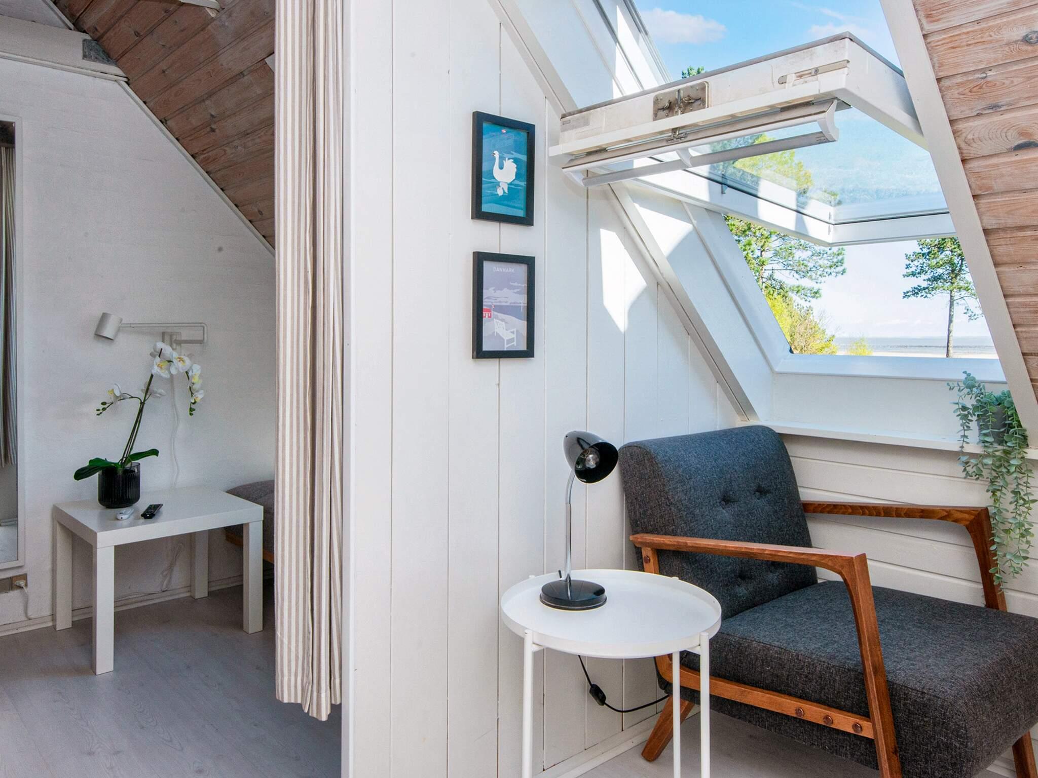 Oben im Dachgeschoss hat man herrlichen Ausblick zum Wattenmeer. Hier gibt es einen großen kombinierten Wohn-/Schlafbereich mit einem Doppelbett und einer doppelten Schlafcouch.