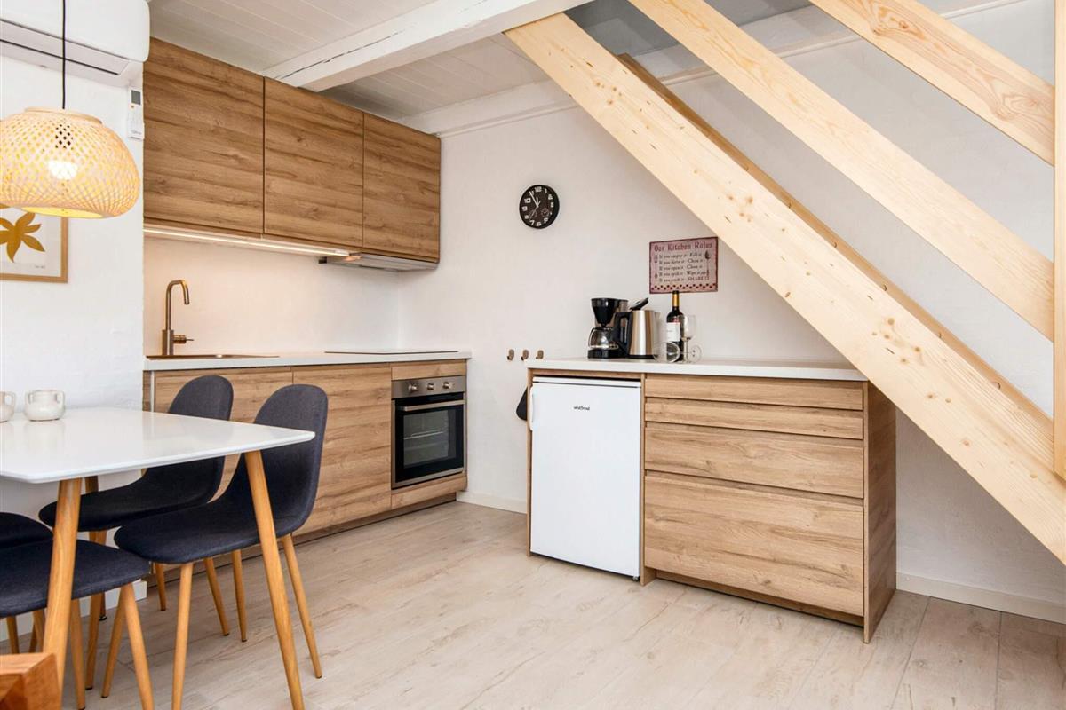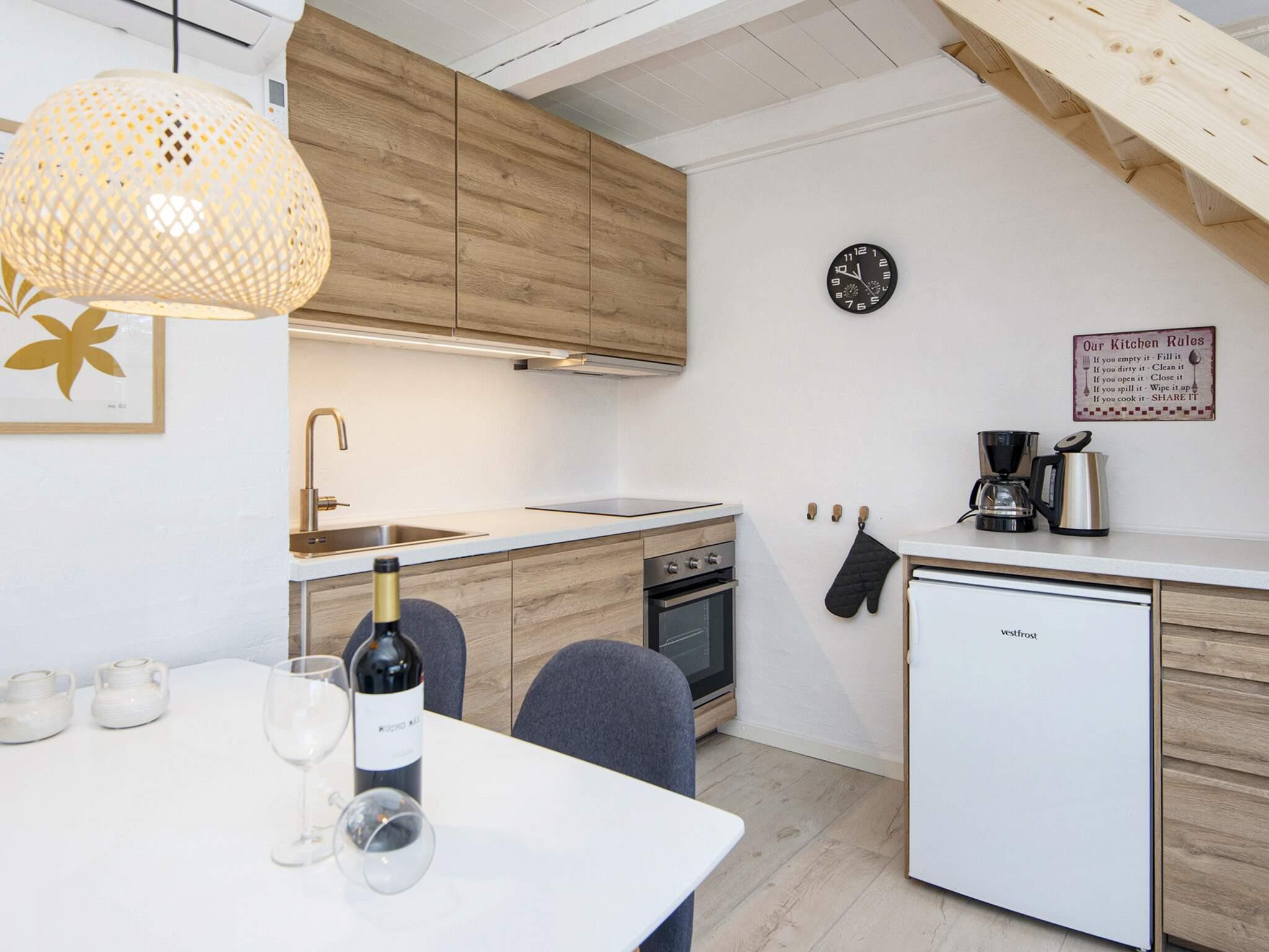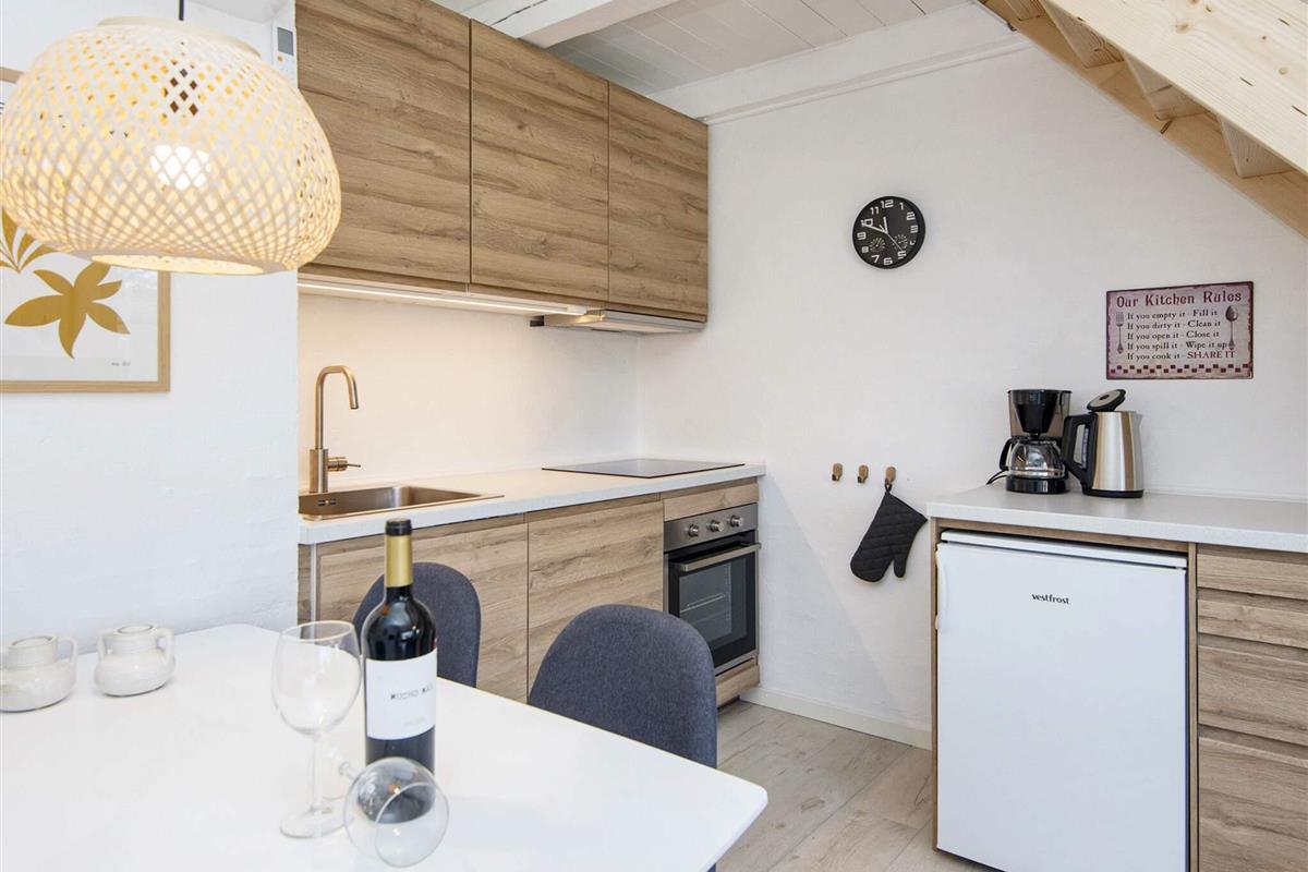 Reihenhaus mit Blick zum Wattenmeer bei Havneby. Im Erdgeschoss gibt es eine kleine Eingangsdiele, eine gut funktionierende Küche in offener Verbindung zum Wohnzimmer, wo das Sofa für zwei Personen ausgeklappt werden kann, und ein Badezimmer mit Dusche. Im Erdgeschoss angenehme Fußbodenheizung.
