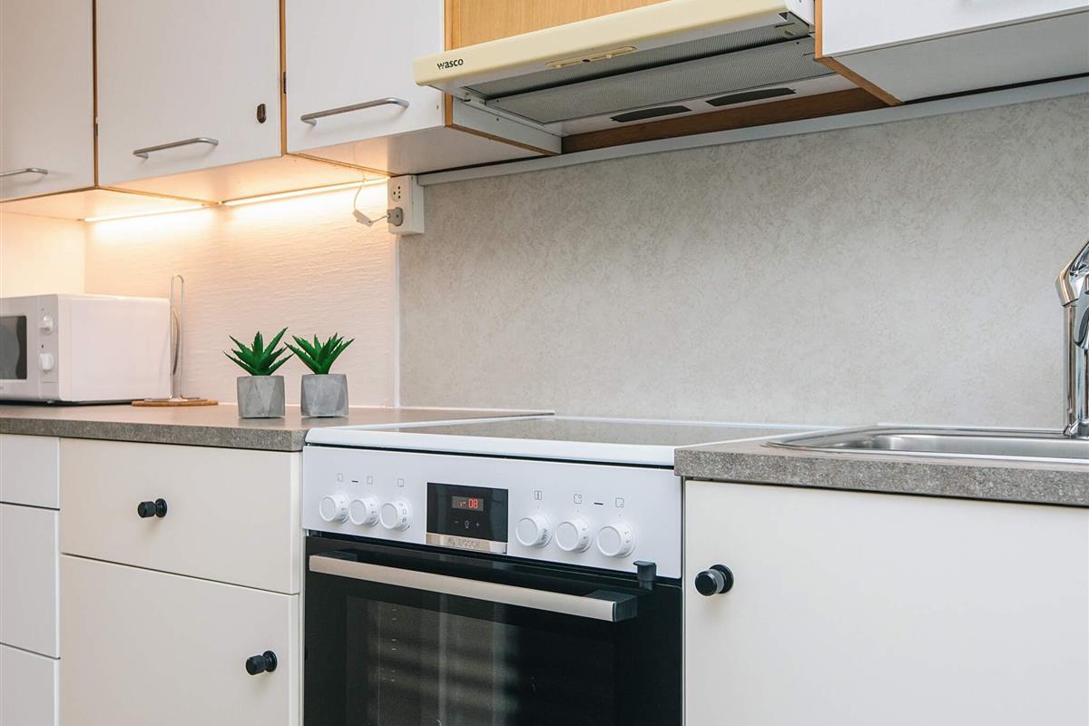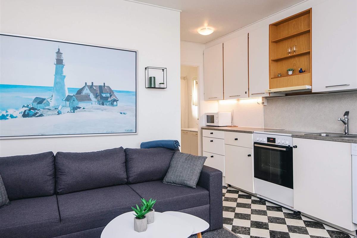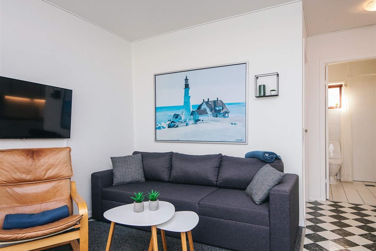 Sie betreten die Wohnung über die erste Terrasse und das Schlafzimmer, das mit einem Doppelbett in einem Schrank ausgestattet ist. In der gut ausgestatteten, offenen Einbauküche können Sie ein leckeres Abendessen zubereiten. Es gibt sogar einen kleinen Geschirrspüler und einen Mini-Backofen mit Glaskeramikkochfeld. Anschließend können Sie es sich auf dem Sofa mit Ihrem Lieblingsfilm gemütlich machen und den Alltag hinter sich lassen, während der elektrische Kamin für wohlige Wärme sorgt. Das Sofa im Wohnzimmer lässt sich in ein Doppelschlafsofa verwandeln.