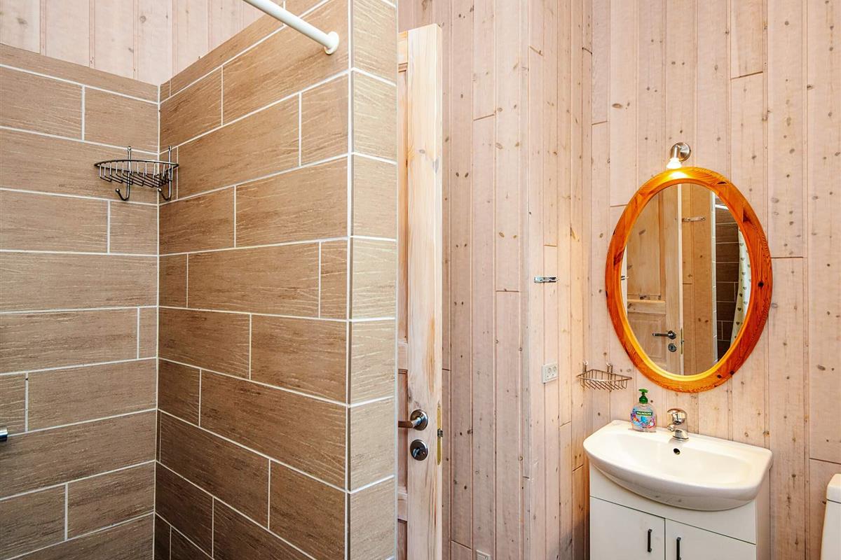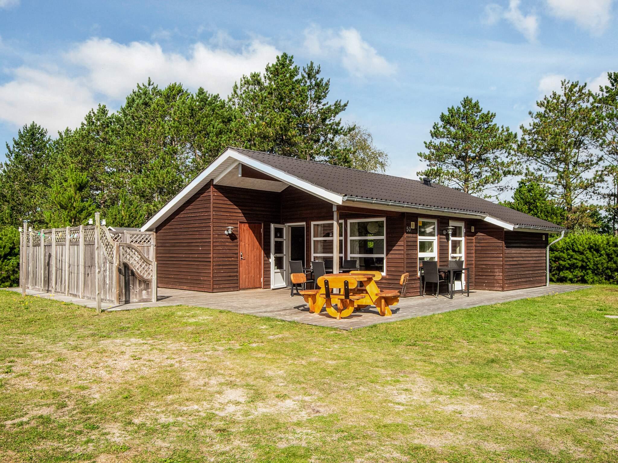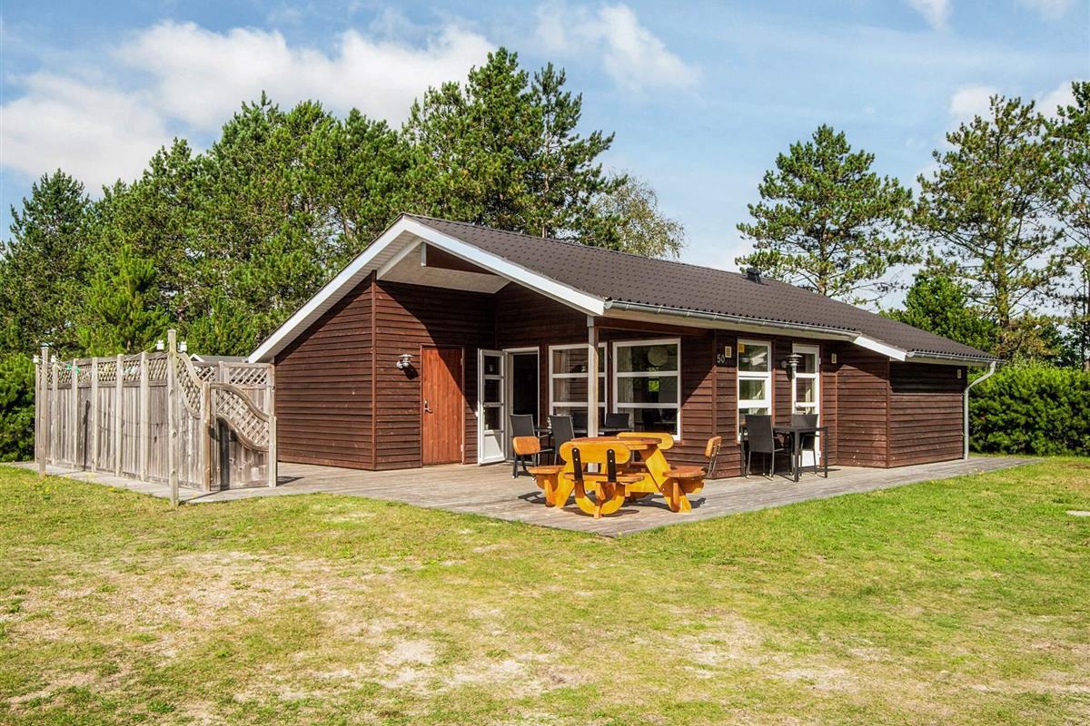 Zum Ferienhaus gehört auch eine große, teils überdachte Terrassenfläche mit Gartenmöbeln, Sonnenliegen und einem Grill. Außerdem Sauna und praktische Außendusche auf dem Grundstück.