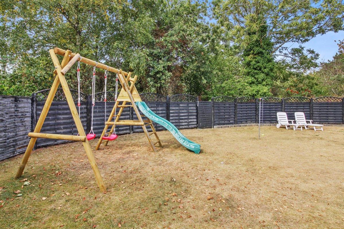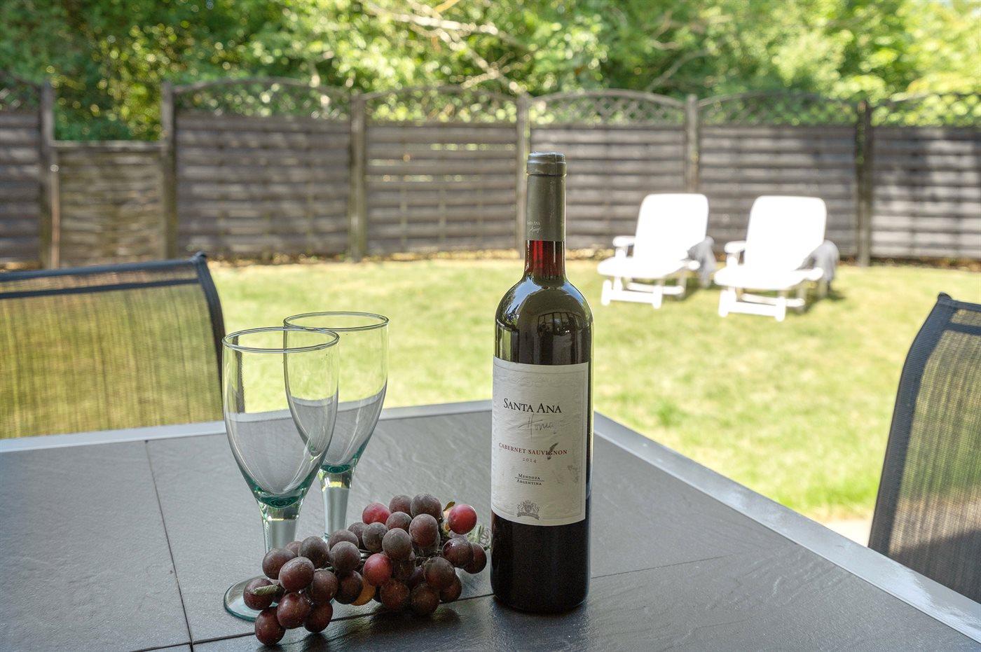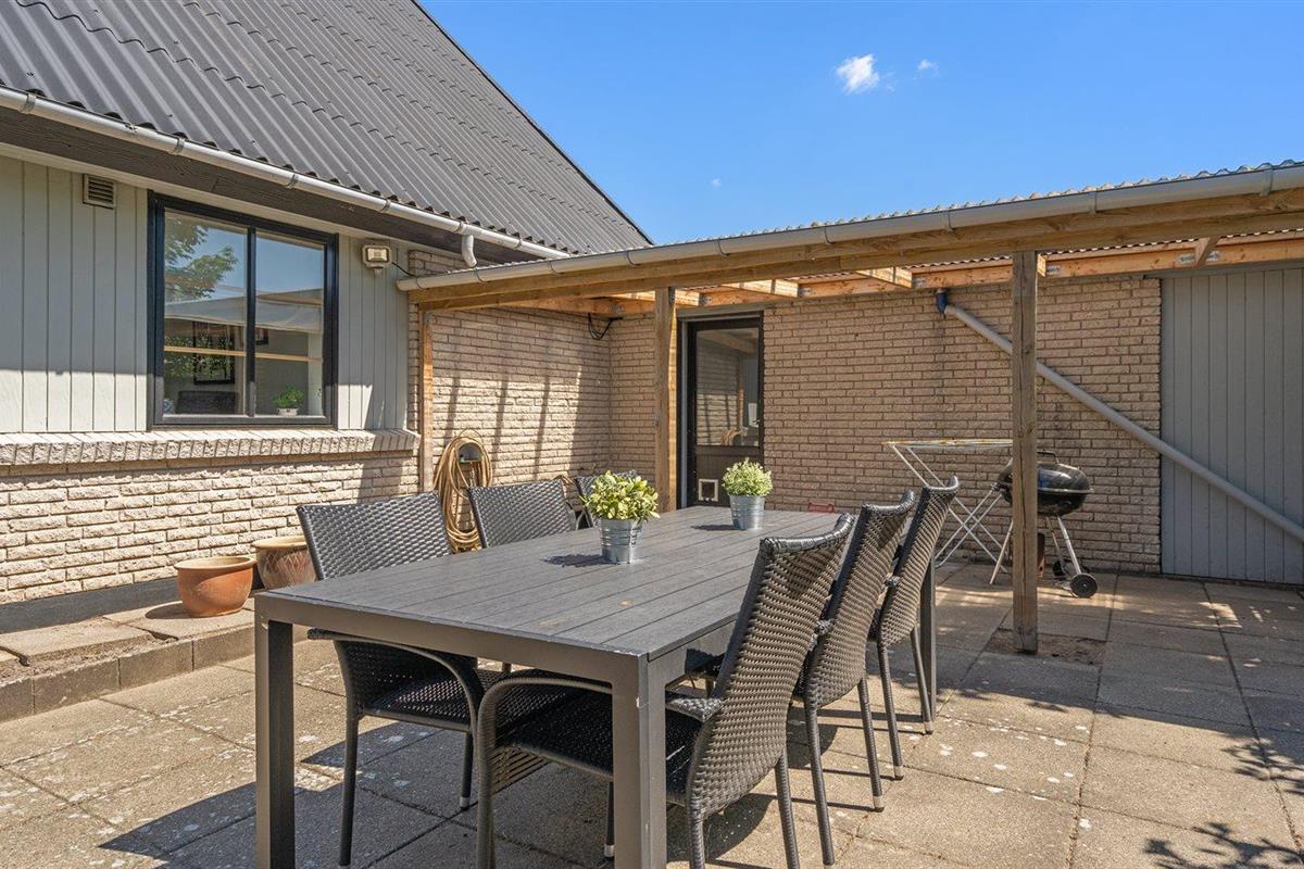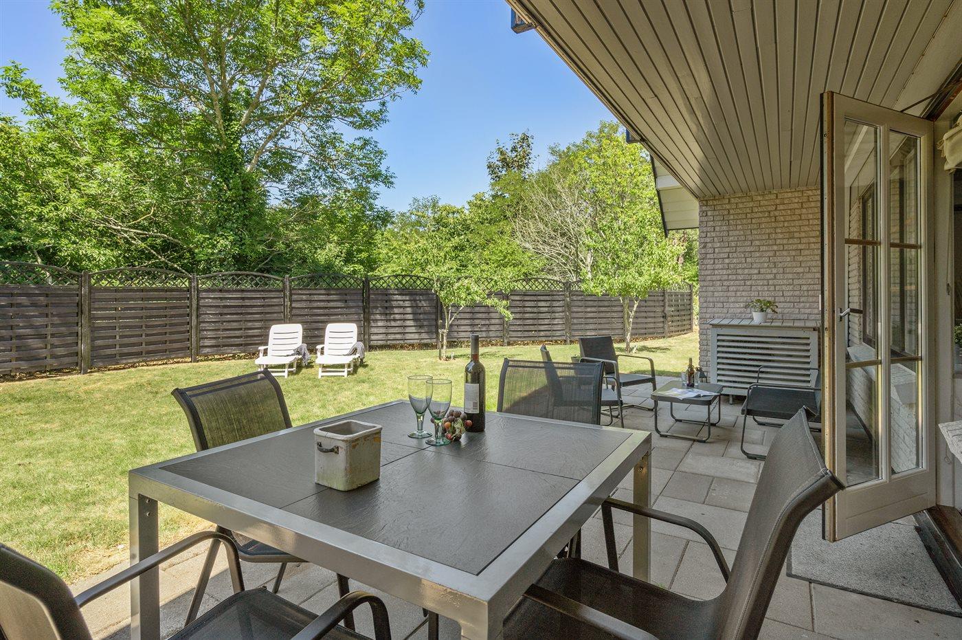 De vakantiewoning is gelegen op een 860 m² groot aangelegde tuin. De grond is omheind. Afstand tot de zee 2500 m.Afstand tot de waddenzee 550 m. Dichtstbijzijnde winkel 500 m. Er is een golfbaan op een afstand van 1500 m. Bij de vakantiewoning hoort 90 m² terras. Balkon. Carport ter beschikking. Parkeerplaats bij het huis.
