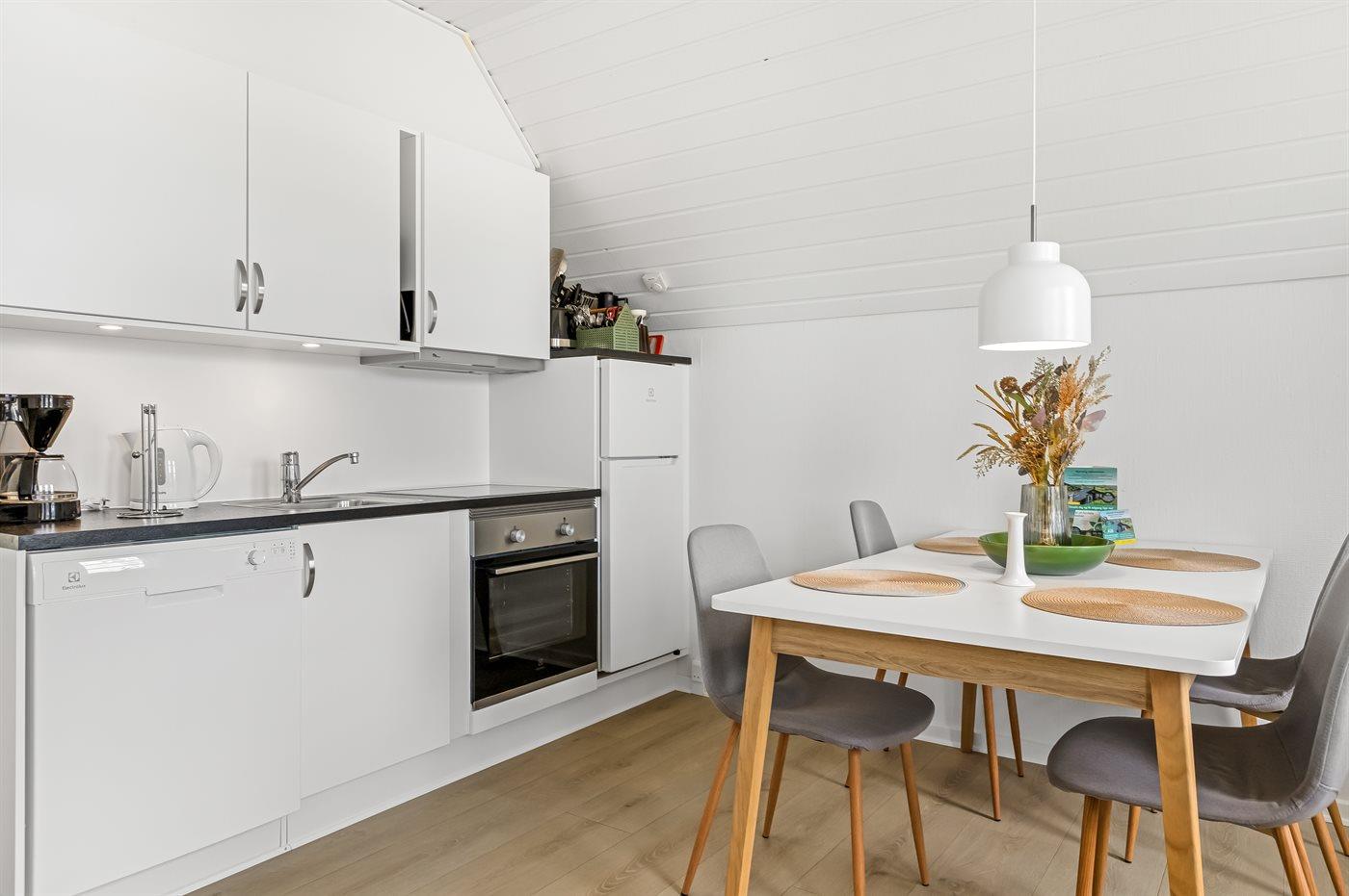 De keuken is uitgerust met koelkast Er zijn 4 keramische kookplaten, heteluchtoven en vaatwasser.