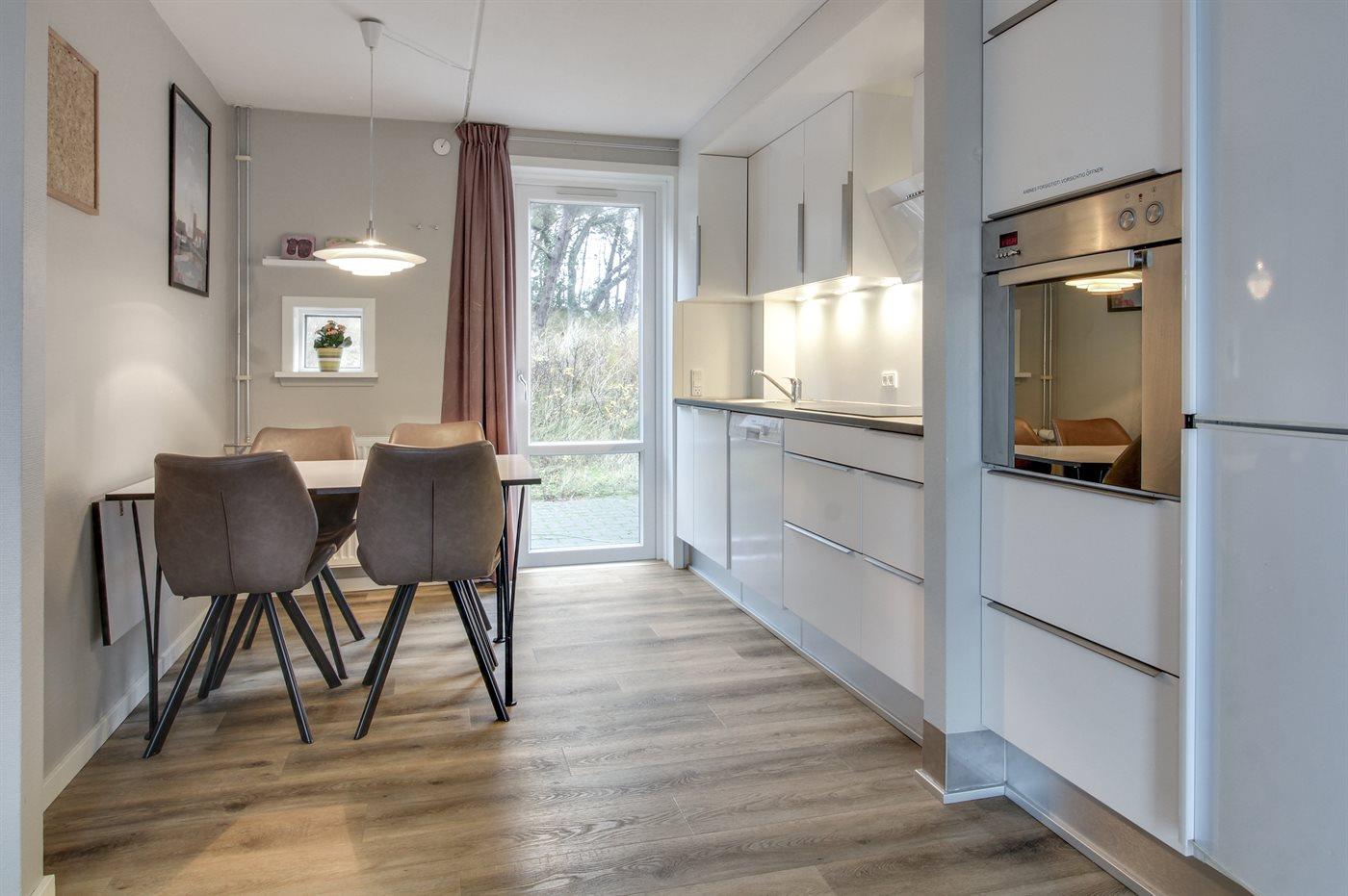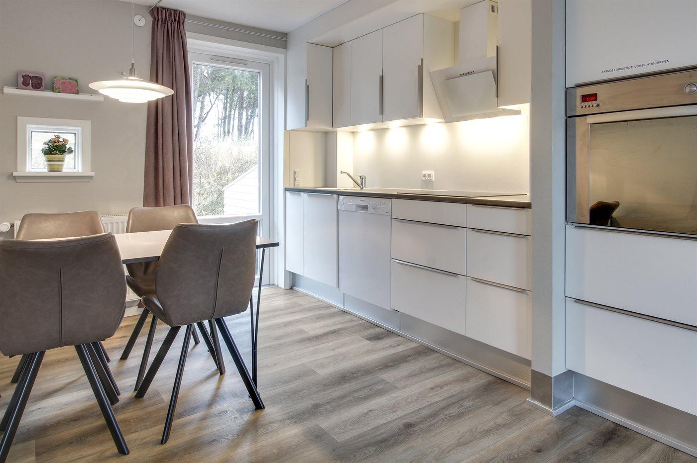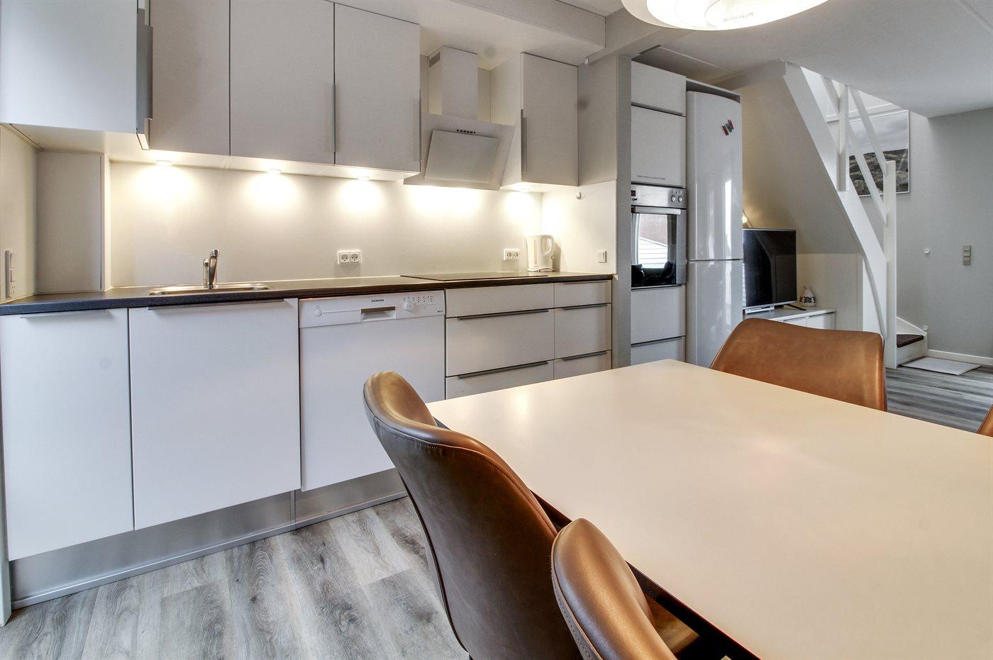 De keuken is uitgerust met koelkast Er is 4 inductiekookplaten, heteluchtoven, magnetron en vaatwasser.