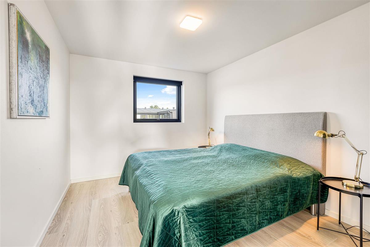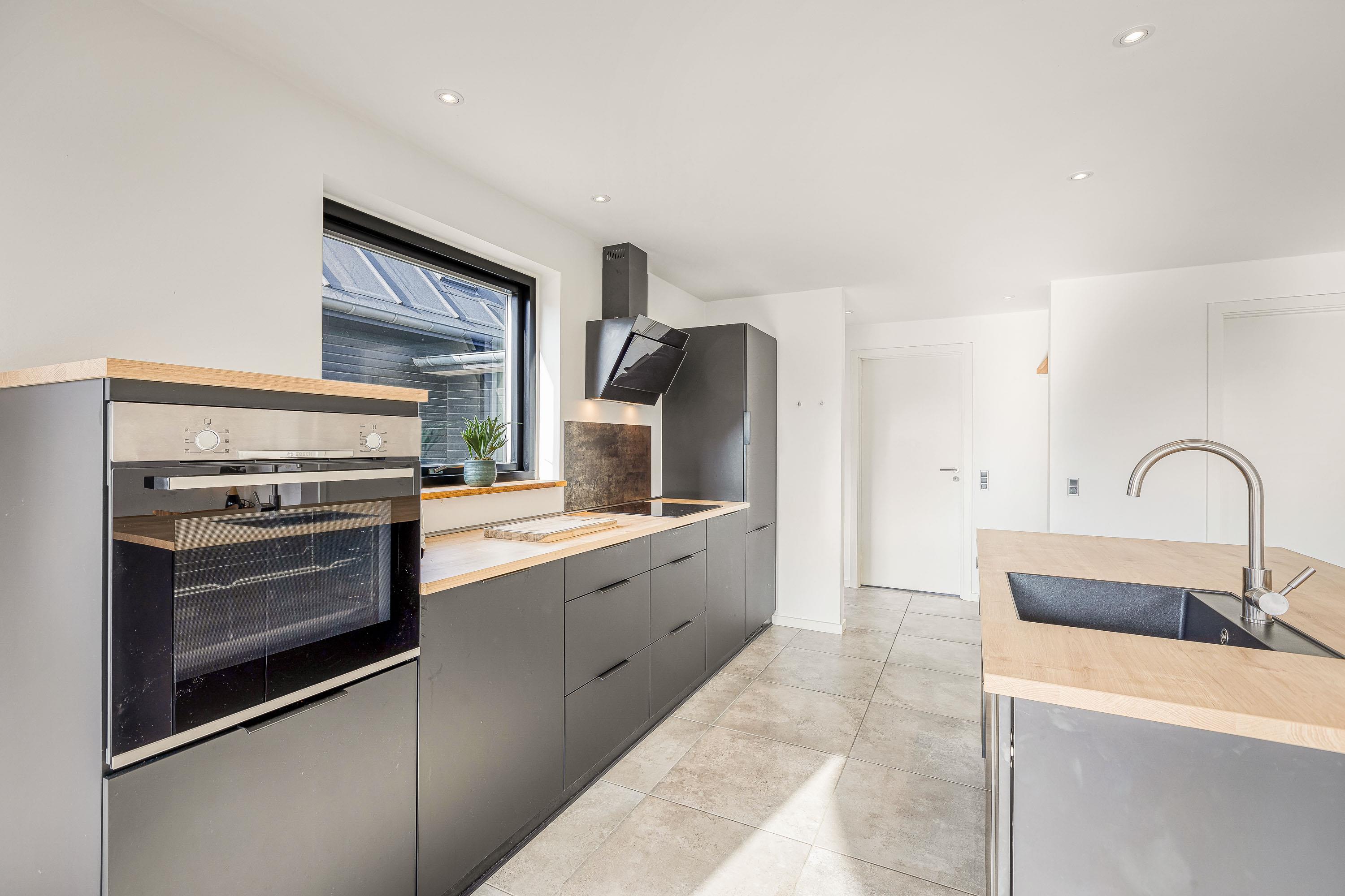 This summer house is arranged over two floors. On the ground floor, you'll find the open-plan kitchen and dining area. The modern, well-equipped kitchen offers plenty of opportunities to try Scandinavian recipes. The kitchen island is perfect for gathering around, making it ideal for sociable cooking evenings. The spacious dining table provides ample room for family game nights.