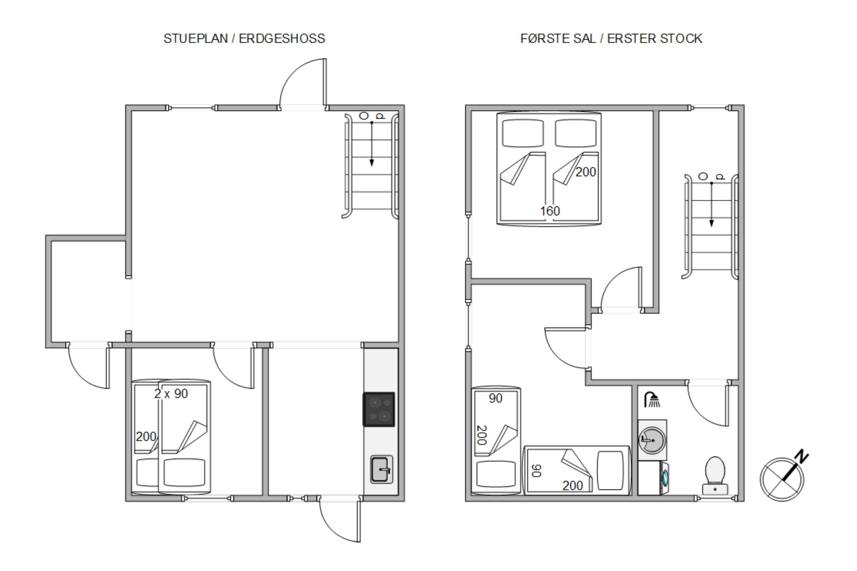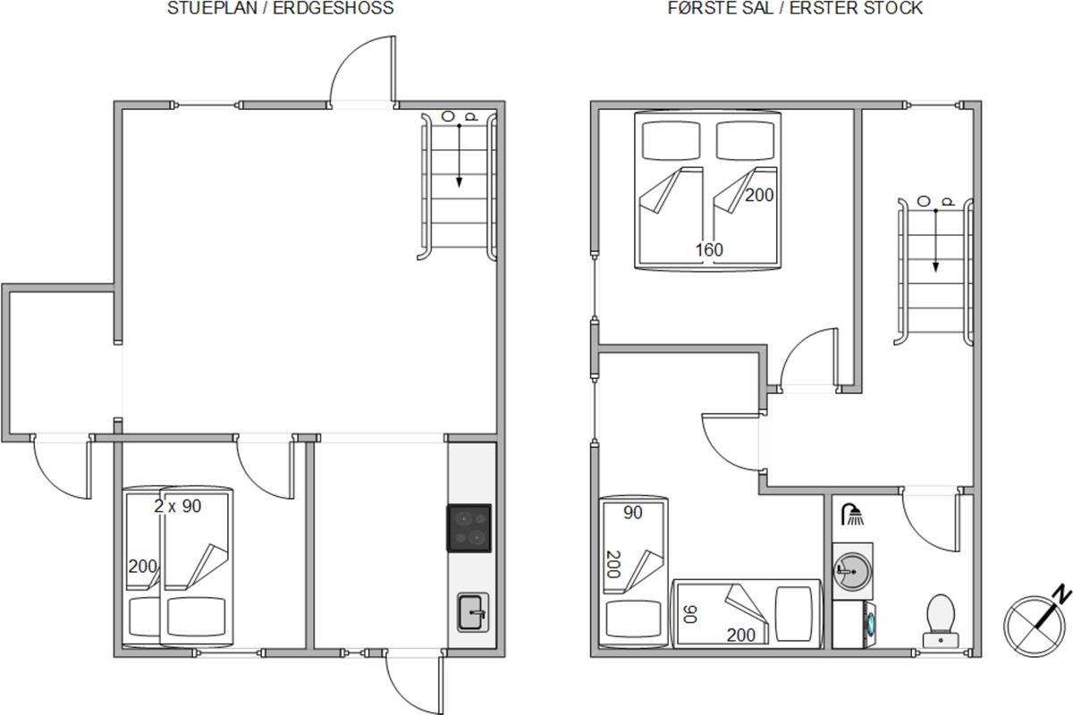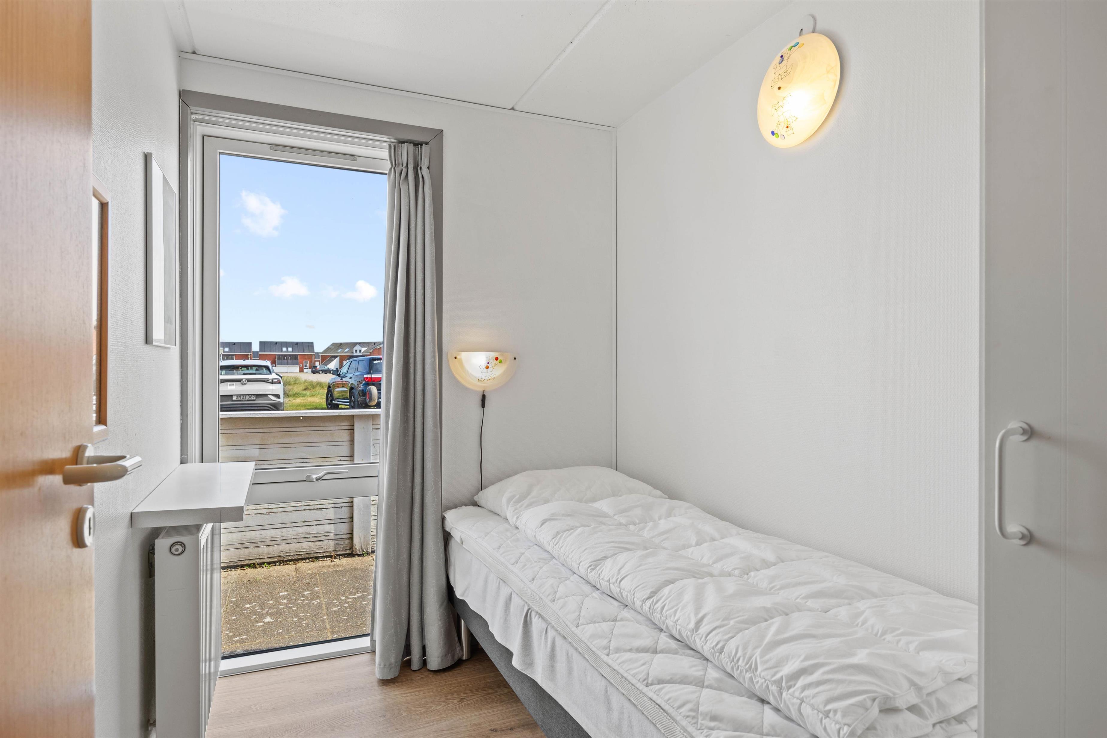 The open-plan living area shares space with the dining room and kitchen. The living room offers direct access to the partially fenced terrace, providing lovely views of the natural surroundings.A large sofa provides plenty of space for the whole family, while the entire floor benefits from abundant natural light and features well-maintained laminate flooring. Both German and Danish TV channels are available, and there's also a DVD player.The open-plan kitchen is fully equipped for preparing delicious meals. Along with the fridge and oven, you'll find a microwave, freezer and dishwasher to handle the washing up after breakfast and dinner.On the ground floor, you'll find one of the three bedrooms. This is ideal for younger guests, featuring bunk beds (2x 90cm x 200cm). A large window offers views of the grounds.Upstairs are two more bedrooms with comfortable beds and carpeted floors. One features a double bed (160cm x 200cm) and the other has two single beds (2x 90cm x 200cm). Next door is the bathroom with shower, washing machine and practical tiled floor.