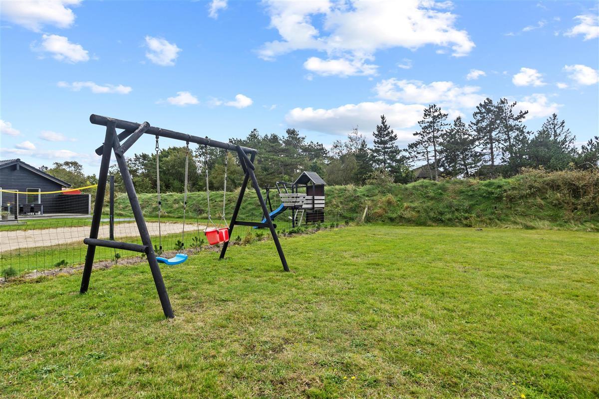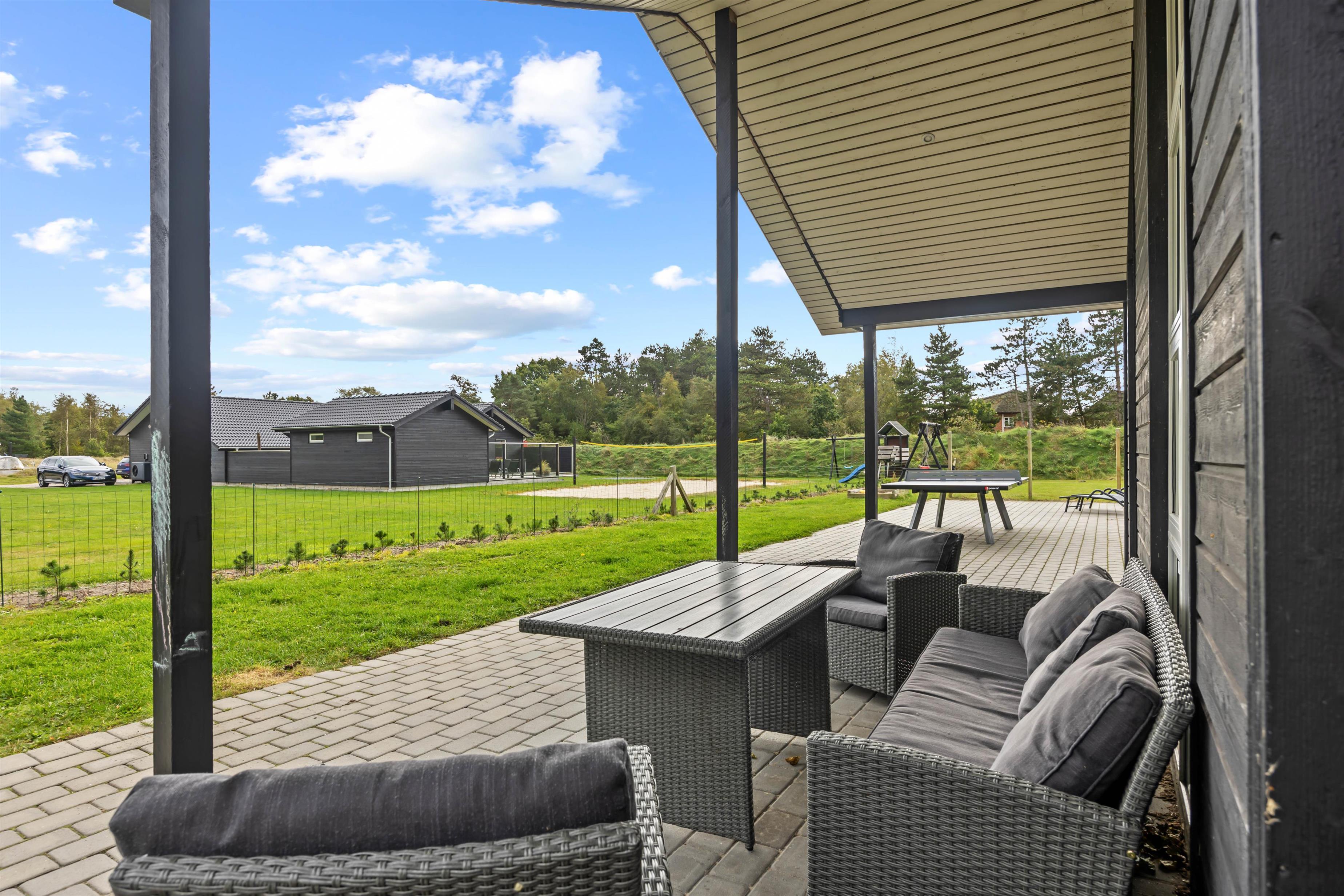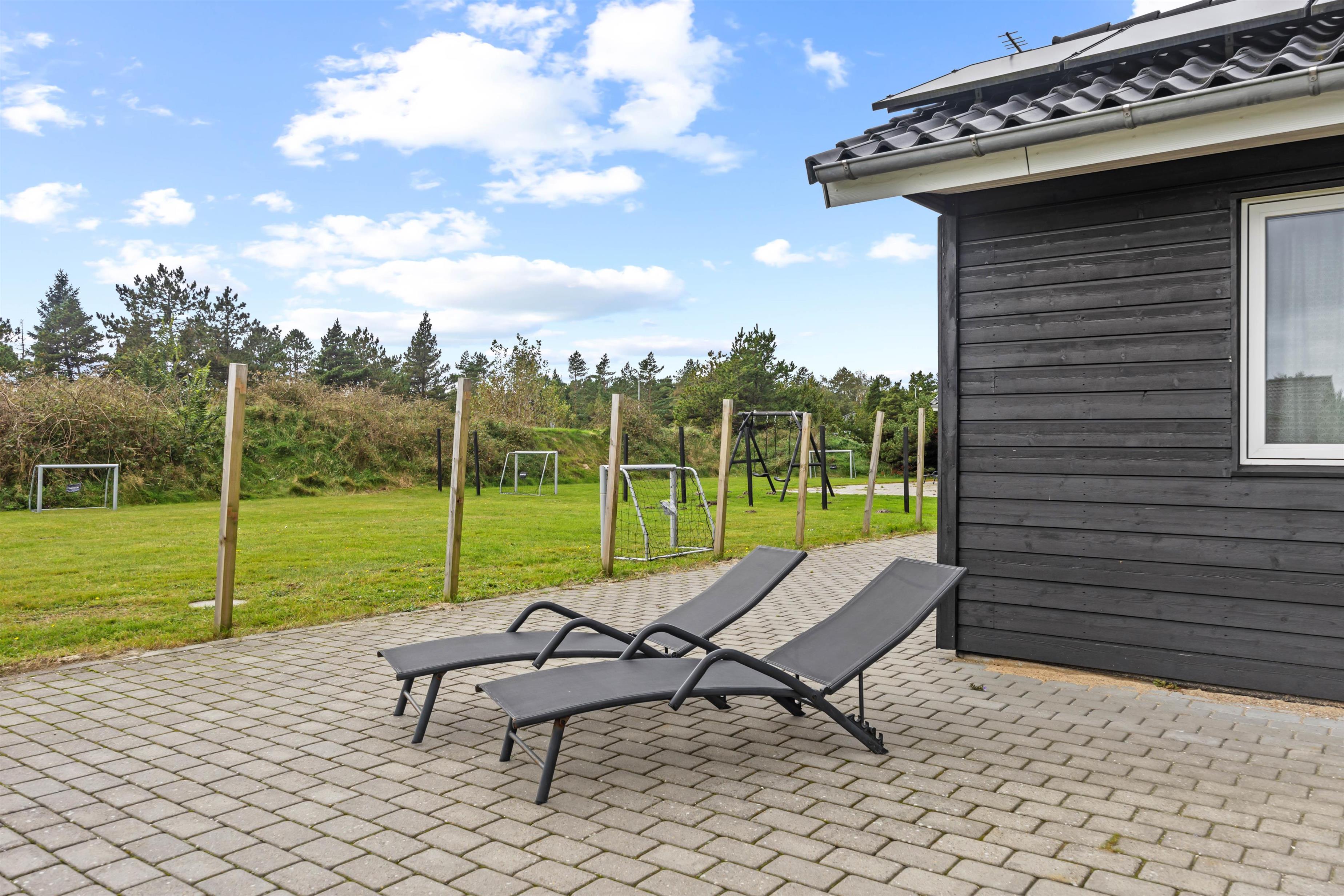 Das Ferienhaus liegt auf einem 1400m² großen Naturgrundstück, das reichlich Platz für Outdoor-Aktivitäten bietet. Eine Schaukel und ein Sandkasten sorgen für strahlende Kinderaugen, während ihr euch auf der offenen oder überdachten Terrasse entspannen könnt. Die Gartenmöbel laden zu einem gemeinsamen Grillabend unter freiem Himmel ein. Für Einkäufe müsst ihr kaum 500 Meter zurücklegen, sodass ihr jederzeit spontan für Nachschub sorgen könnt. Zum Badestrand sind es nur 2,5 Km Luftlinje - ideal für spontane Ausflüge ans Meer. Es gibt im Garten außerdem Fußballtore und Boule.