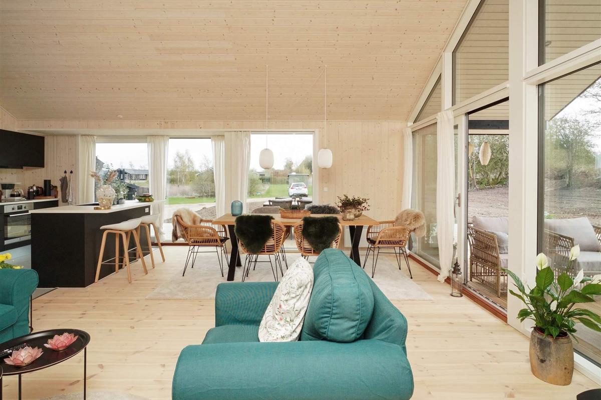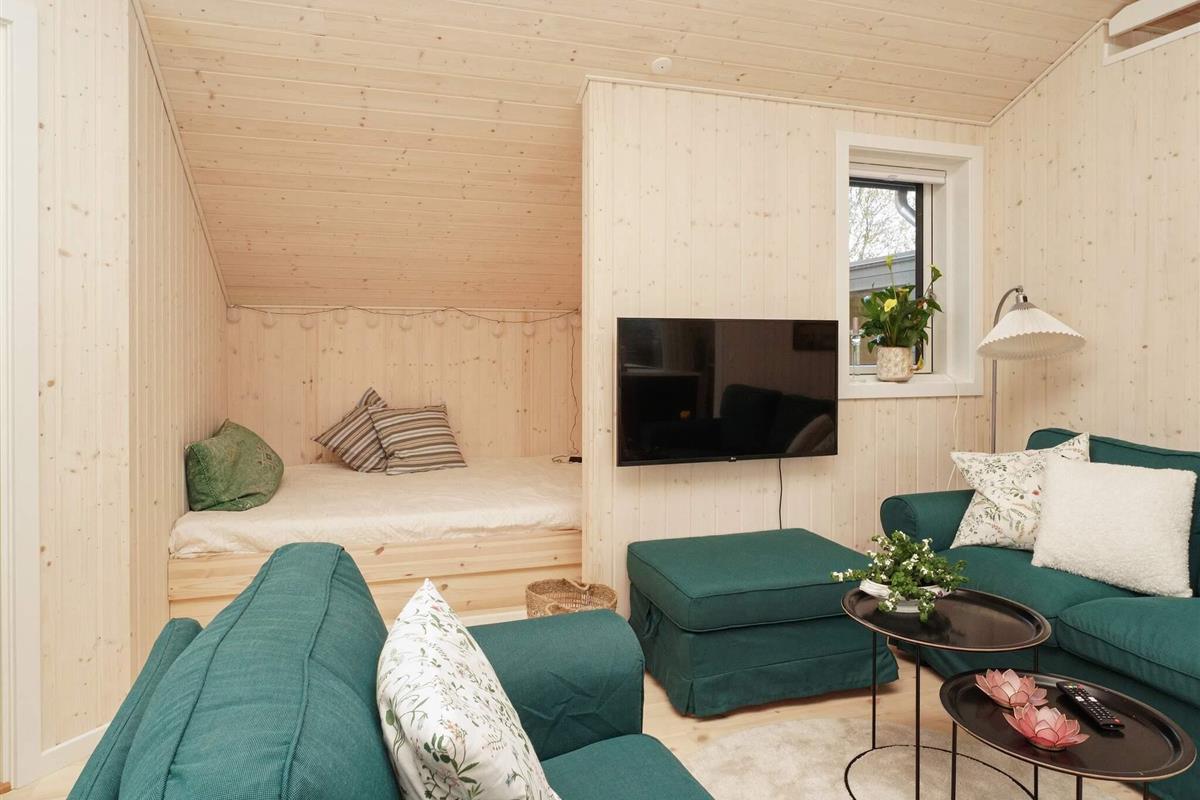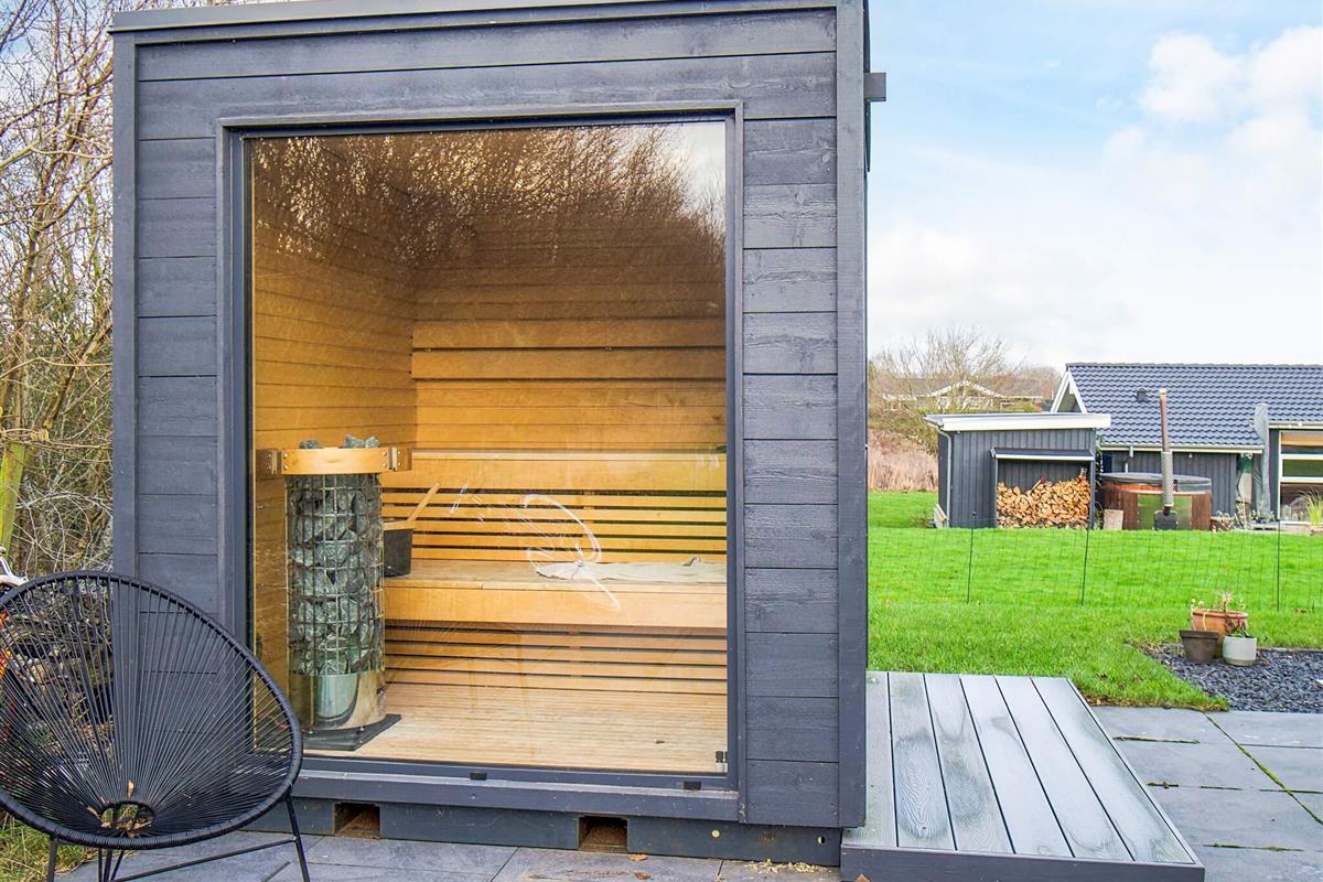 Offene und gut ausgestattete Küche mit Anschluss an den Essbereich. Wohnzimmer mit Alkoven und Zugang zum Schlafzimmer mit Doppelbett. Das Wohnzimmer verfügt über einen Fernseher, mit dem Sie Ihre eigenen TV-Anbieter über den Internetanschluss des Hauses streamen können. Die großen Fenster und Schiebetüren lassen viel Licht ins Wohnzimmer. Davor befindet sich eine 13 m² große, überdachte Terrasse mit Liegestühlen. Von der Küche aus haben Sie außerdem Zugang zur offenen Terrasse mit Gartenmöbeln, Sonnenliegen und einem Gasgrill. Ungestört von den Nachbarn können Sie in Ruhe die Außensauna genießen, während die Kinder auf dem Gartentrampolin toben (Benutzung auf eigene Gefahr).