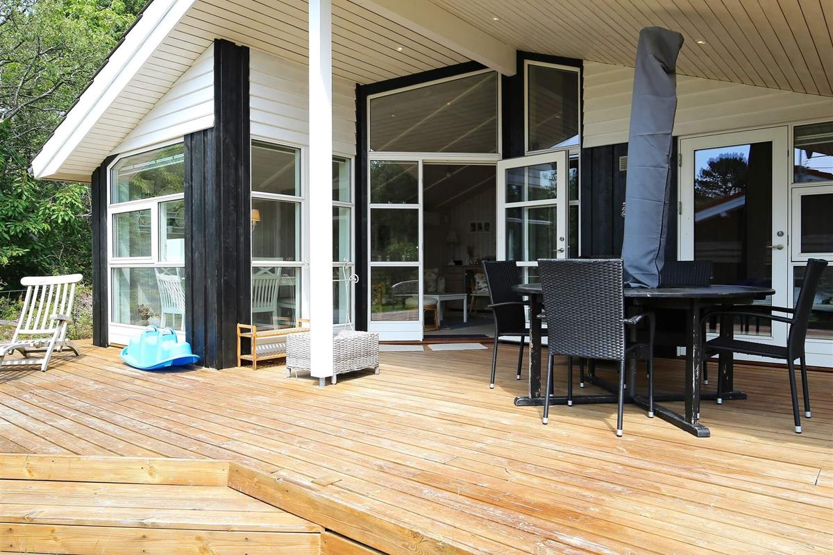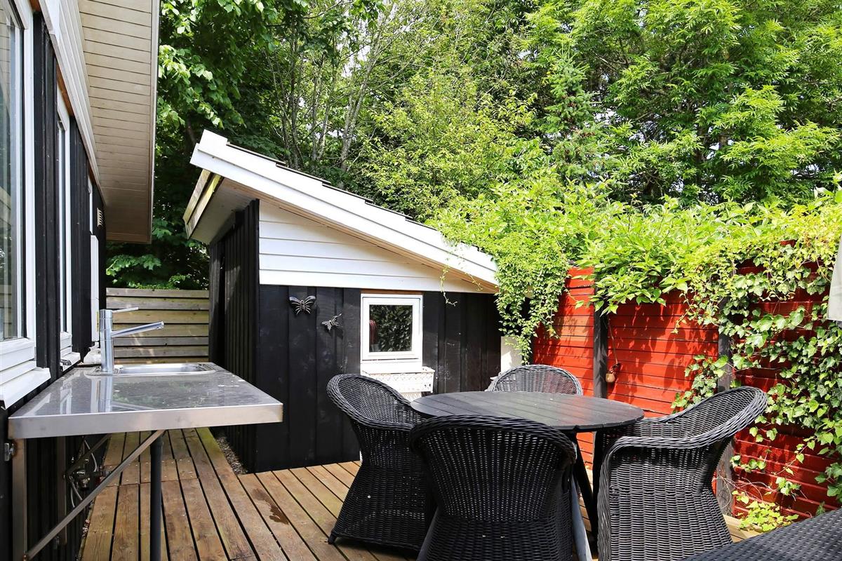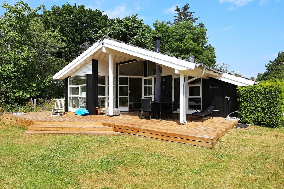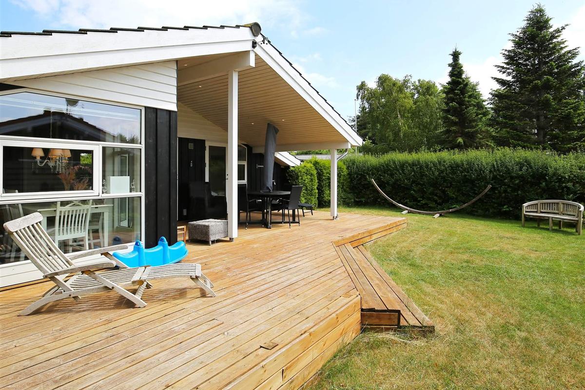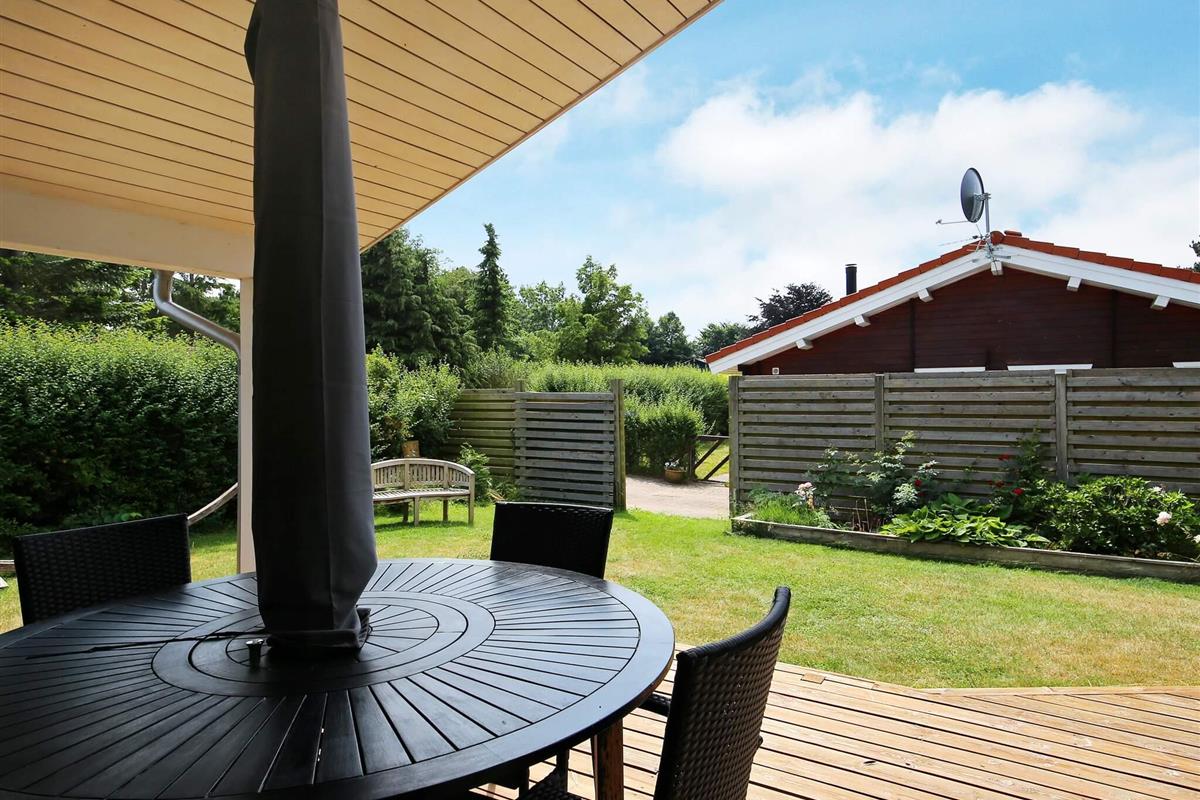 Die Holzterrasse vor dem Wohnbereich ist teilweise überdacht und durch zwei Treppenstufen vom Niveau des Rasengrundstücks leicht angehoben. Eine Hecke schützt gut vor Wind und neugierigen Blicken. Küste und Meer liegen unweit.