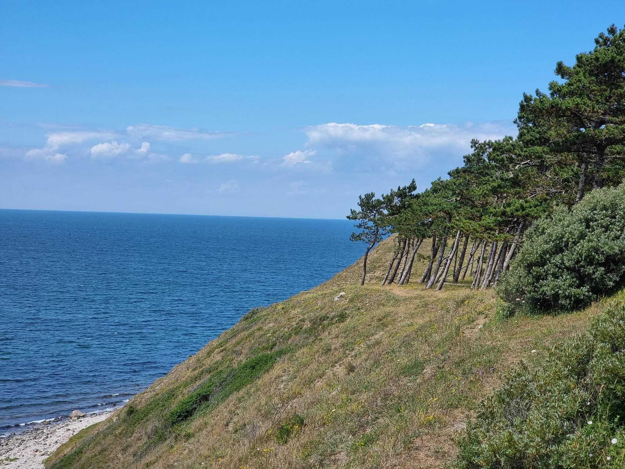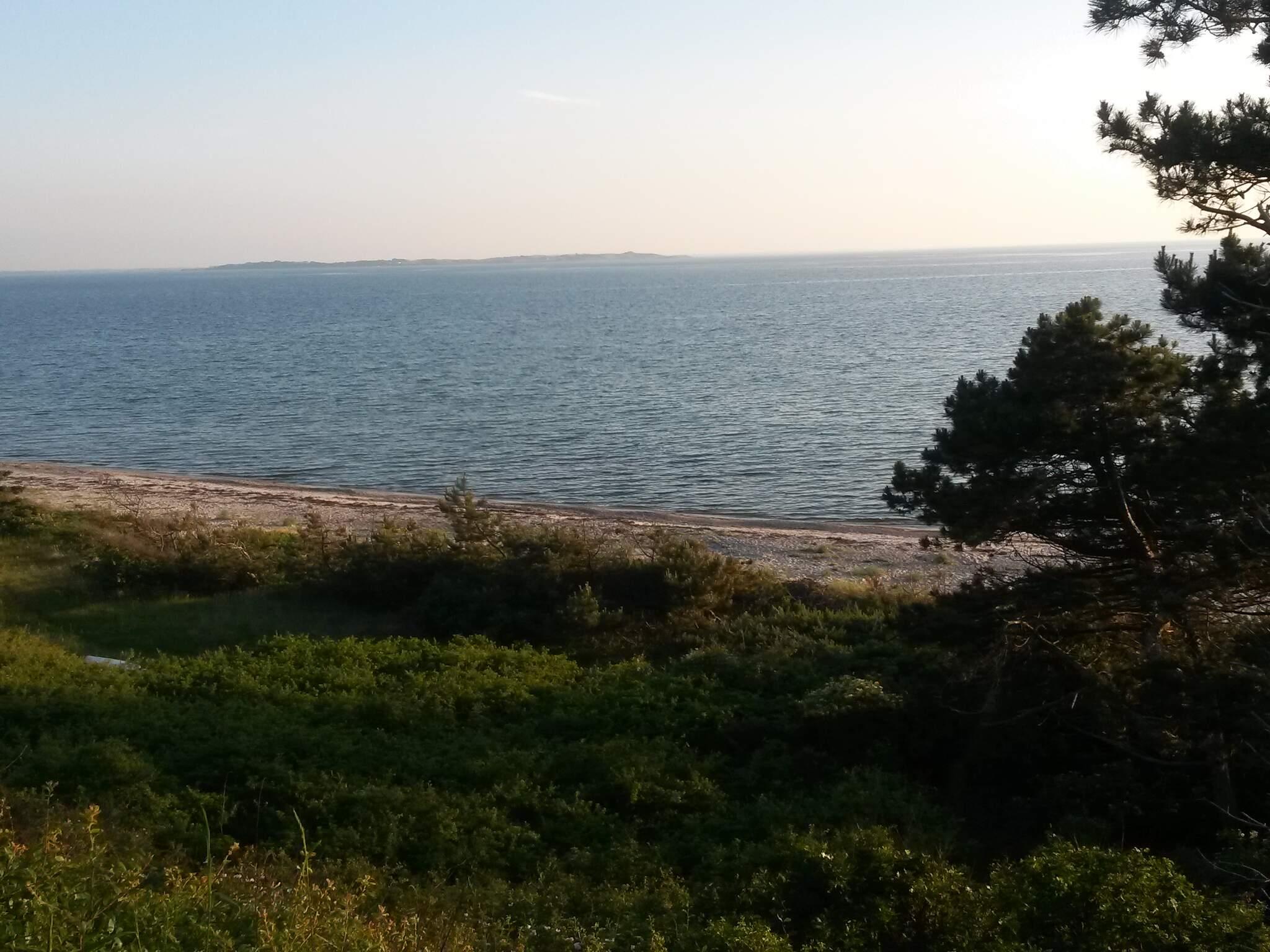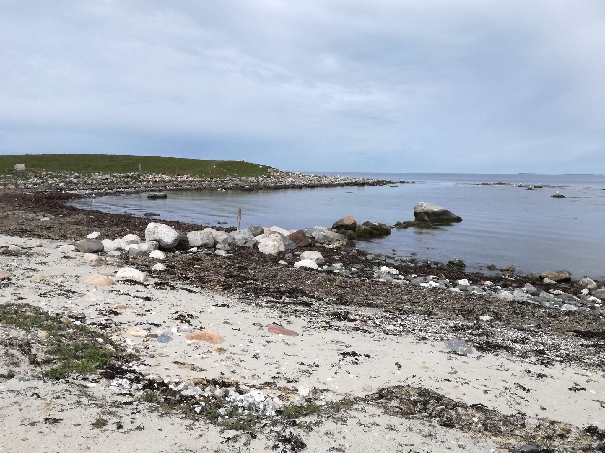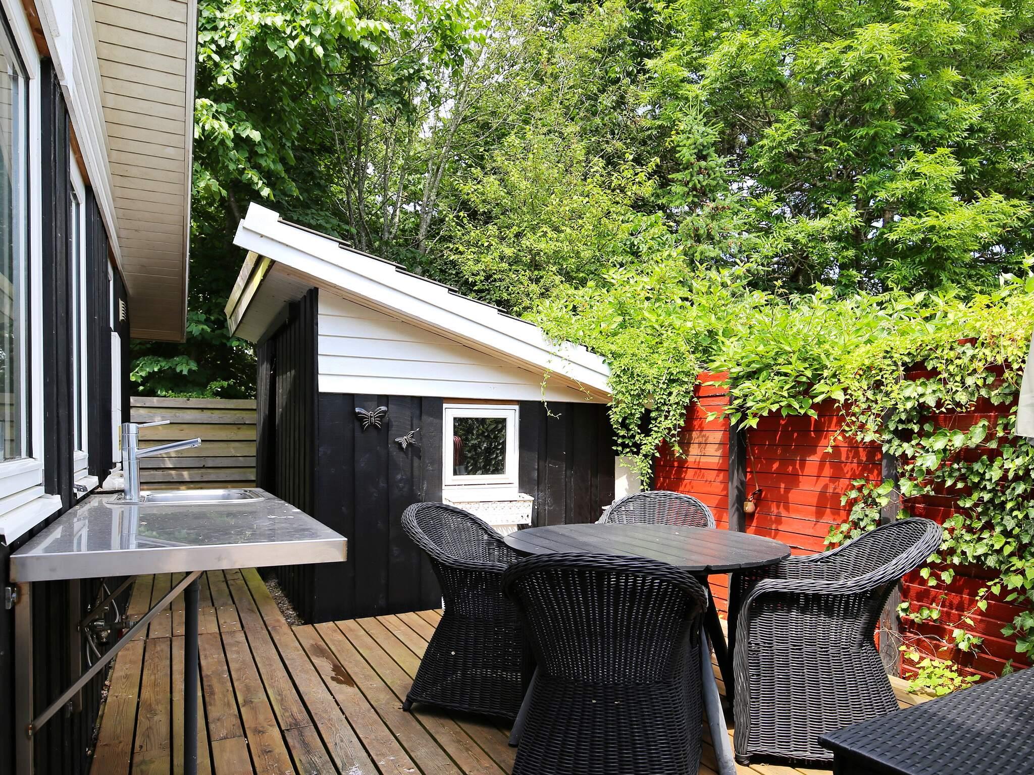 Die Holzterrasse vor dem Wohnbereich ist teilweise überdacht und durch zwei Treppenstufen vom Niveau des Rasengrundstücks leicht angehoben. Eine Hecke schützt gut vor Wind und neugierigen Blicken. Küste und Meer liegen unweit.