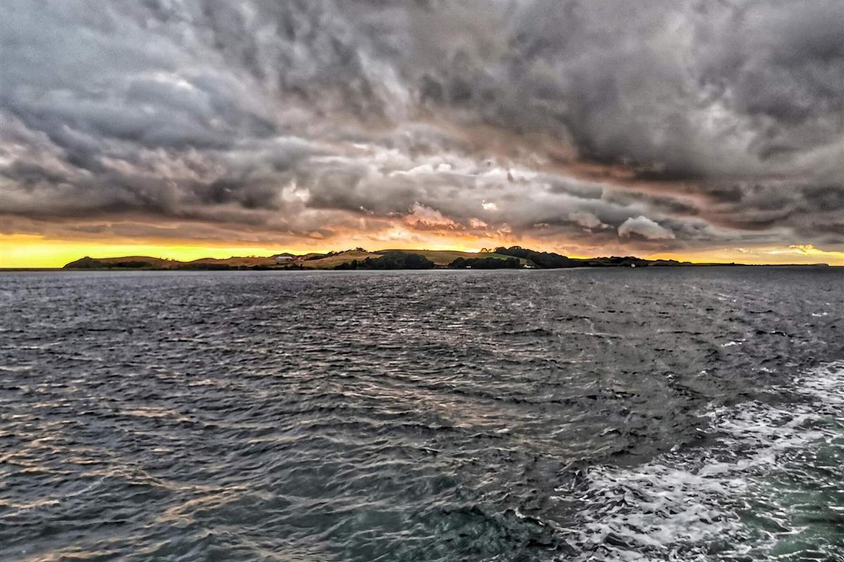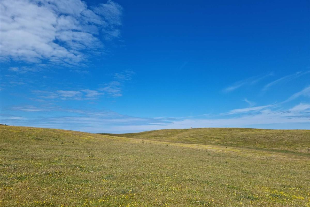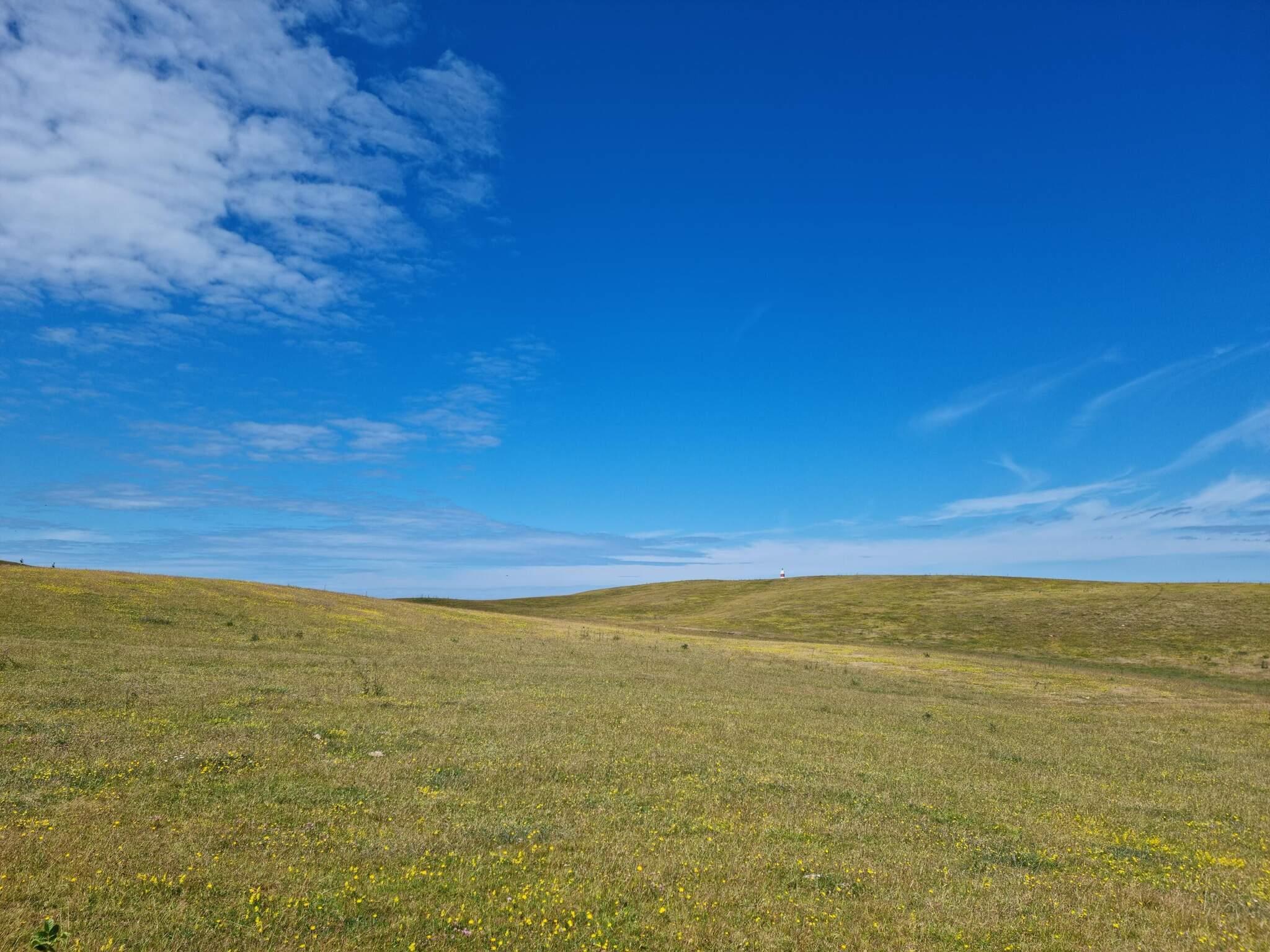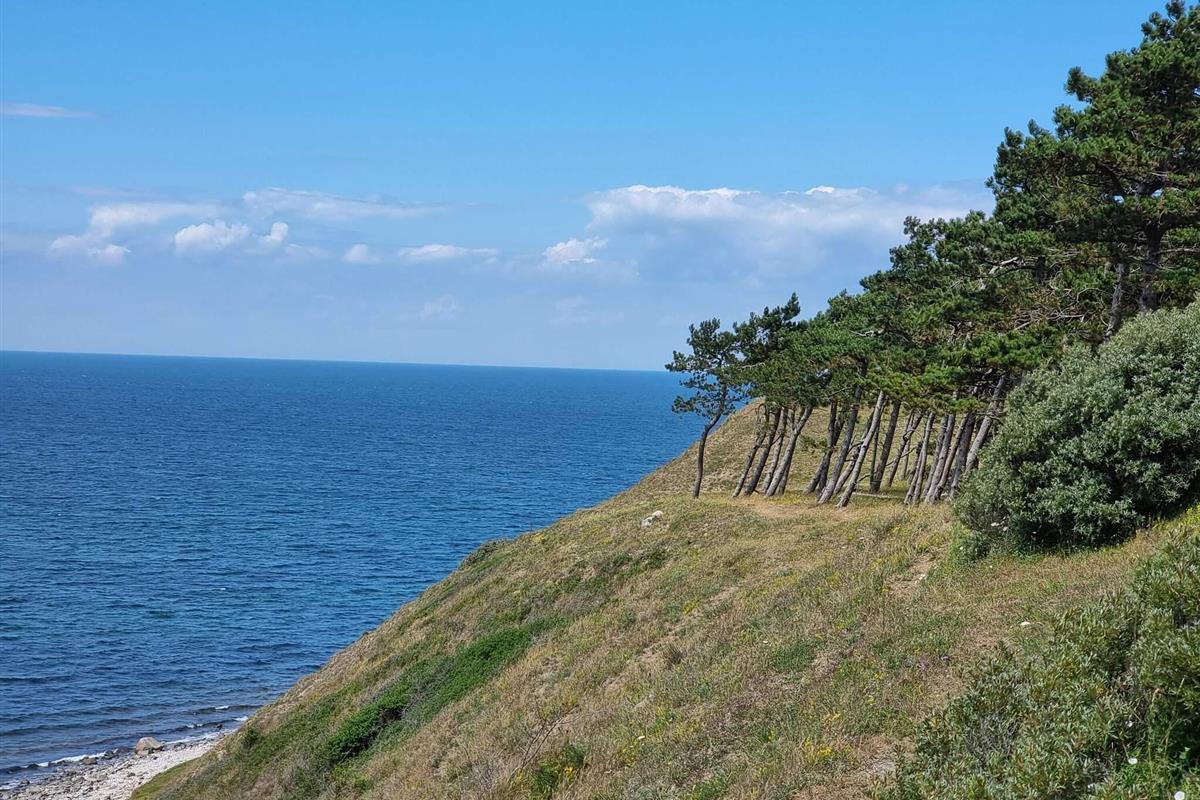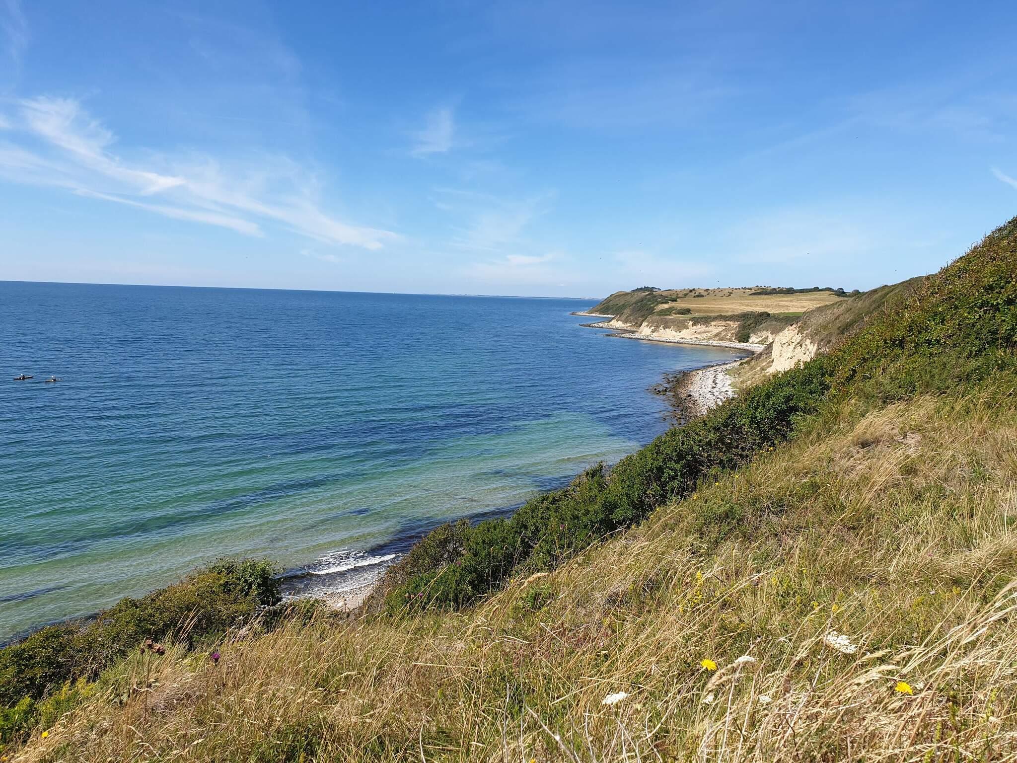 Die Holzterrasse vor dem Wohnbereich ist teilweise überdacht und durch zwei Treppenstufen vom Niveau des Rasengrundstücks leicht angehoben. Eine Hecke schützt gut vor Wind und neugierigen Blicken. Küste und Meer liegen unweit.