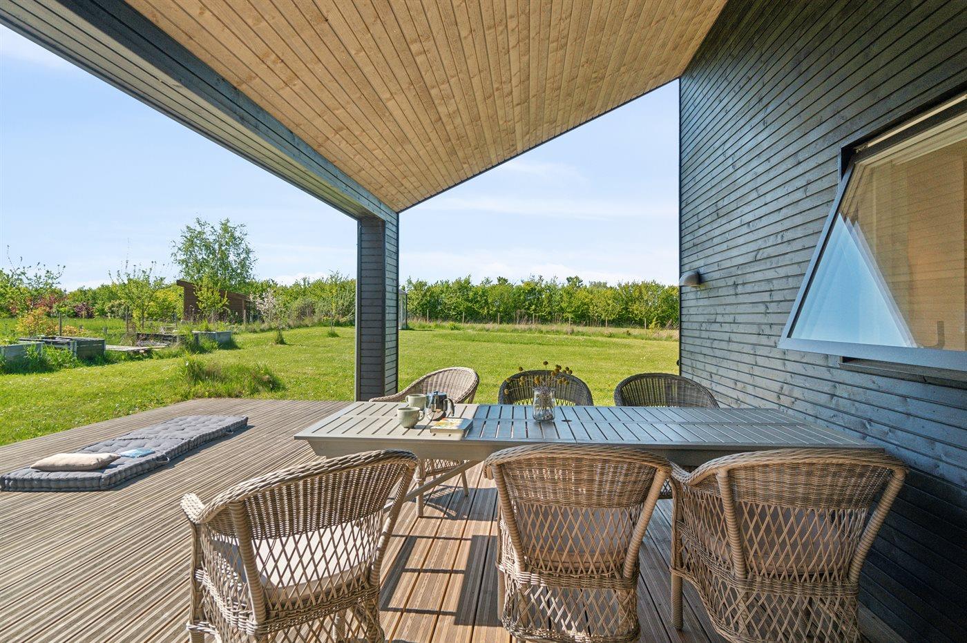 Modern vakantiehuis nabij zee met tuin, terras, warmtepomp en EV-laadpunt.