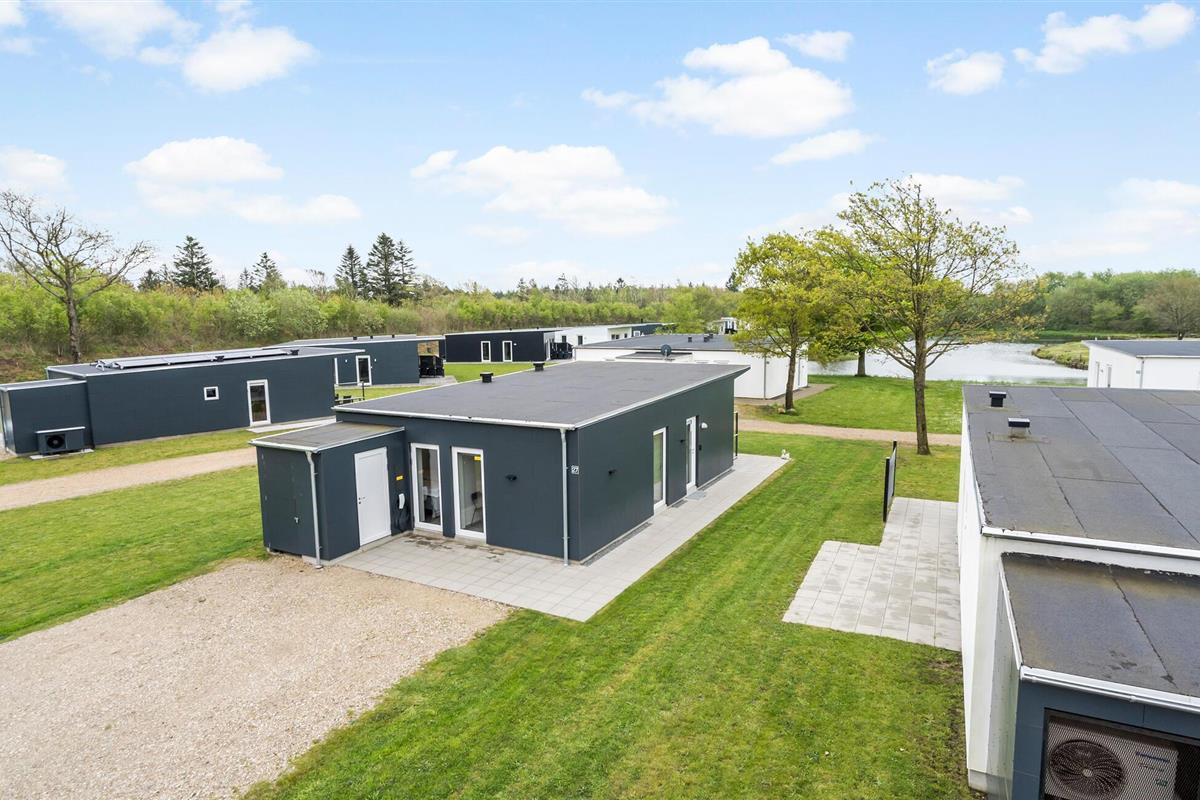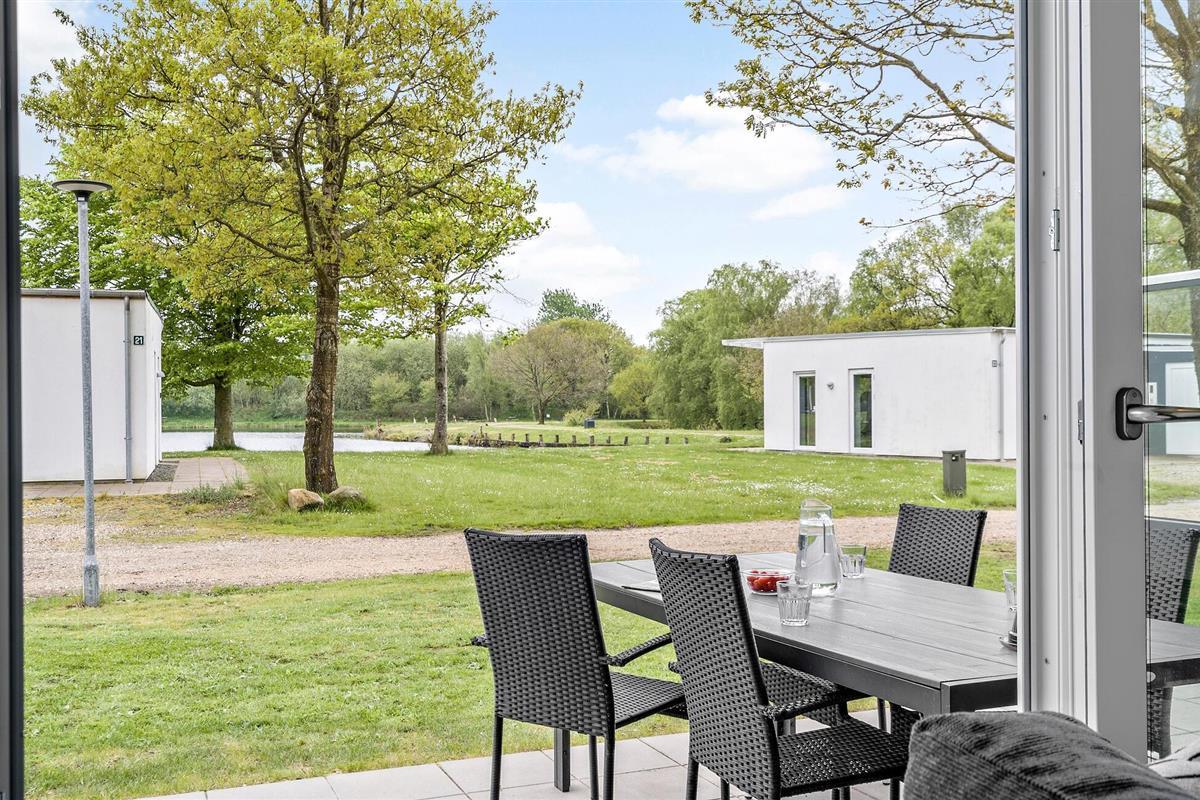 Moderne vakantiewoning nabij Ringkøbing Fjord met uitzicht op vijver en vismogelijkheden.