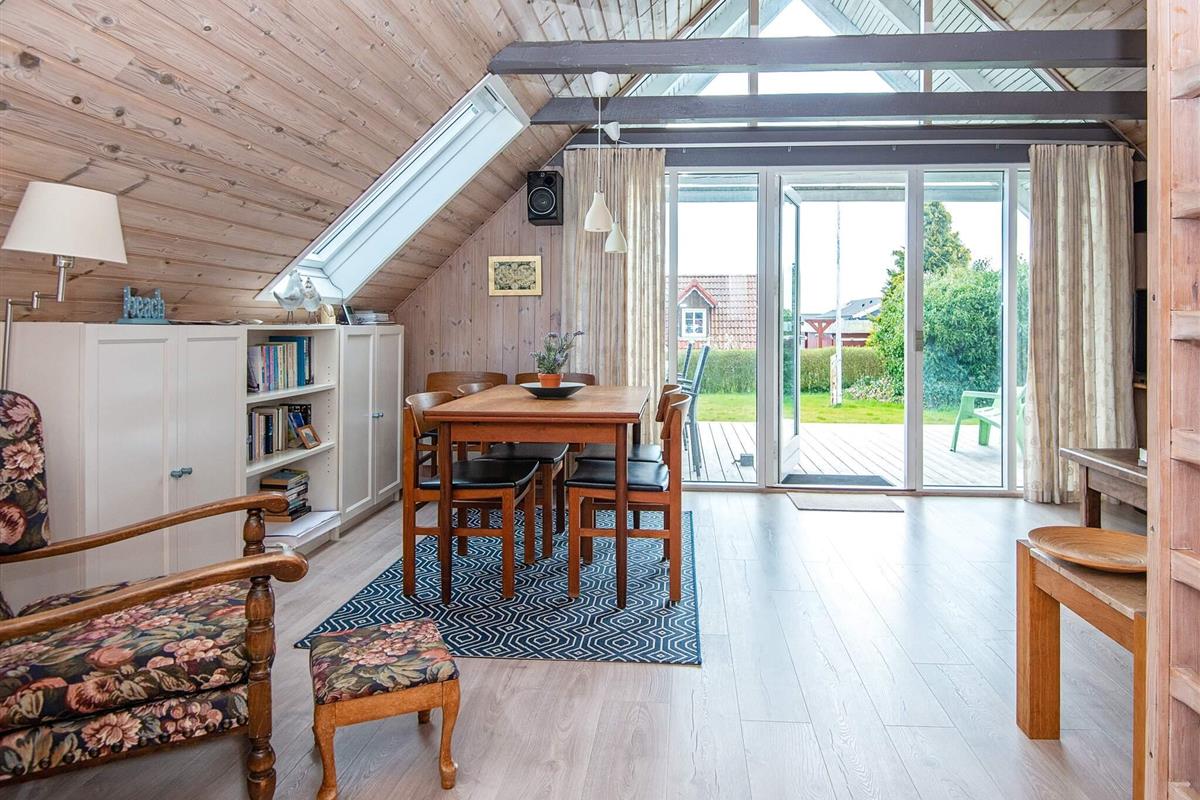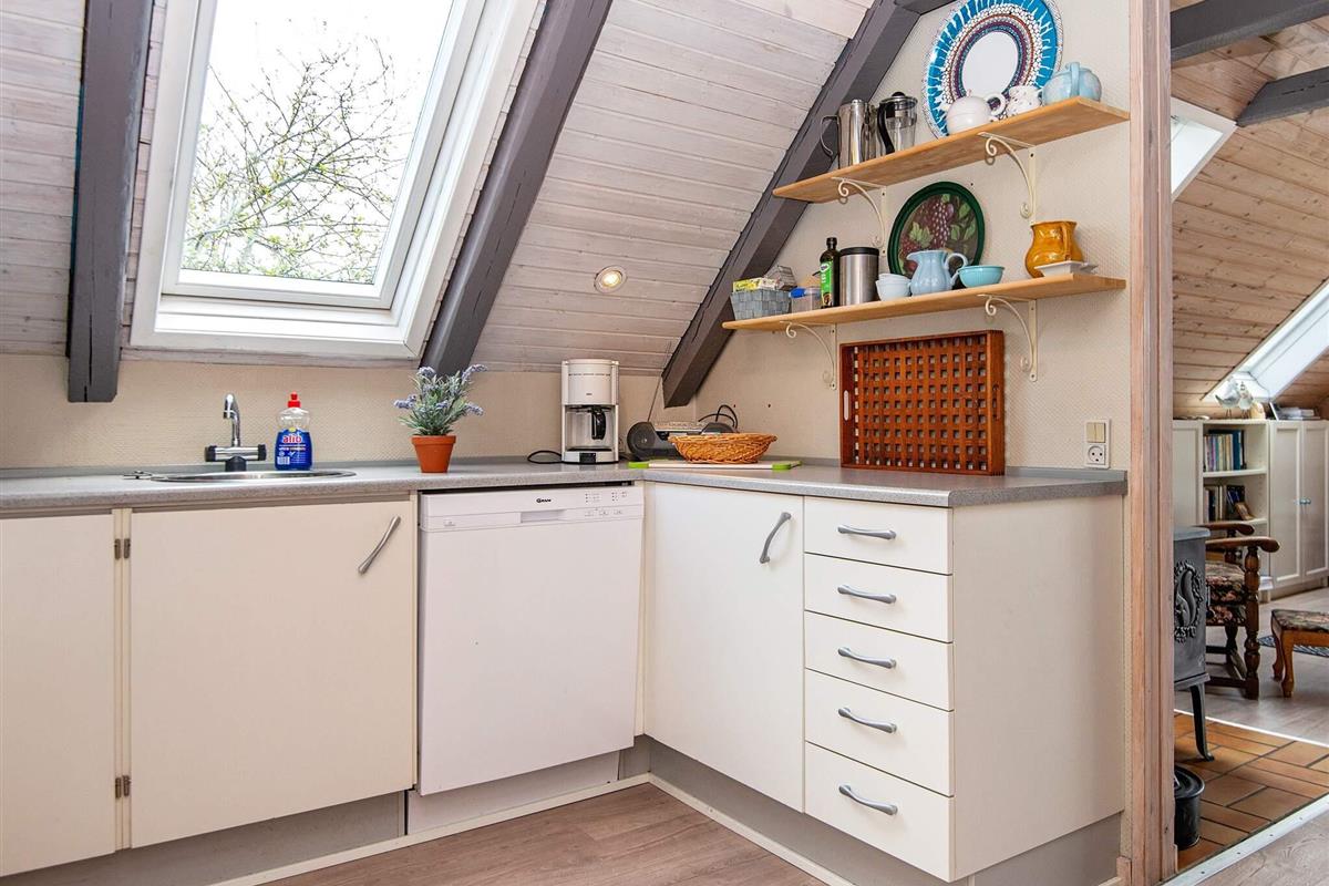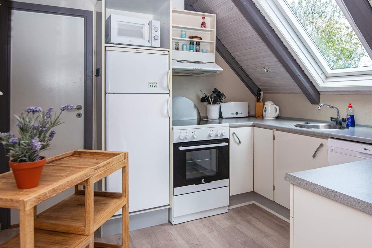 Bei diesem speziellen Ferienhaus reicht das Dach bis fast auf die Erde. Es steht auf einem geschützten, teilweise geschlossenen Gartengrundstück mit guter Rasenfläche. Wohnraum mit Ecksofa und extra Sessel am Holzofen. In offener Verbindung dazu liegt die Küche mit u.a. einer Spülmaschine, einer Mikrowelle und einem kleinen Gefrierplatz.