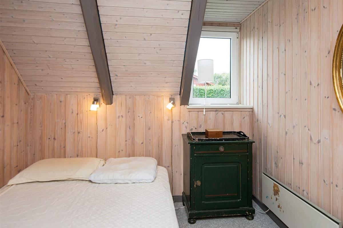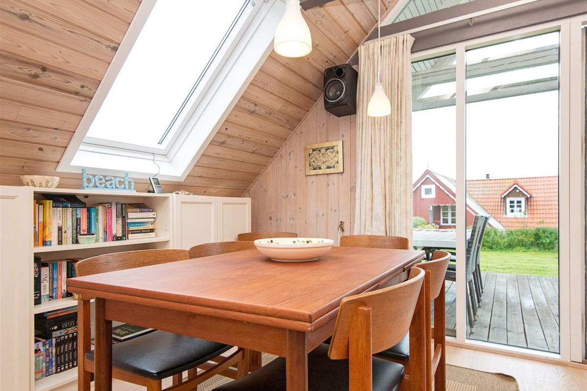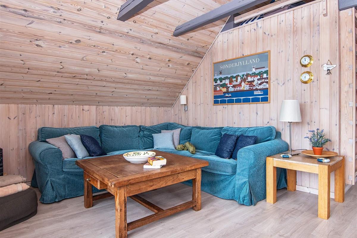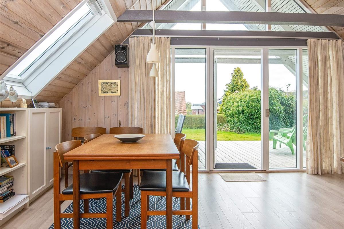 Bei diesem speziellen Ferienhaus reicht das Dach bis fast auf die Erde. Es steht auf einem geschützten, teilweise geschlossenen Gartengrundstück mit guter Rasenfläche. Wohnraum mit Ecksofa und extra Sessel am Holzofen. In offener Verbindung dazu liegt die Küche mit u.a. einer Spülmaschine, einer Mikrowelle und einem kleinen Gefrierplatz.