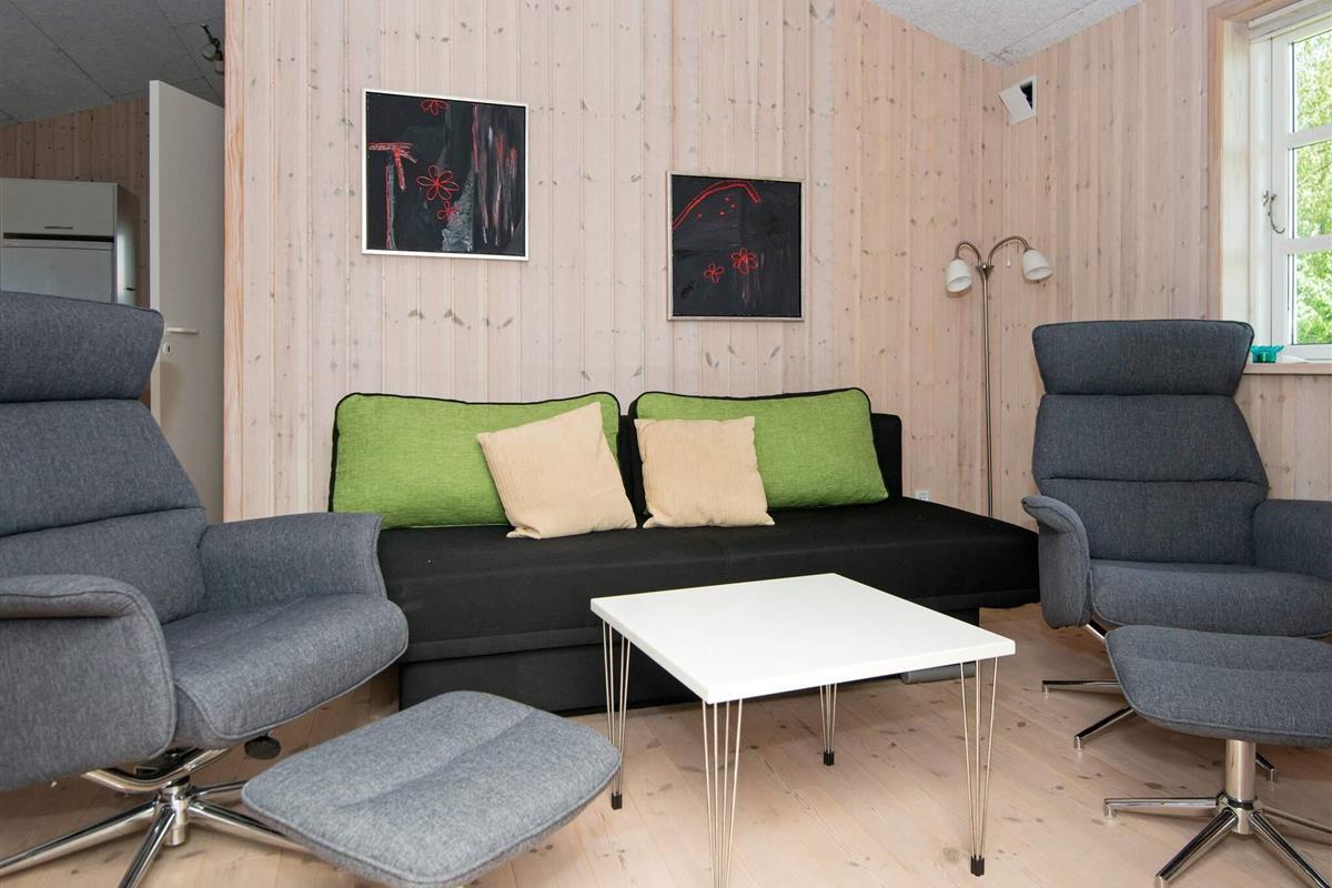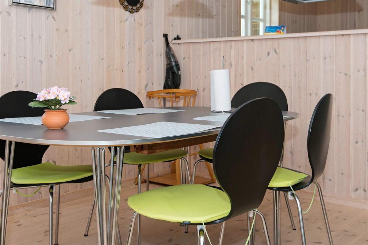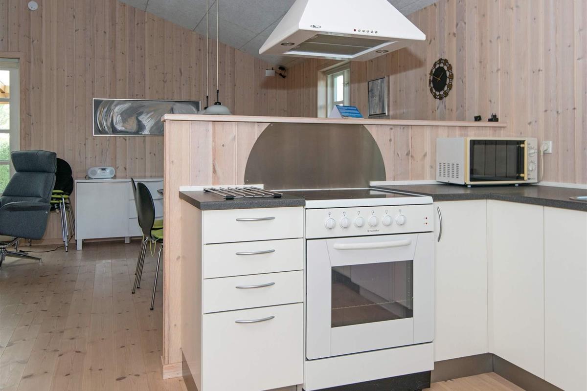 Das Ferienhaus ist innen hell und zweckmäßig ausgestattet. Es gibt zwei Schlafzimmer im Haus mit je einem Doppelbett sowie zwei extra Schlafplätze im offenen Küchen-/Wohnbereich. Bad mit Dusche/WC und Waschmaschine.