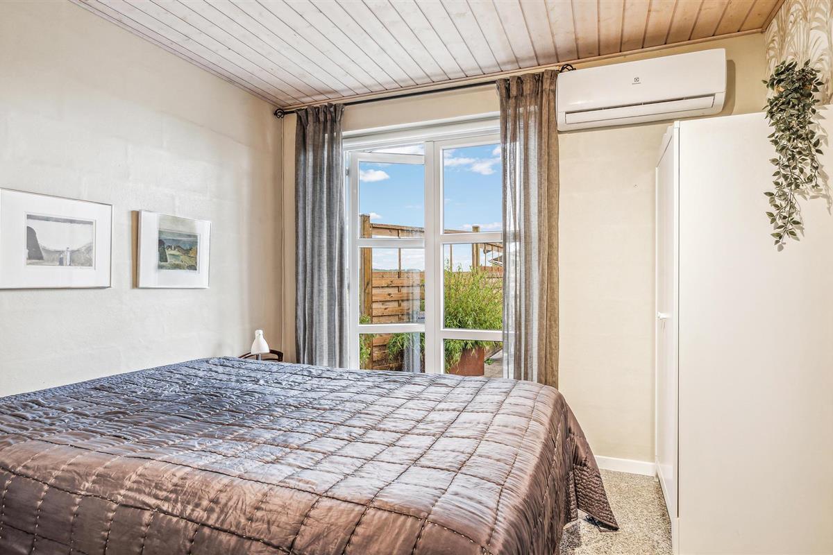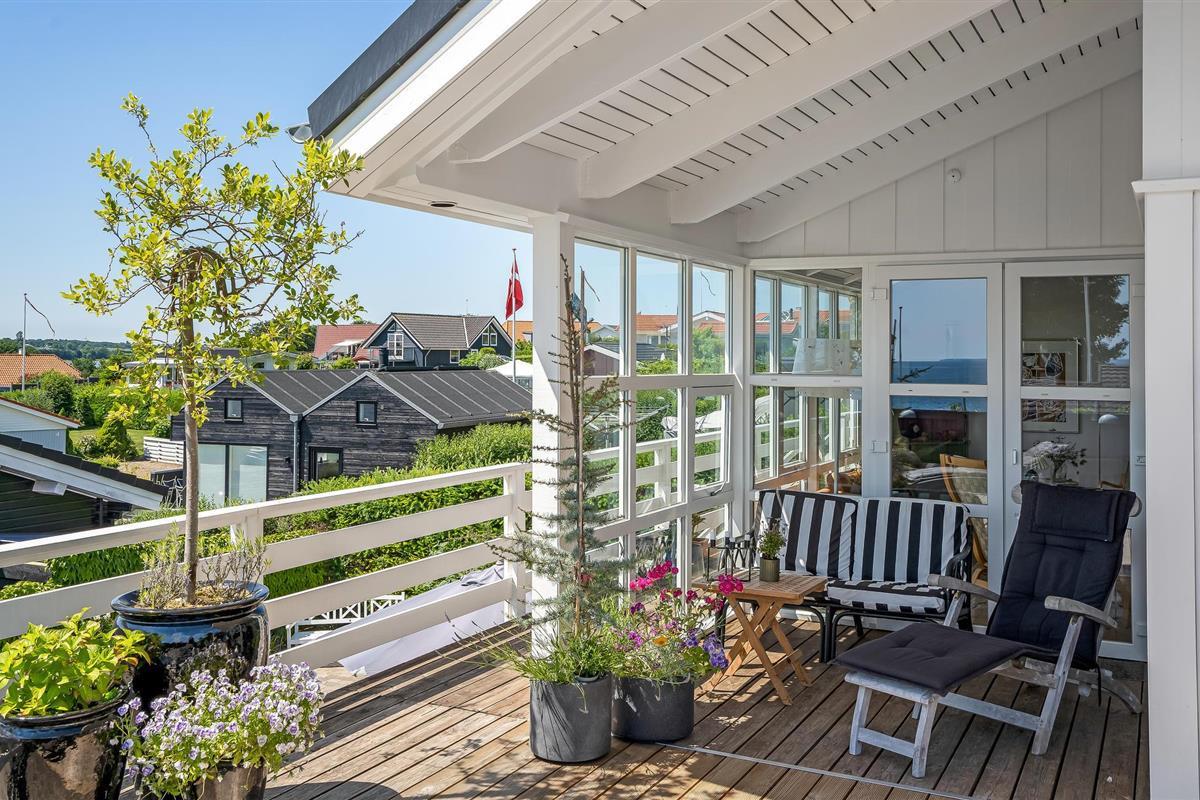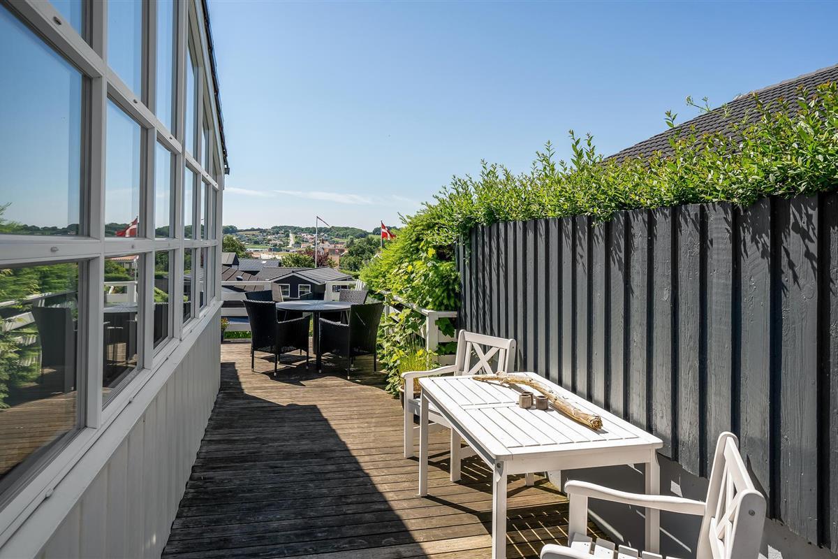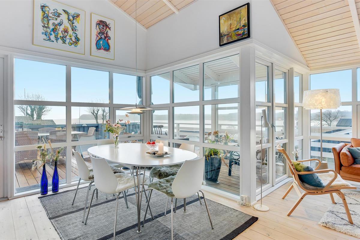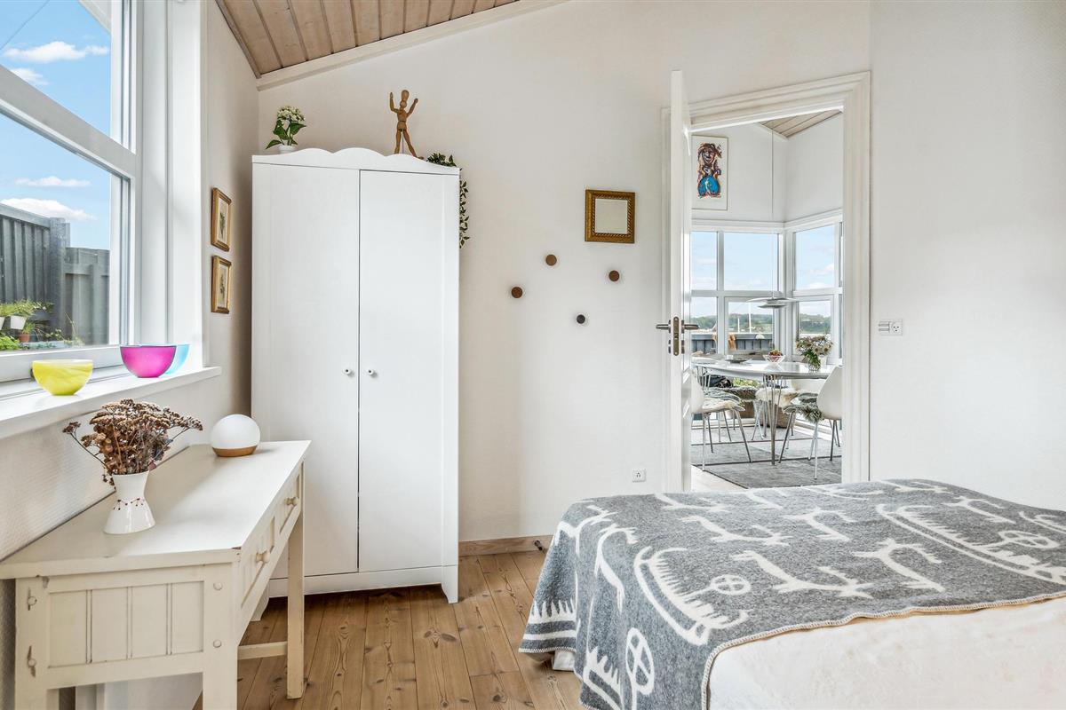 De 1e verdieping is zeer gezellig ingericht met een keuken in open verbinding met de woonkamer en een mooie slaapkamer met eigen toilet. Door de grote panoramische ramen en op het grote, deels overdekte terras heeft u een uniek uitzicht over de Kleine Belt en de haven in Hejlsminde. Op de begane grond zijn er nog 2 slaapkamers en een grote badkamer, waar ook een wastafel is. Er is ook een plek om gevangen vis schoon te maken.