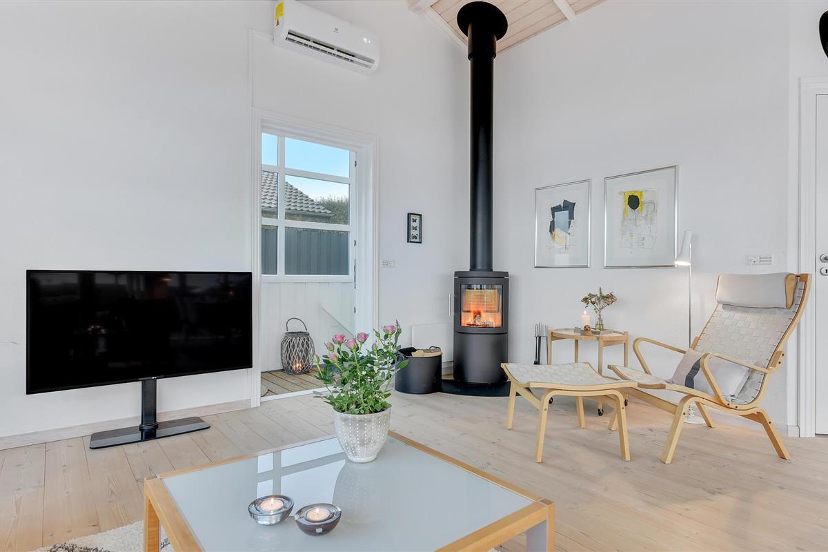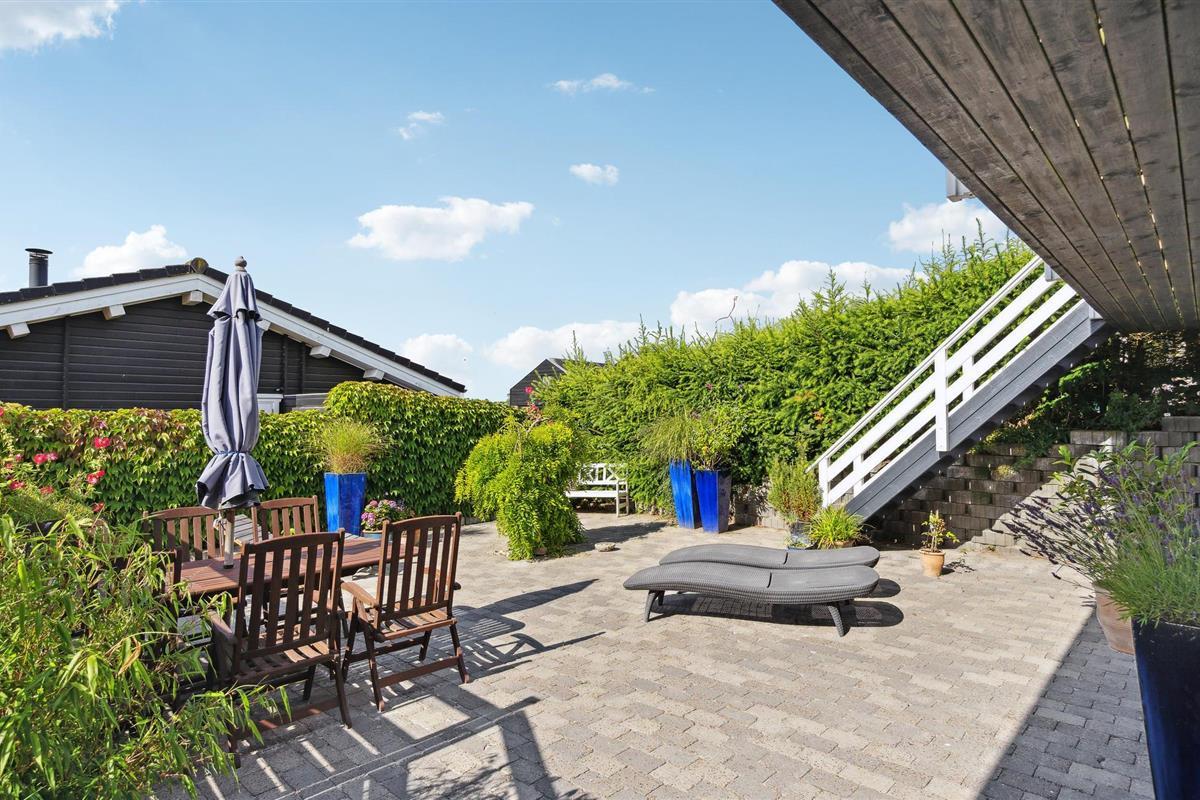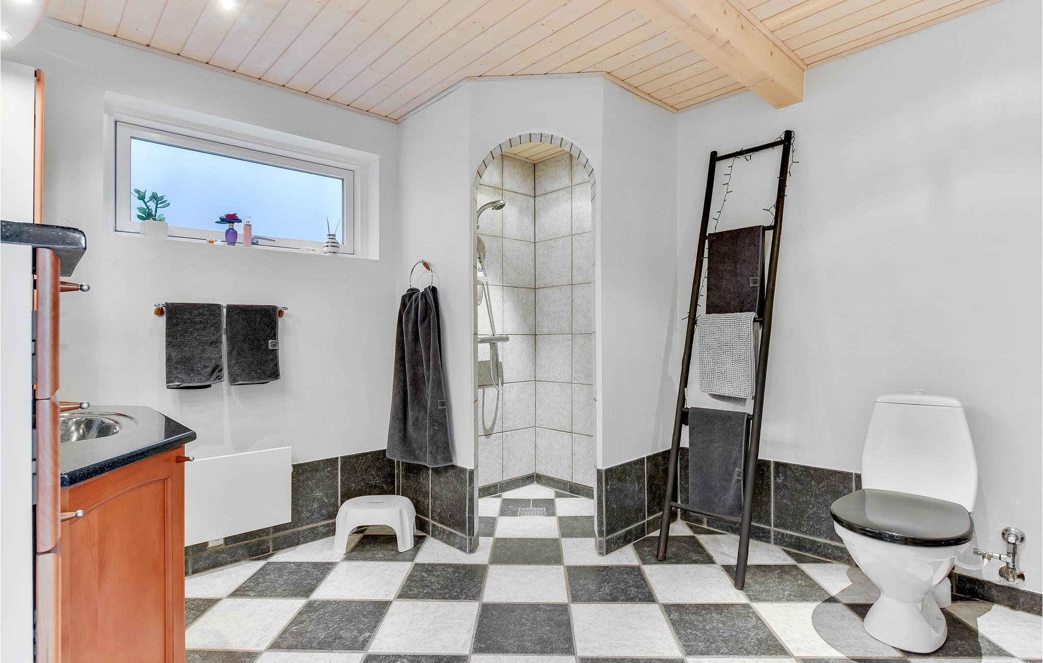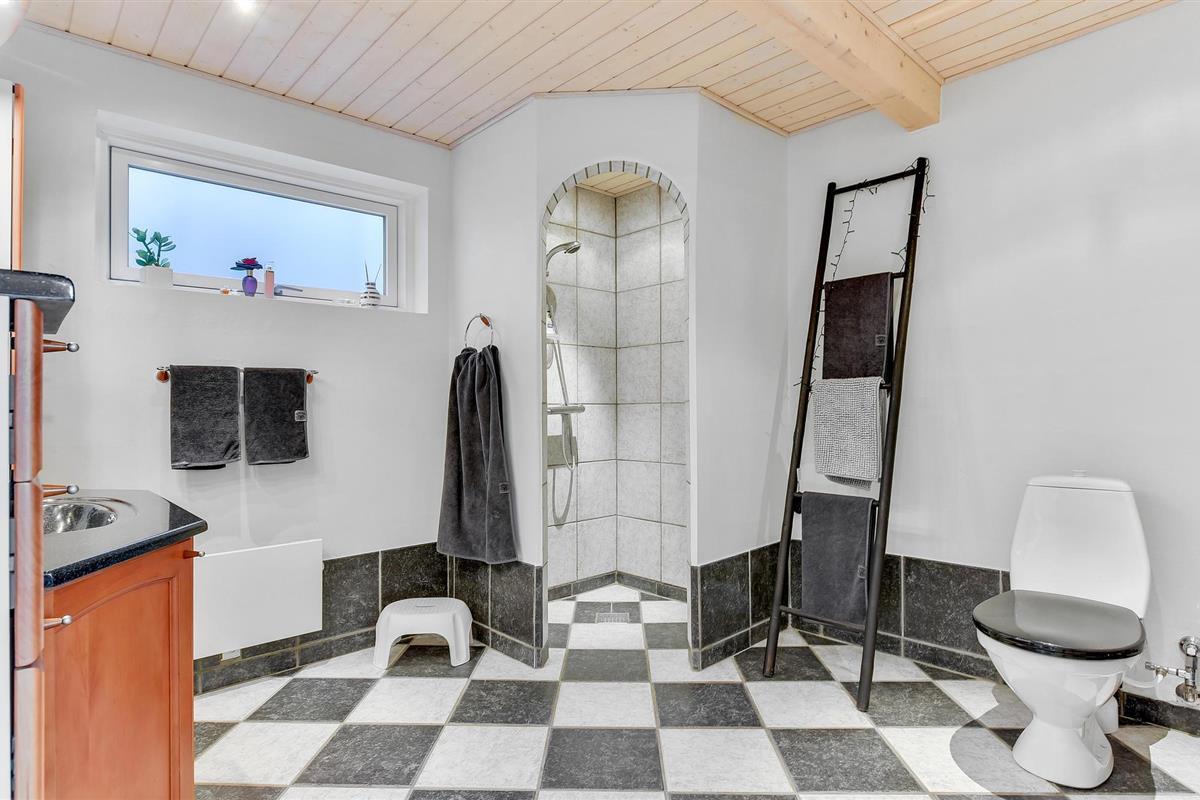 De 1e verdieping is zeer gezellig ingericht met een keuken in open verbinding met de woonkamer en een mooie slaapkamer met eigen toilet. Door de grote panoramische ramen en op het grote, deels overdekte terras heeft u een uniek uitzicht over de Kleine Belt en de haven in Hejlsminde. Op de begane grond zijn er nog 2 slaapkamers en een grote badkamer, waar ook een wastafel is. Er is ook een plek om gevangen vis schoon te maken.
