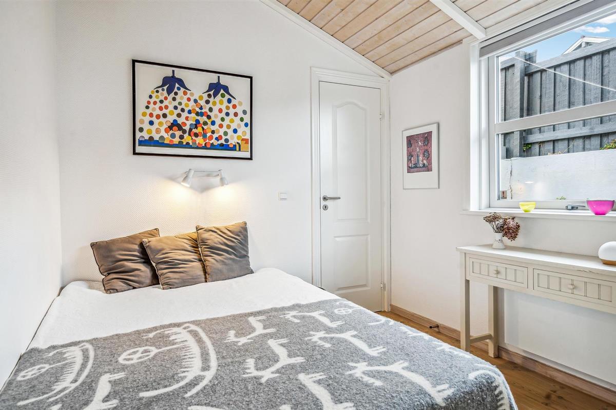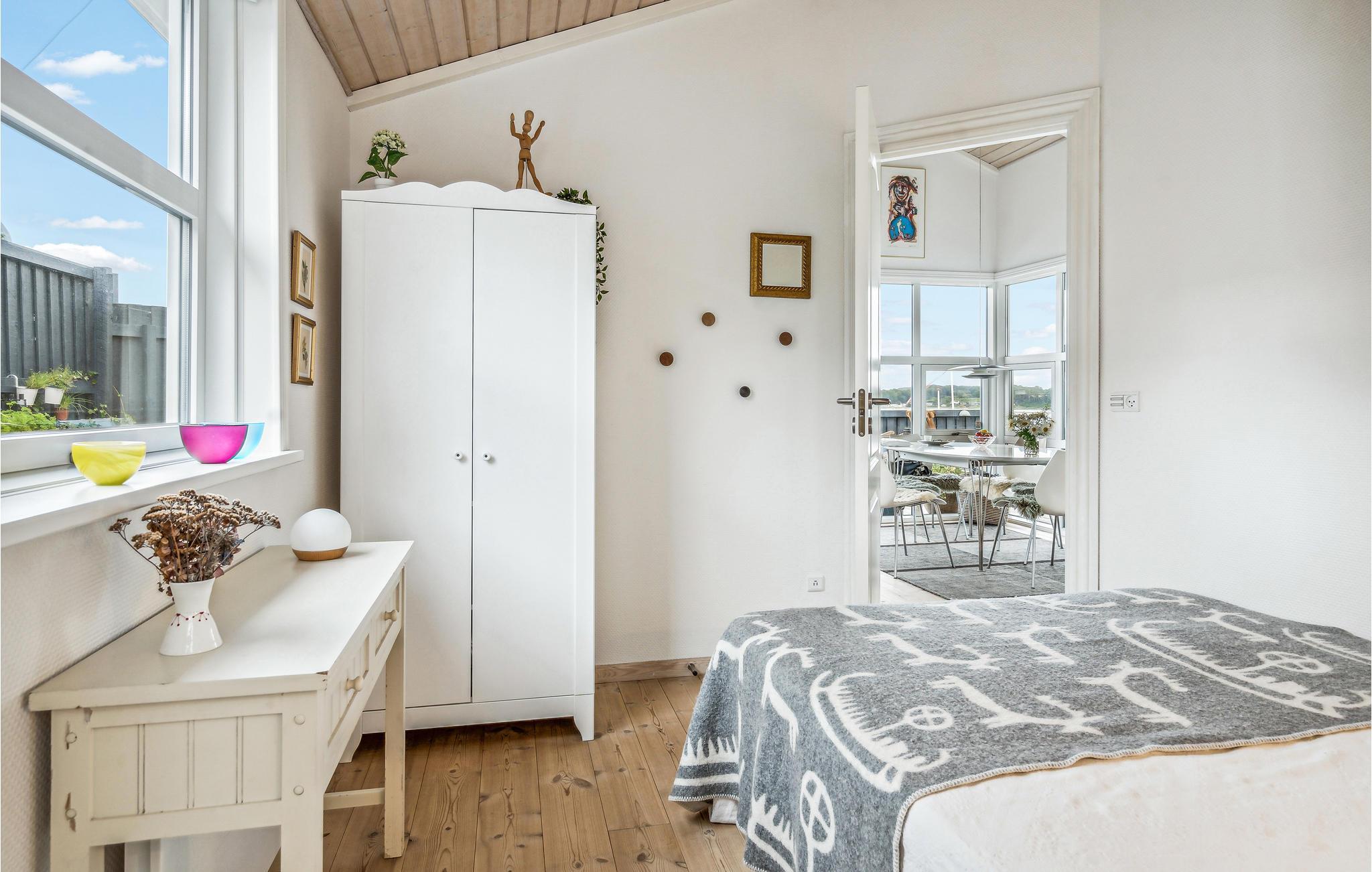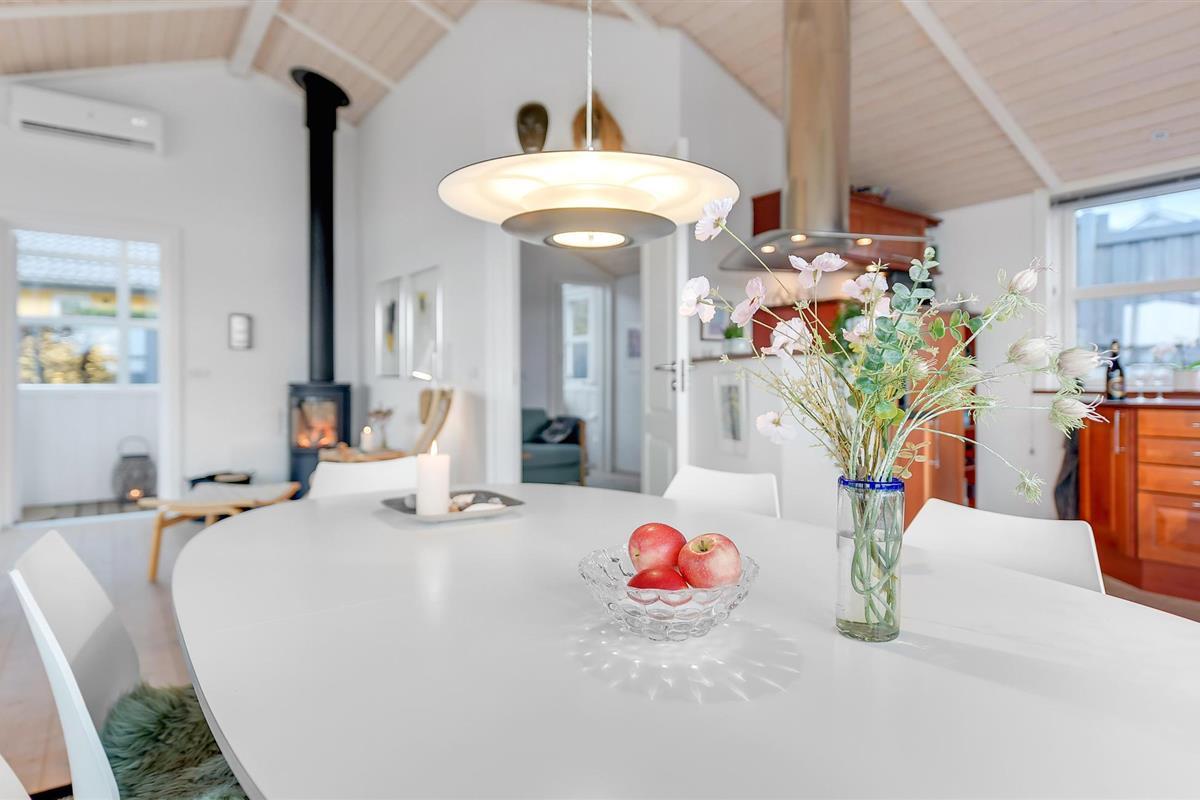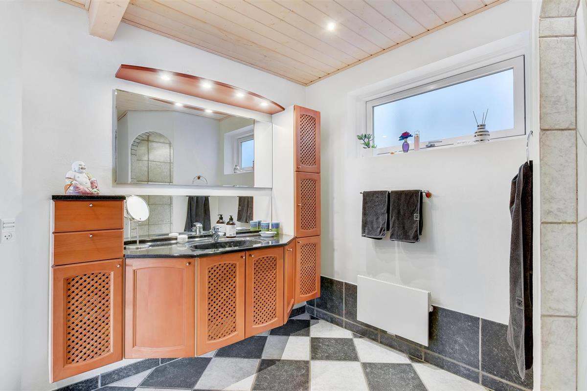 De 1e verdieping is zeer gezellig ingericht met een keuken in open verbinding met de woonkamer en een mooie slaapkamer met eigen toilet. Door de grote panoramische ramen en op het grote, deels overdekte terras heeft u een uniek uitzicht over de Kleine Belt en de haven in Hejlsminde. Op de begane grond zijn er nog 2 slaapkamers en een grote badkamer, waar ook een wastafel is. Er is ook een plek om gevangen vis schoon te maken.
