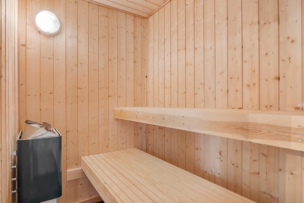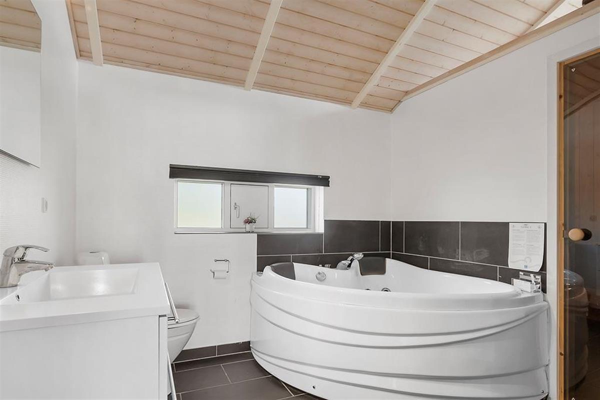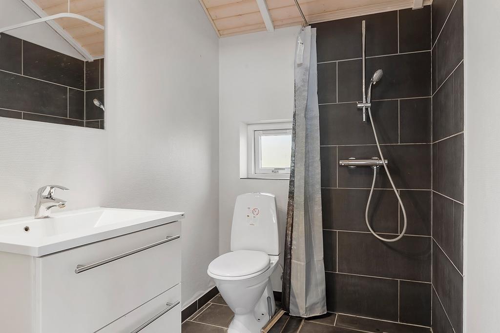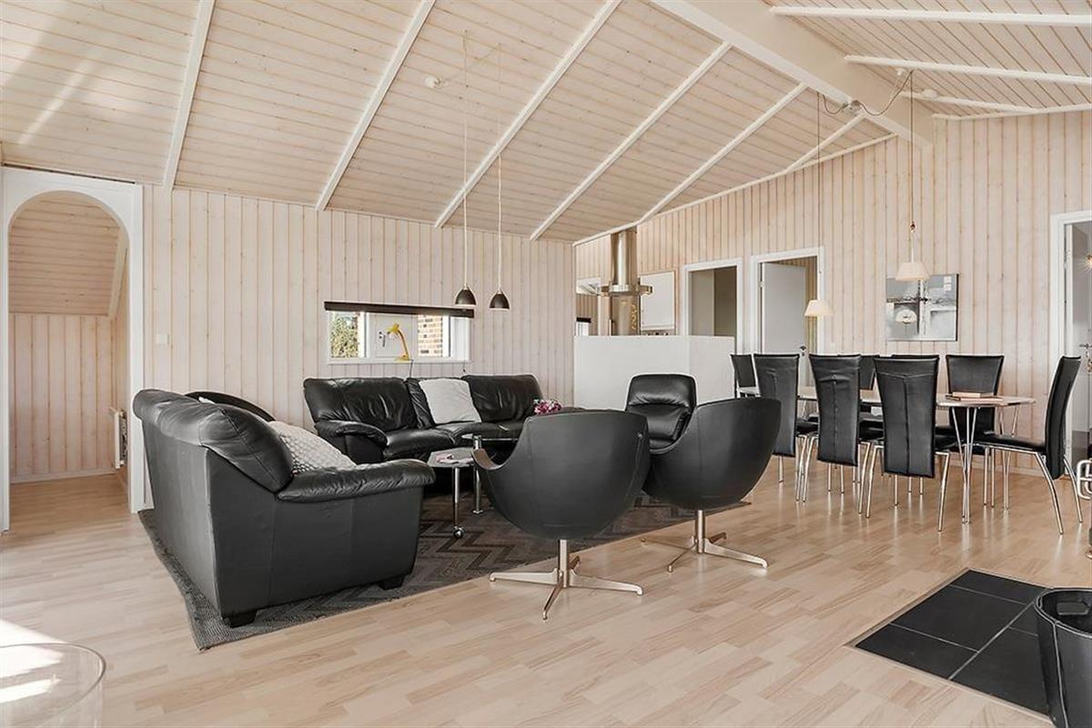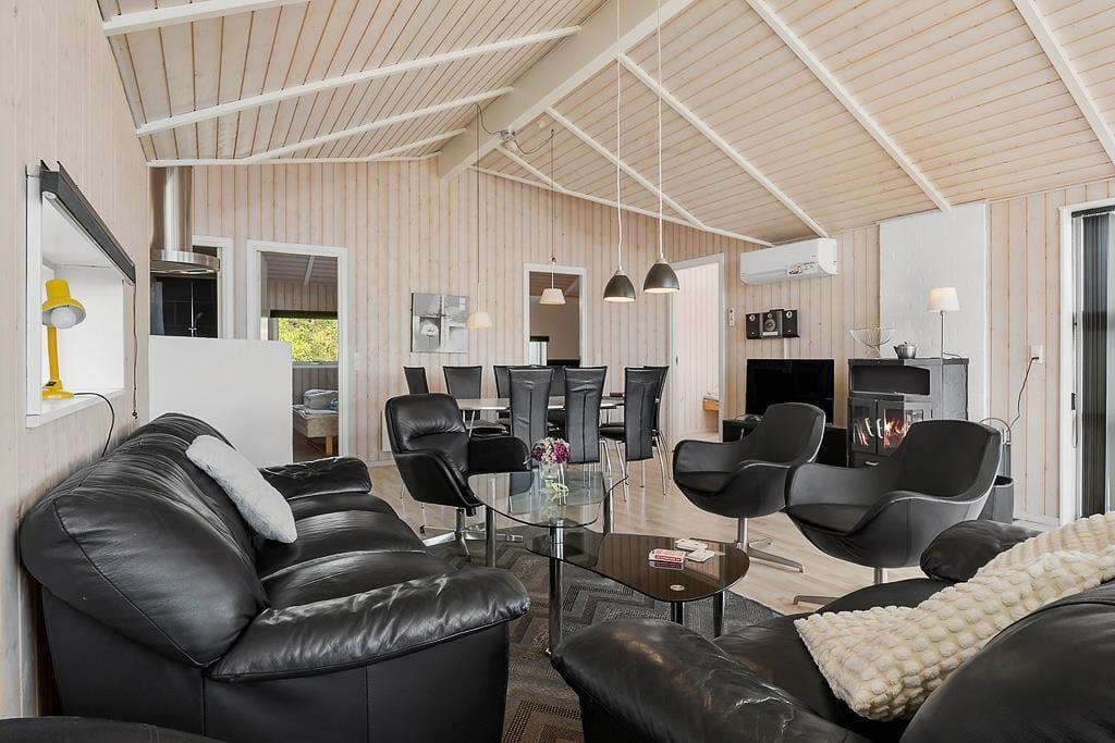 The holiday home on Teglgårdvej welcomes you into a bright and inviting space that immediately feels relaxed and homely. The central living area features high, vaulted ceilings and large windows that flood the room with daylight, creating an airy and open atmosphere. From here, you can enjoy an unobstructed view of the garden and the green surroundings – and catch a glimpse of the sea on the horizon, a constant reminder of just how close you are to the coast. The well-equipped kitchen is openly connected to the living room, setting the stage for both cooking and cosy togetherness – whether it's a quiet morning coffee or evening chats with the family. The house has two bathrooms, one of which offers both a sauna and a spa bath – perfect for those cooler evenings when you need to fully unwind and recharge.