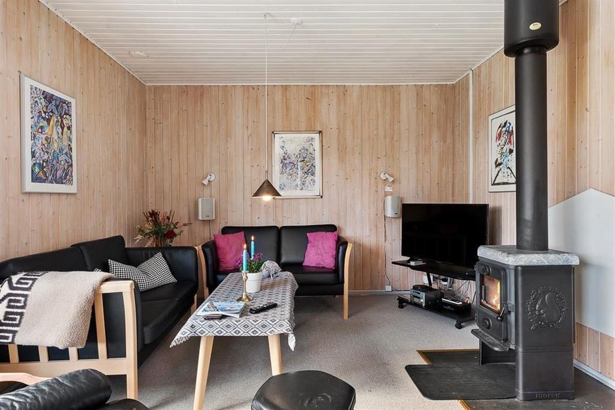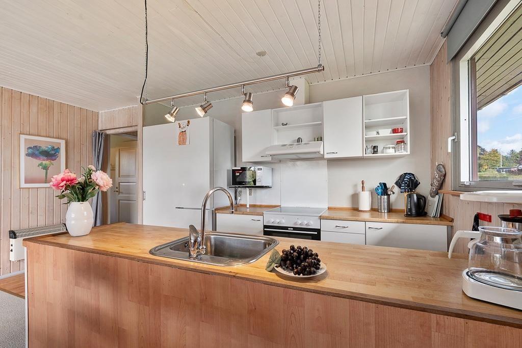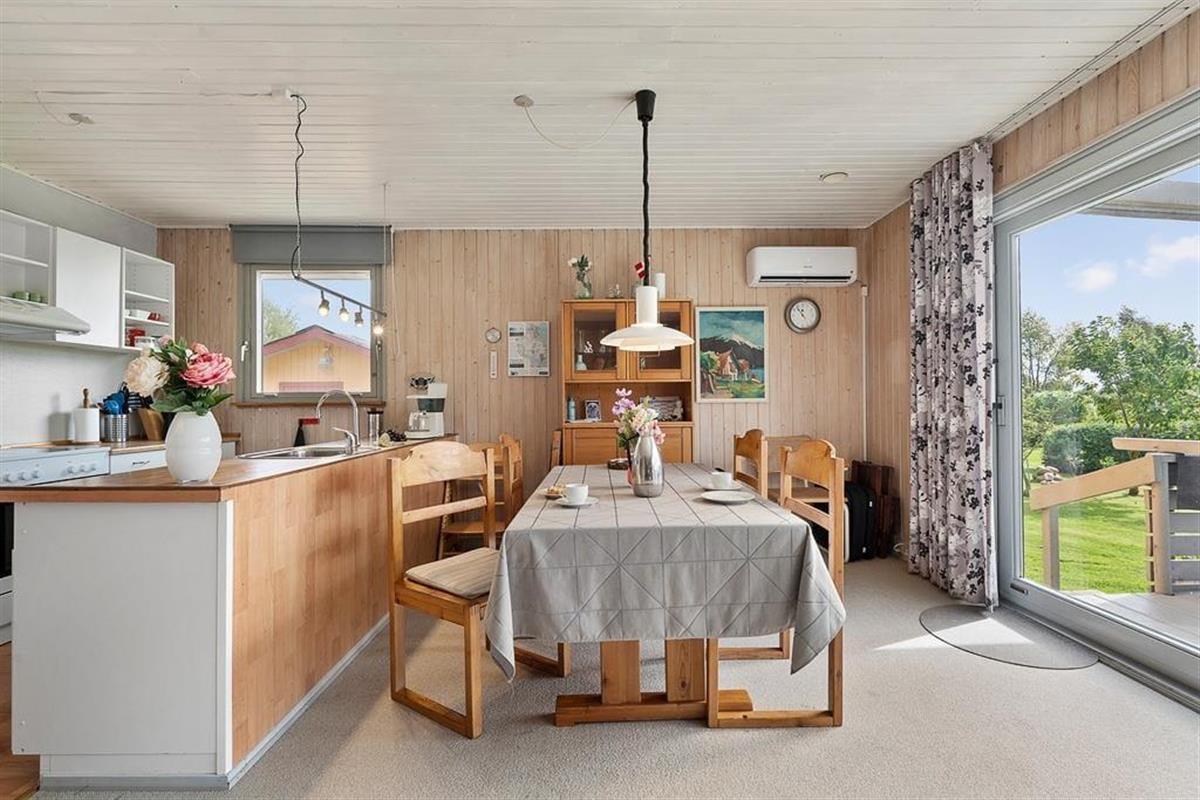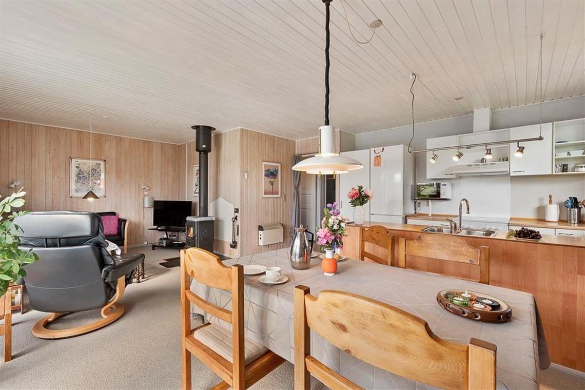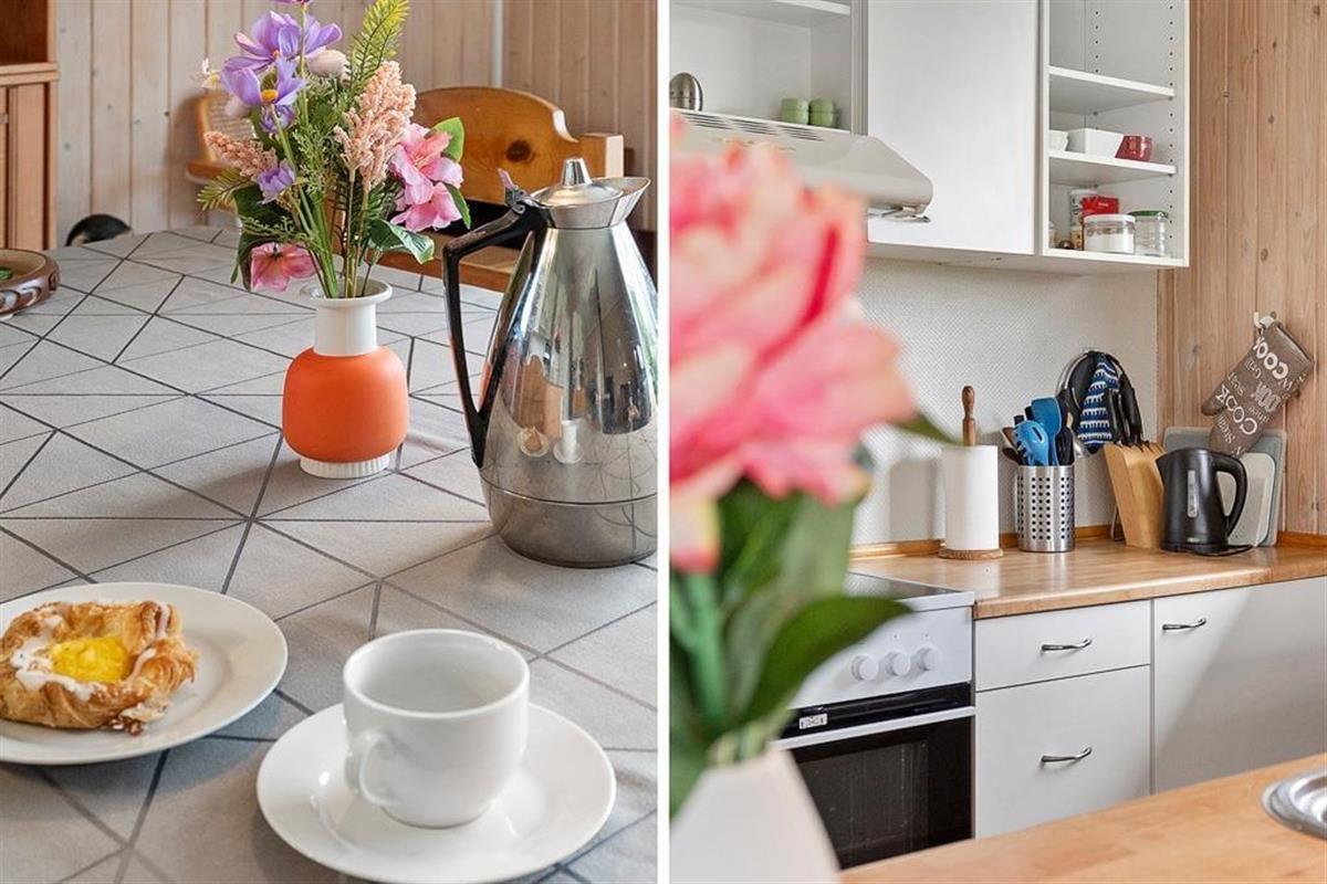 As you step into this holiday home, you are greeted by a bright and inviting atmosphere where the kitchen and living room are seamlessly connected in one large, open space. Here, it’s easy to gather the whole family for shared meals or let conversations flow while you enjoy a quiet moment on the sofa. The large windows let natural light flood the living room and provide a wonderful view of the green garden, giving you a sense of closeness to nature – even when you are indoors. The interior is cozy and functional, making it easy to feel at home from the very first moment.