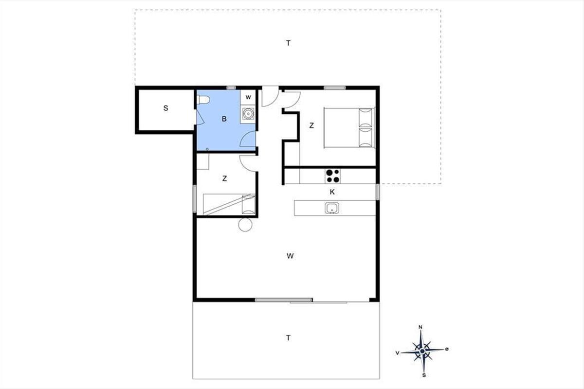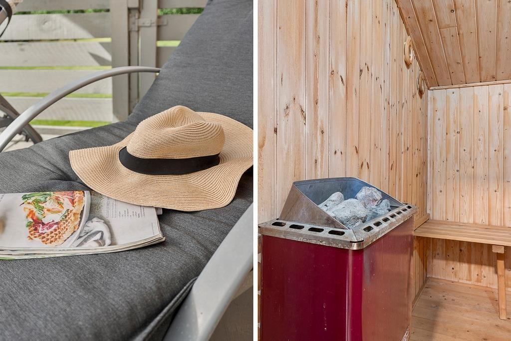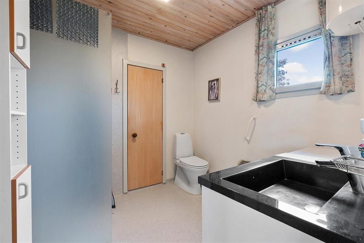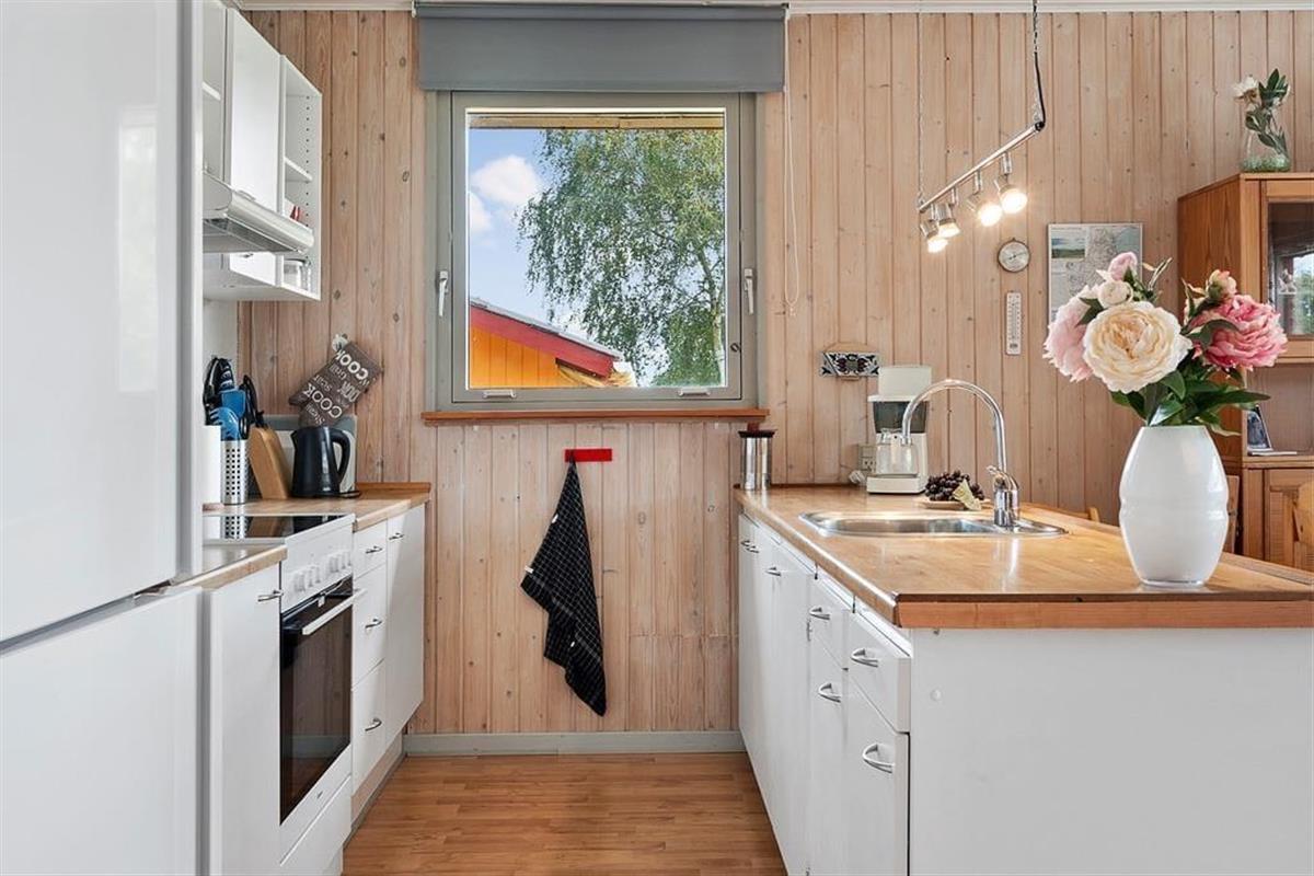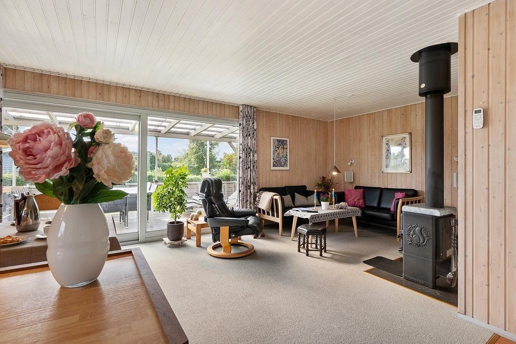 As you step into this holiday home, you are greeted by a bright and inviting atmosphere where the kitchen and living room are seamlessly connected in one large, open space. Here, it’s easy to gather the whole family for shared meals or let conversations flow while you enjoy a quiet moment on the sofa. The large windows let natural light flood the living room and provide a wonderful view of the green garden, giving you a sense of closeness to nature – even when you are indoors. The interior is cozy and functional, making it easy to feel at home from the very first moment.