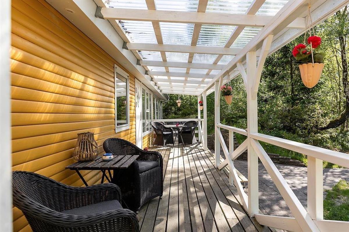 Im Süden befindet sich eine überdachte Terrasse, die an warmen Tagen und hellen Sommerabenden schnell zum Lieblingsplatz werden kann. Wer lieber an der frischen Luft sitzt, findet auf dem gepflasterten Bereich rund um das Haus ein sonniges Plätzchen - wenn er nicht gerade auf dem Rasen des 1100 m2 großen Grundstücks sitzt, wo er von hohen Laubbäumen und anderer malerischer Vegetation umgeben ist.
