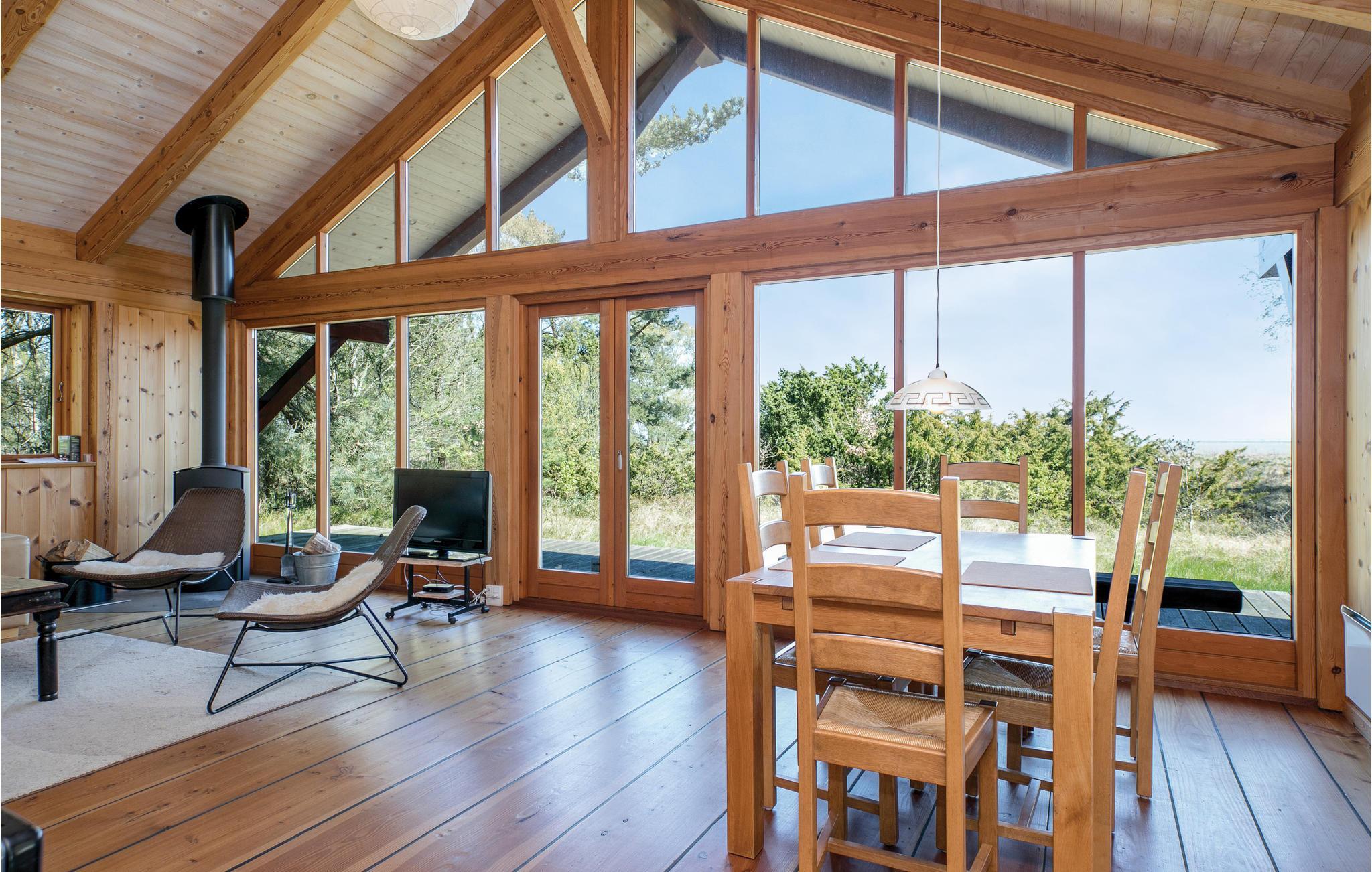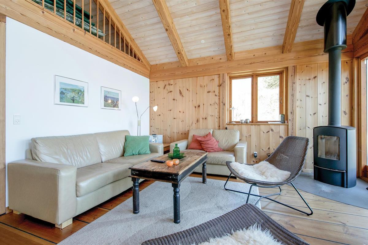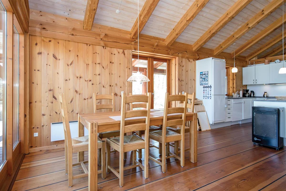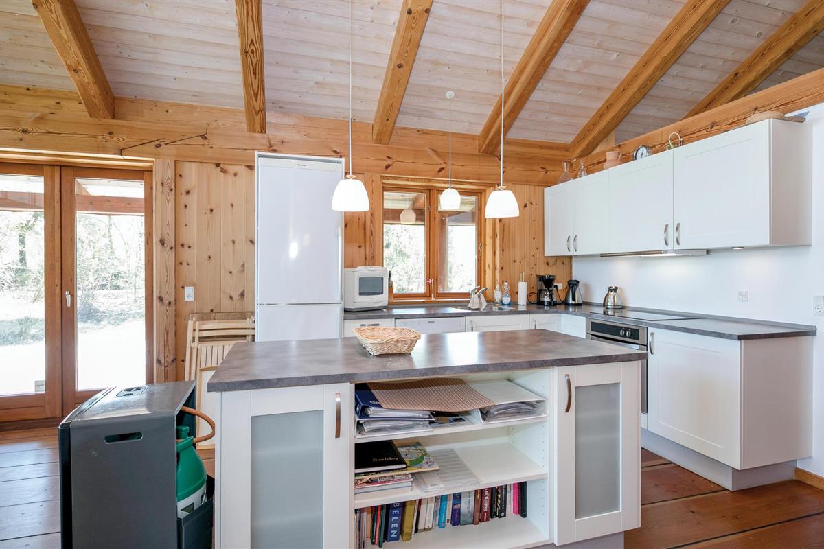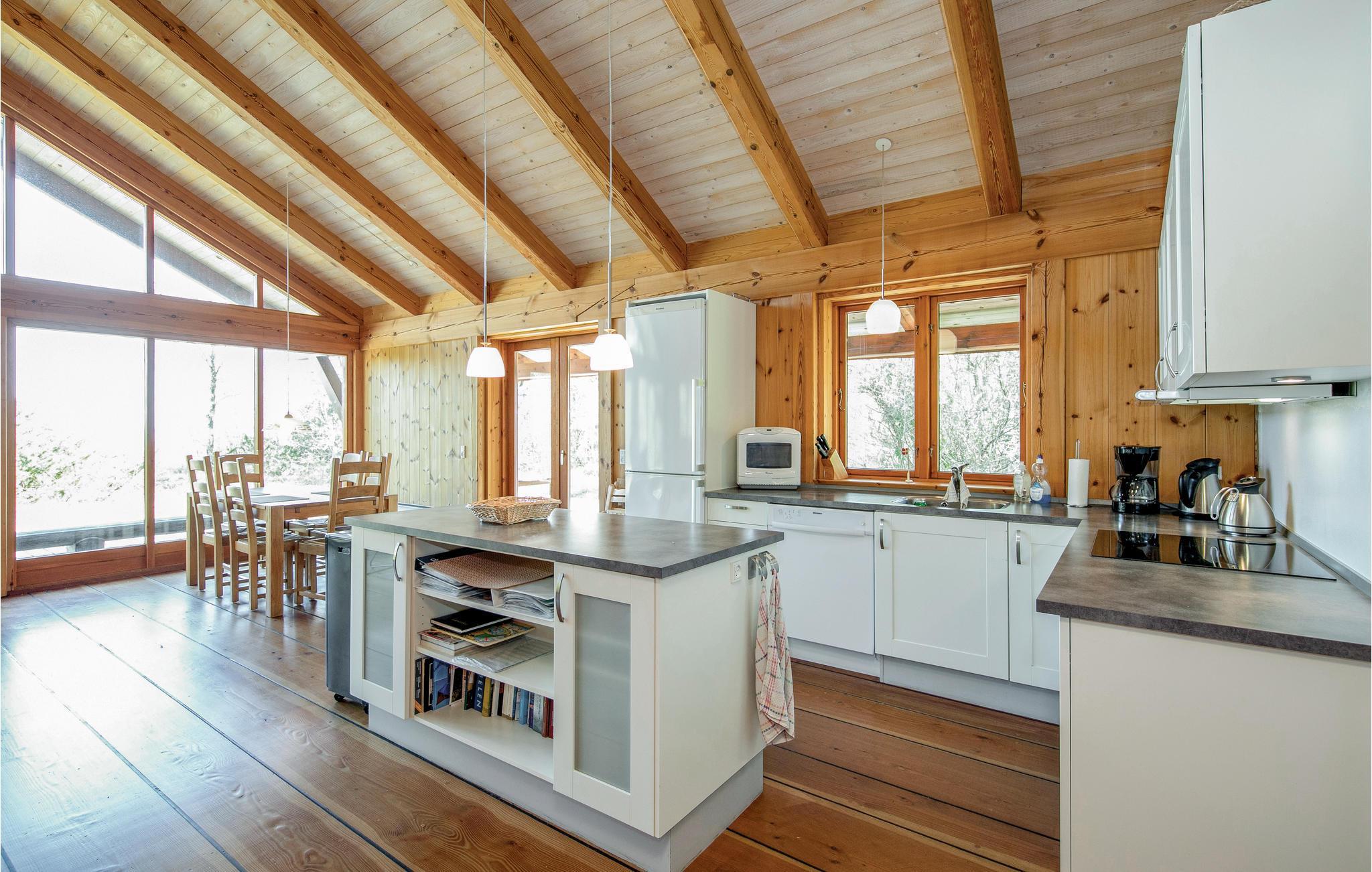 Helberskov ligt in een recreatiegebied waar het Mariager Fjord en het Kattegat samenkomen. Hier vindt u deze gezellige blokhut op een bosperceel vlakbij het strand. In een gevel, waar zich de woonkamer, keuken en eettafel bevinden, heeft u door een groot raam uitzicht op zee. Vanaf de bank kunt u genieten van het uitzicht en de aangename warmte van de houtkachel. In het huis bevindt zich een schuin dak met houten balken, wat zorgt voor de juiste vakantiehuis-sfeer. U vindt verschillende gezellige slaapplaatsen in de mooie slaapkamers en ook op de open slaapzolder, waar de kinderen ook hun eigen holletje hebben en tv kunnen kijken.