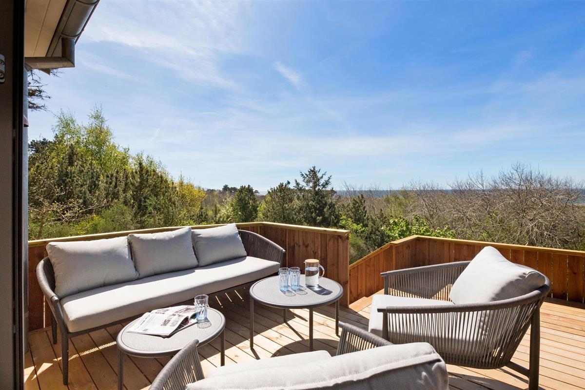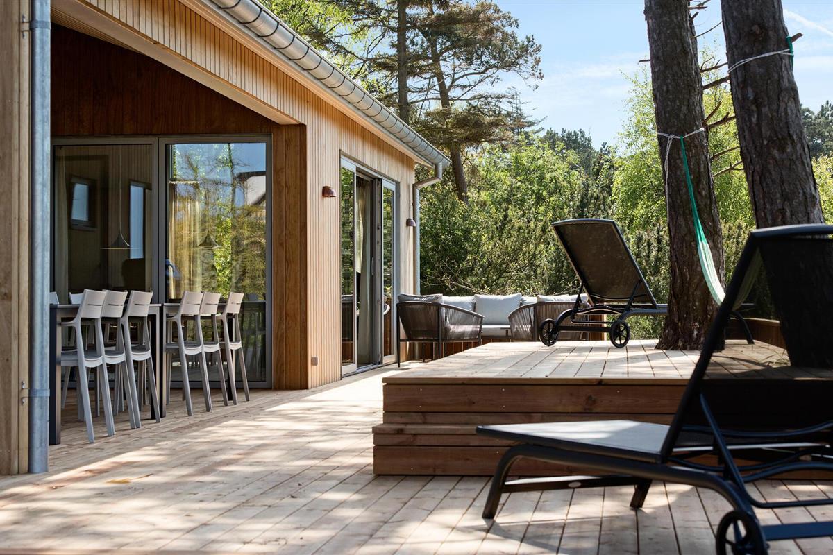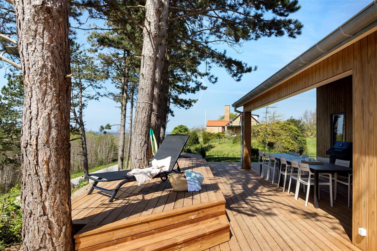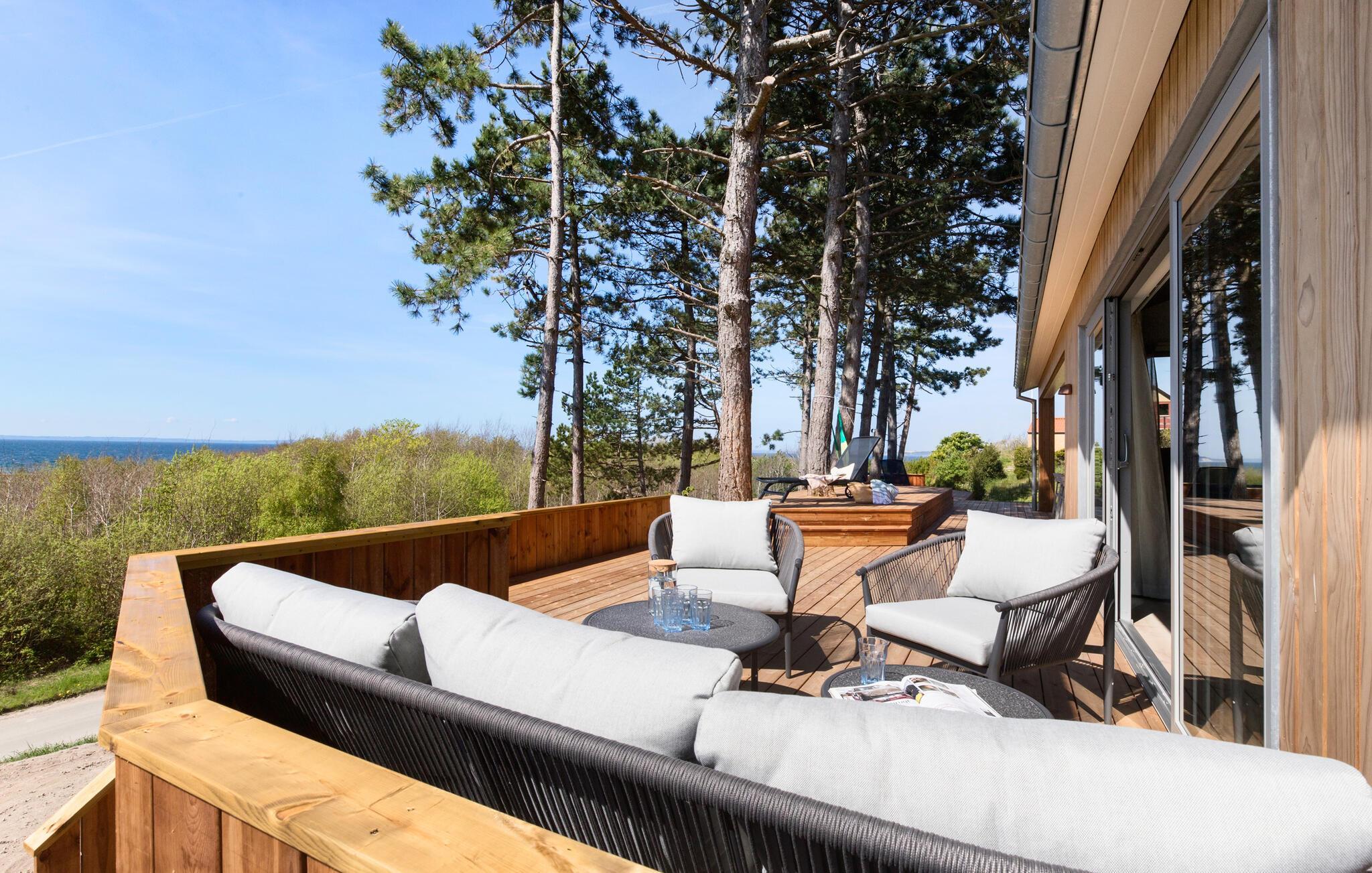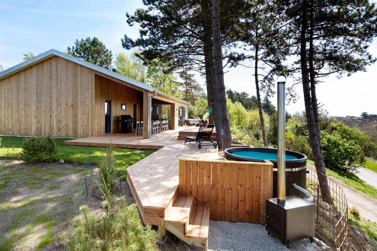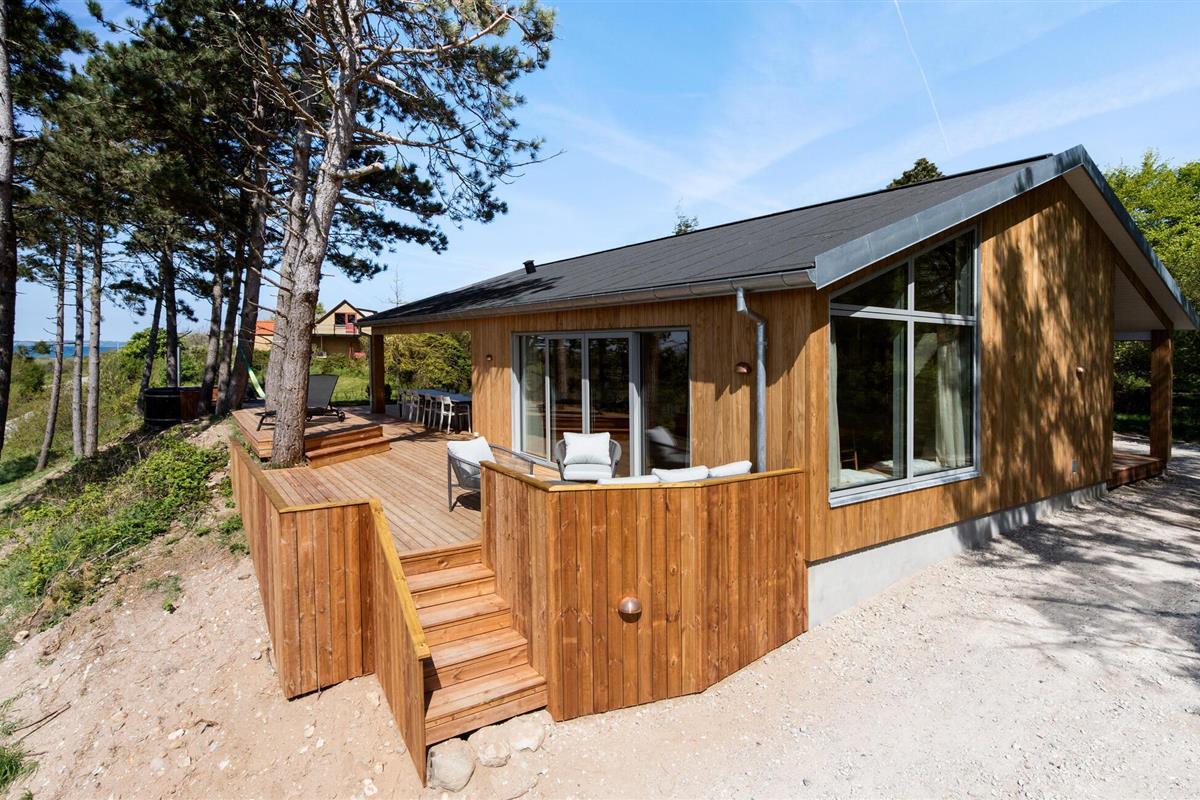 Modern vakantiehuis met zeezicht, privé wellness en ruime tuin in Helgenæs, Denemarken.