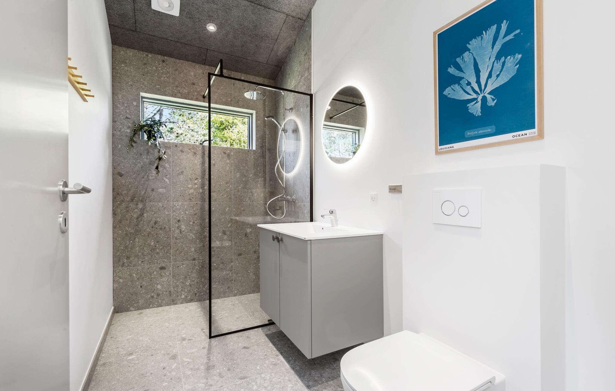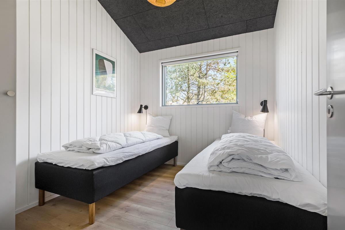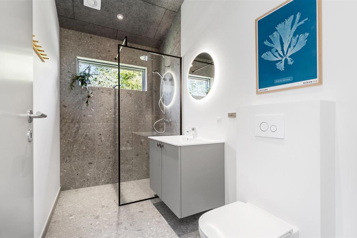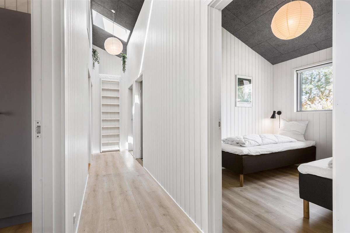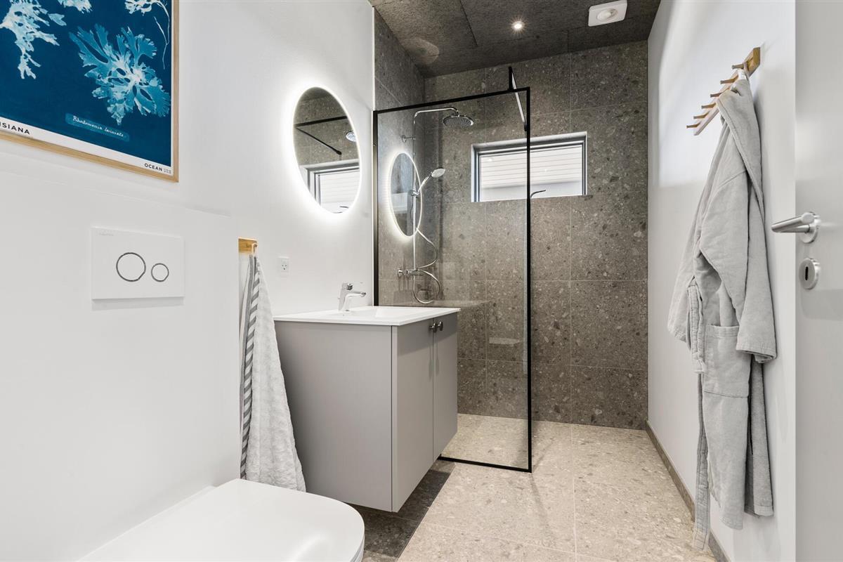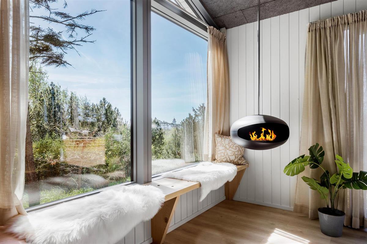 Modern vakantiehuis met zeezicht, privé wellness en ruime tuin in Helgenæs, Denemarken.