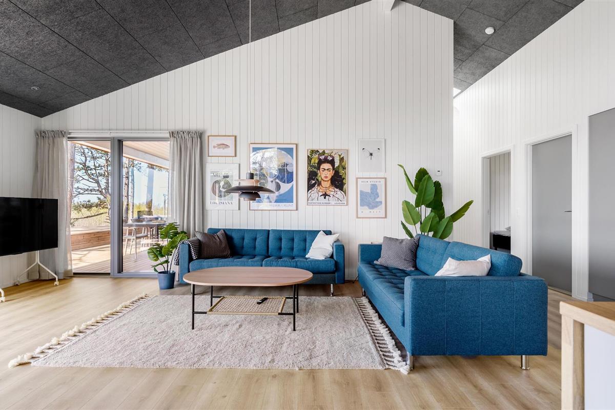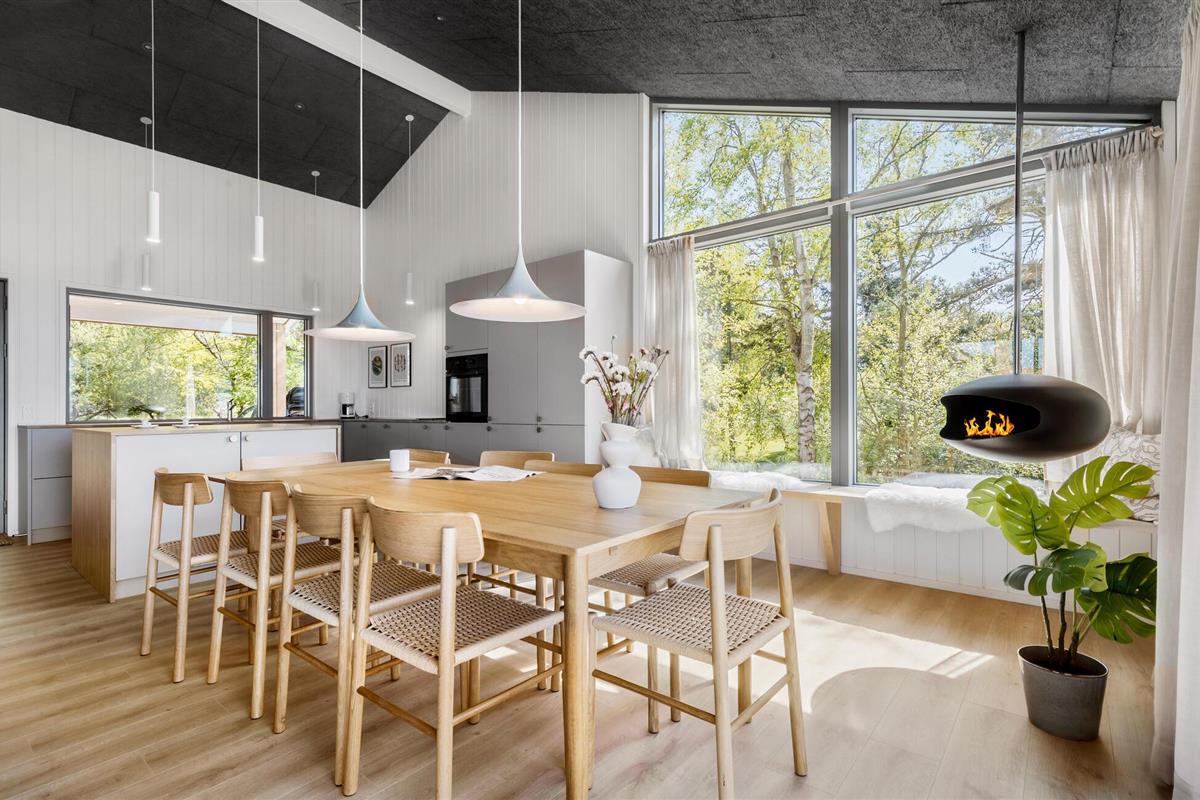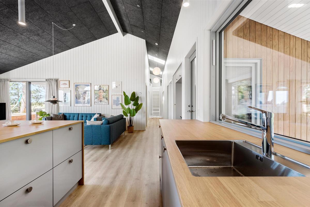 Breng je volgende vakantie door in dit moderne vakantiehuis dat comfort, design en een fantastisch uitzicht combineert. Ontspan in de ruime woonkamer met hoge plafonds en panoramische ramen. Geniet van het stijlvolle interieur met comfortabele banken, geselecteerde kunst aan de muren en een harmonieus kleurenschema. Kook samen in de lichte, open keuken met kookeiland en hoogwaardige apparatuur. Neem plaats aan de lange eettafel met uitzicht op het groen en het water.