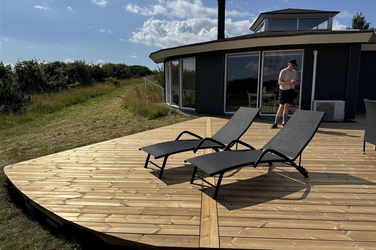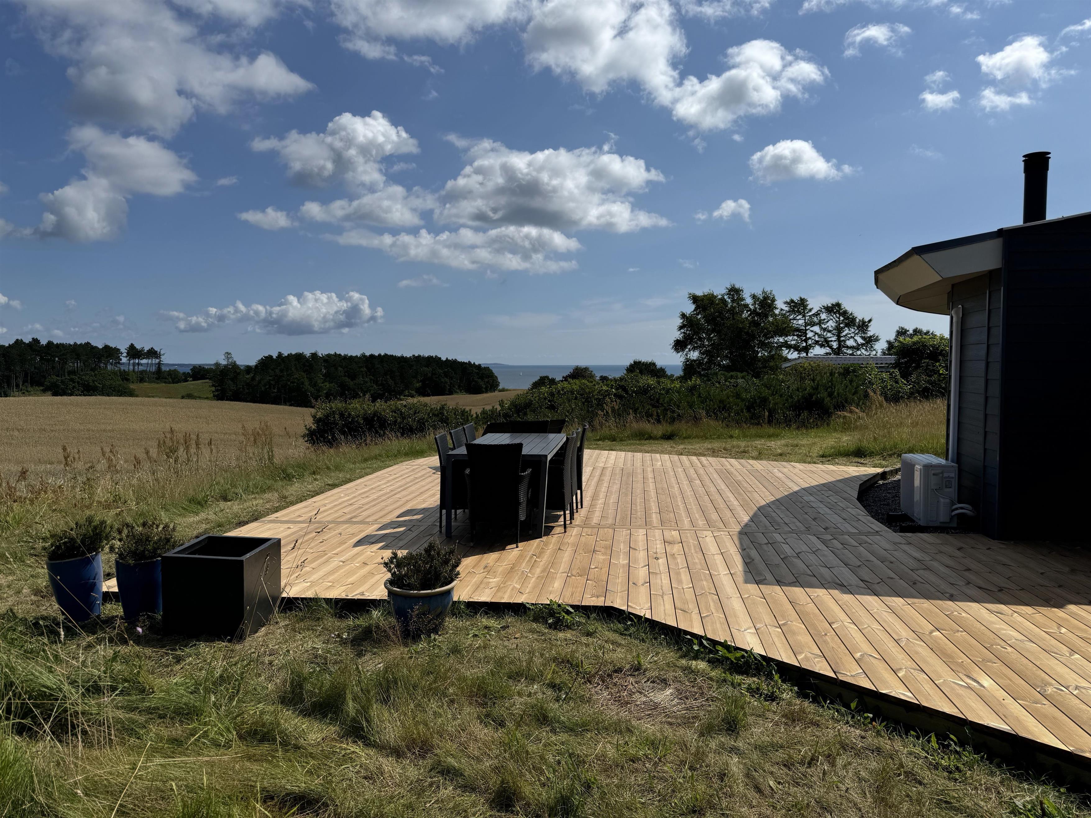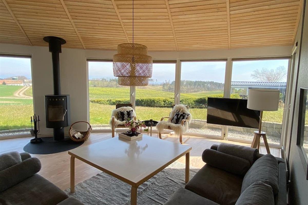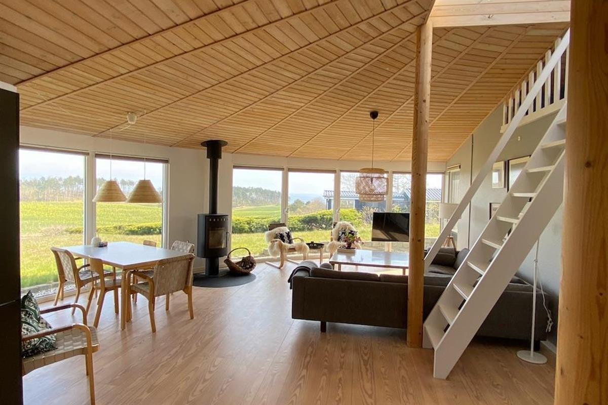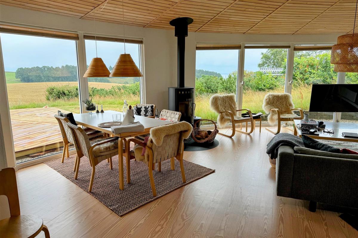 On the beautiful peninsula, Helgenæs, this very special holiday home, with the most fantastic views over both green areas and the sea - from the terrace and also from the living room which has large panoramic windows, is located