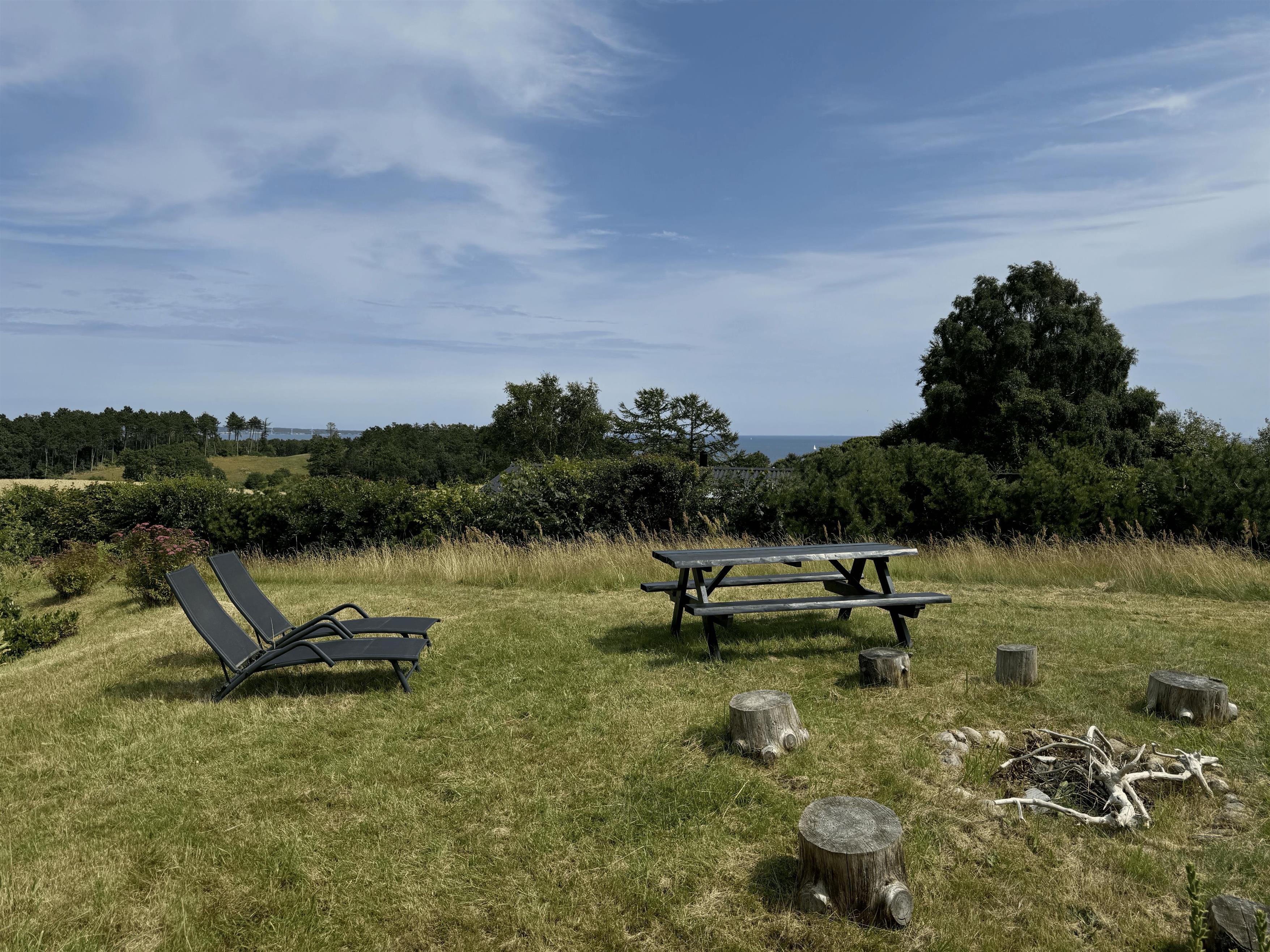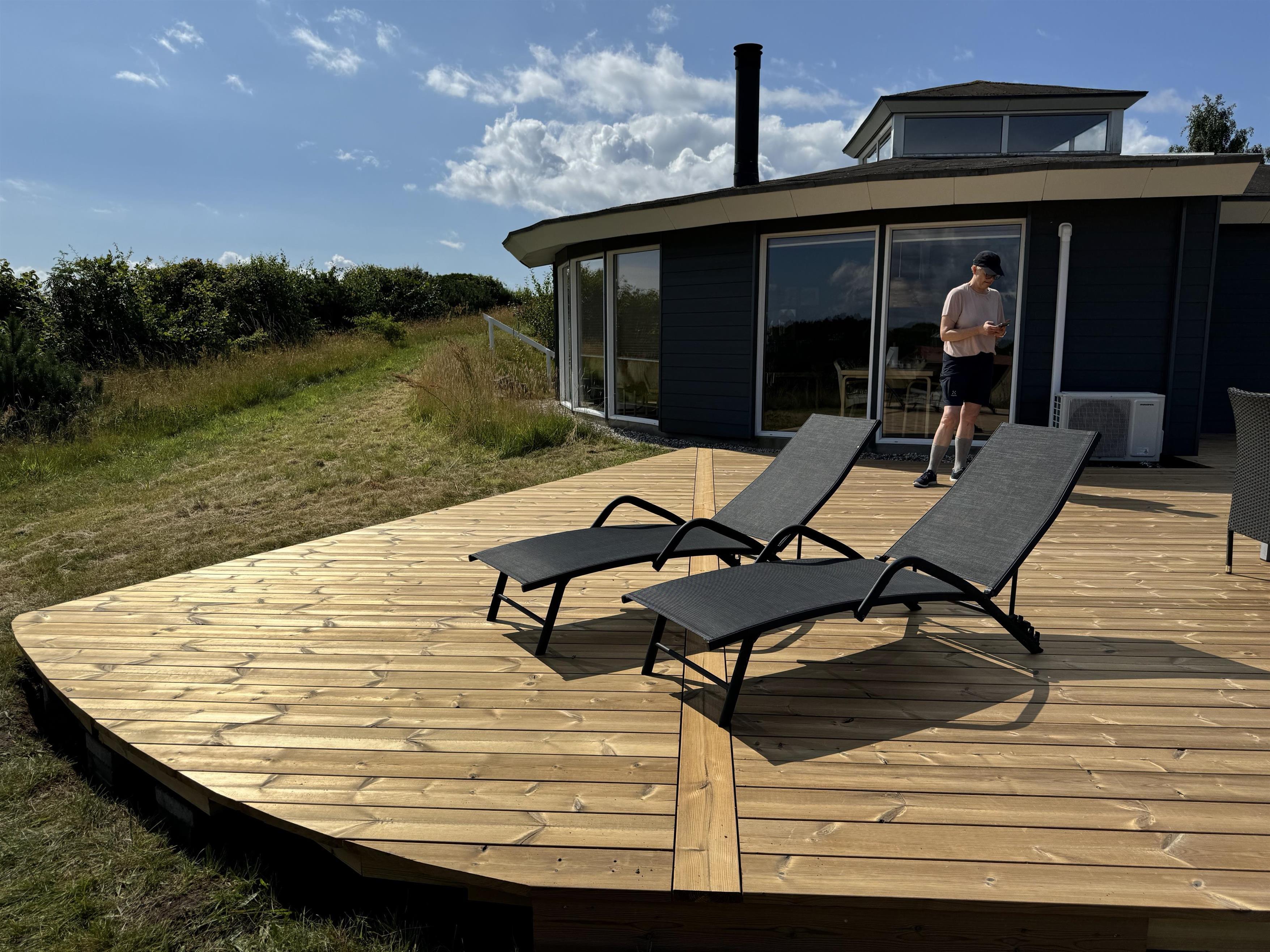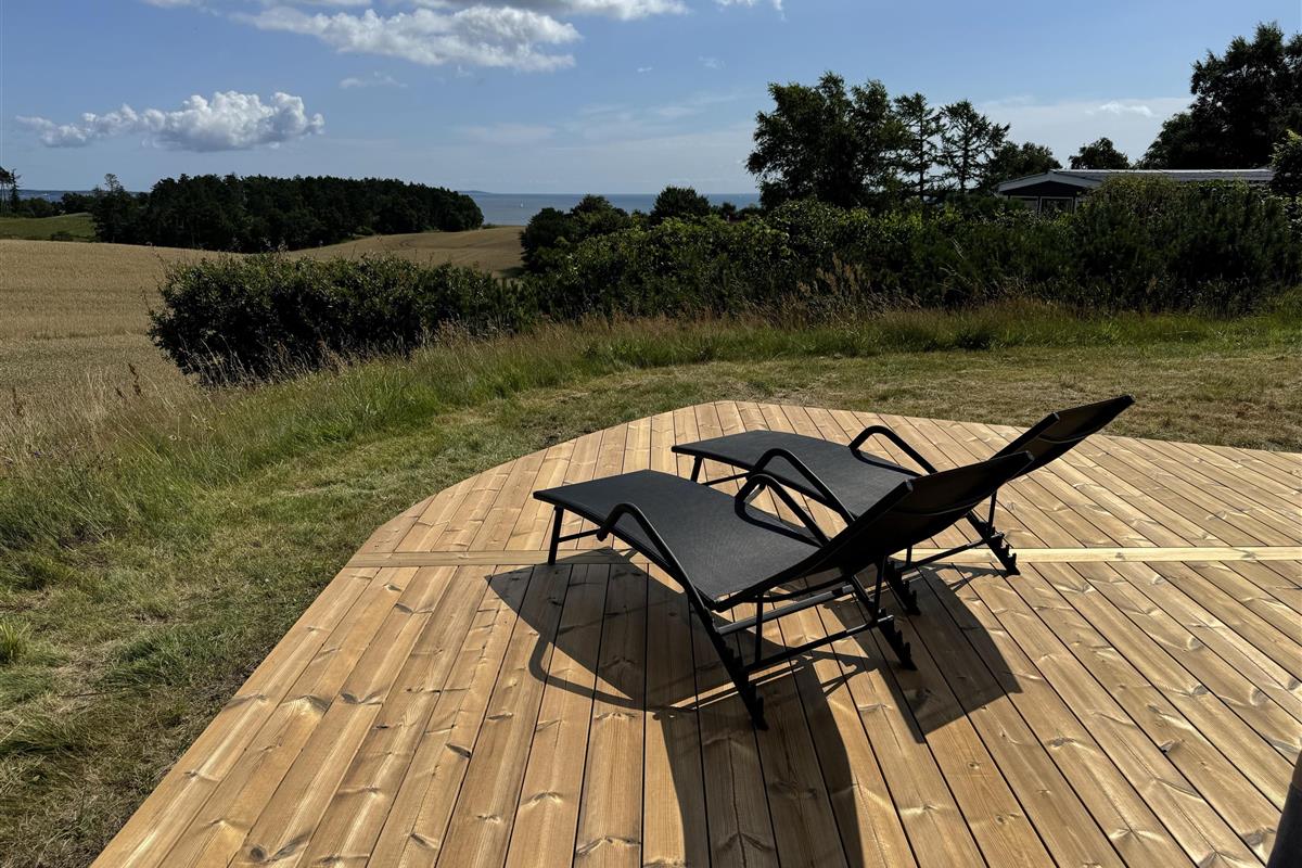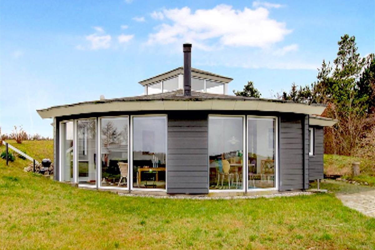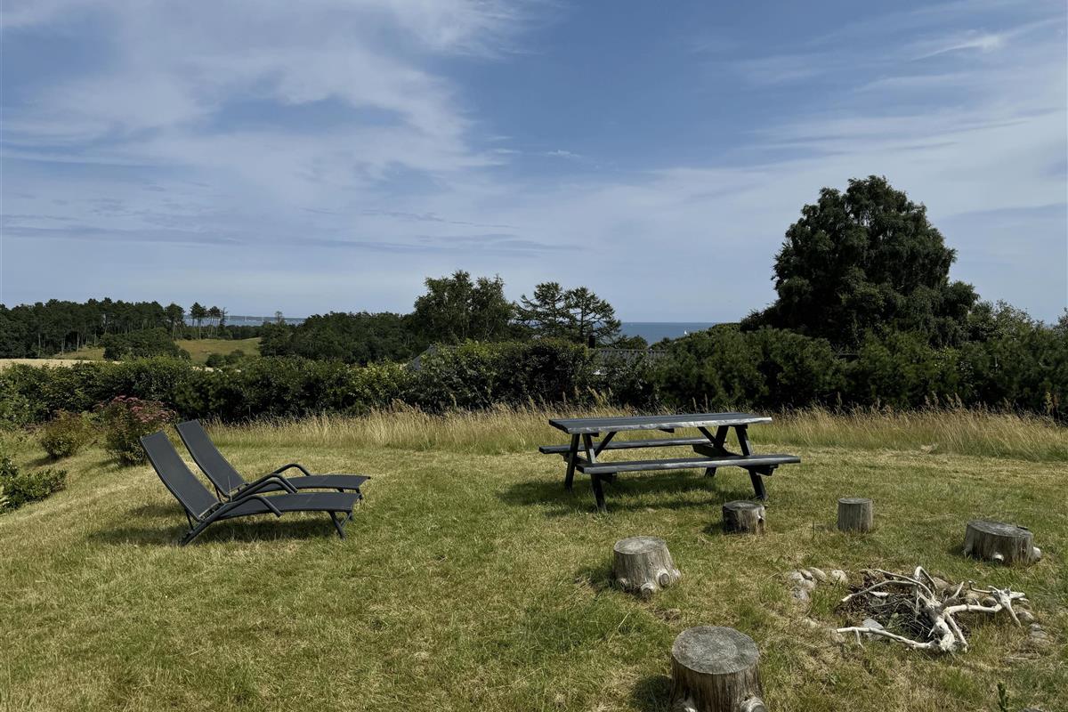 On the beautiful peninsula, Helgenæs, this very special holiday home, with the most fantastic views over both green areas and the sea - from the terrace and also from the living room which has large panoramic windows, is located