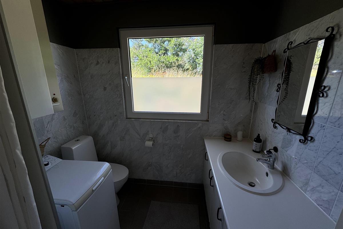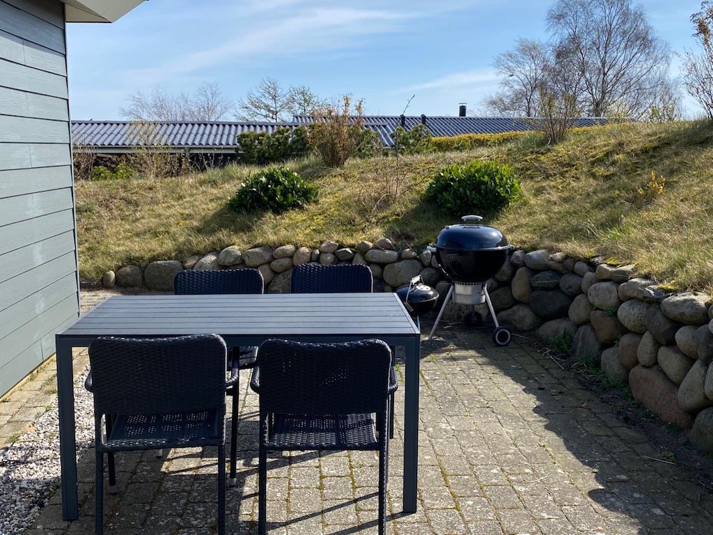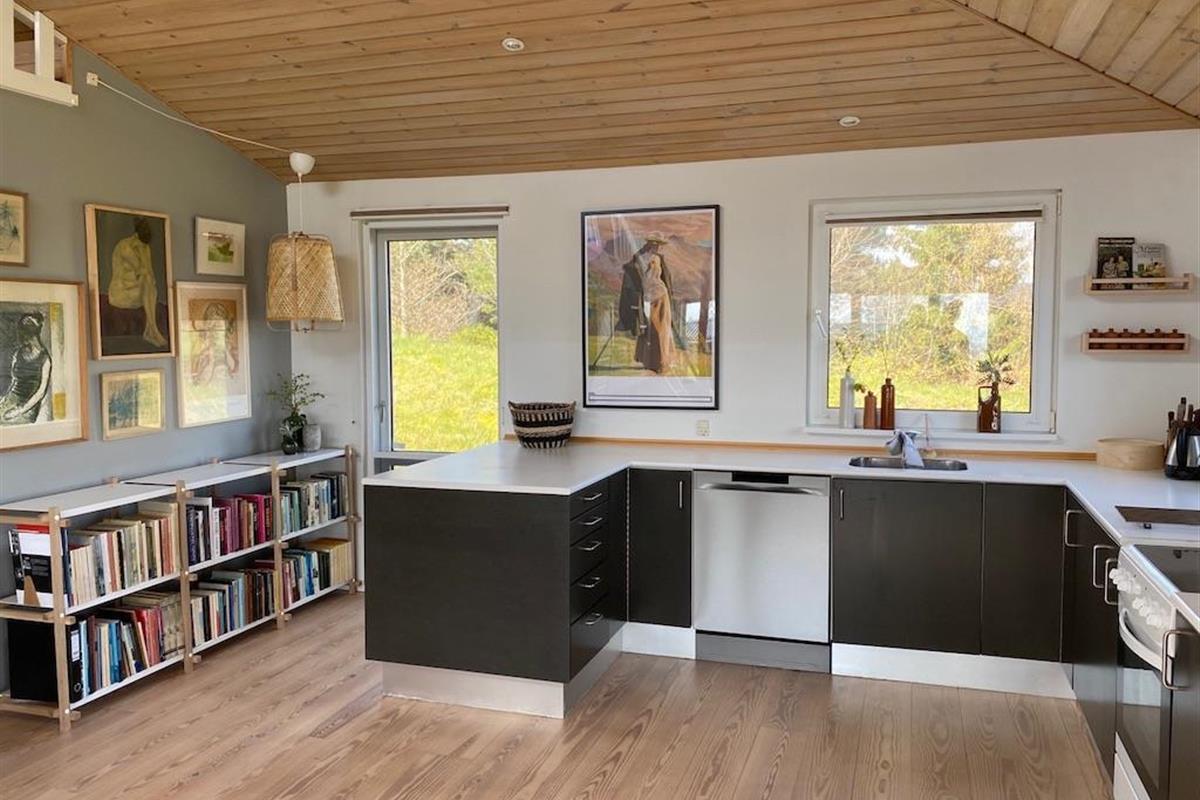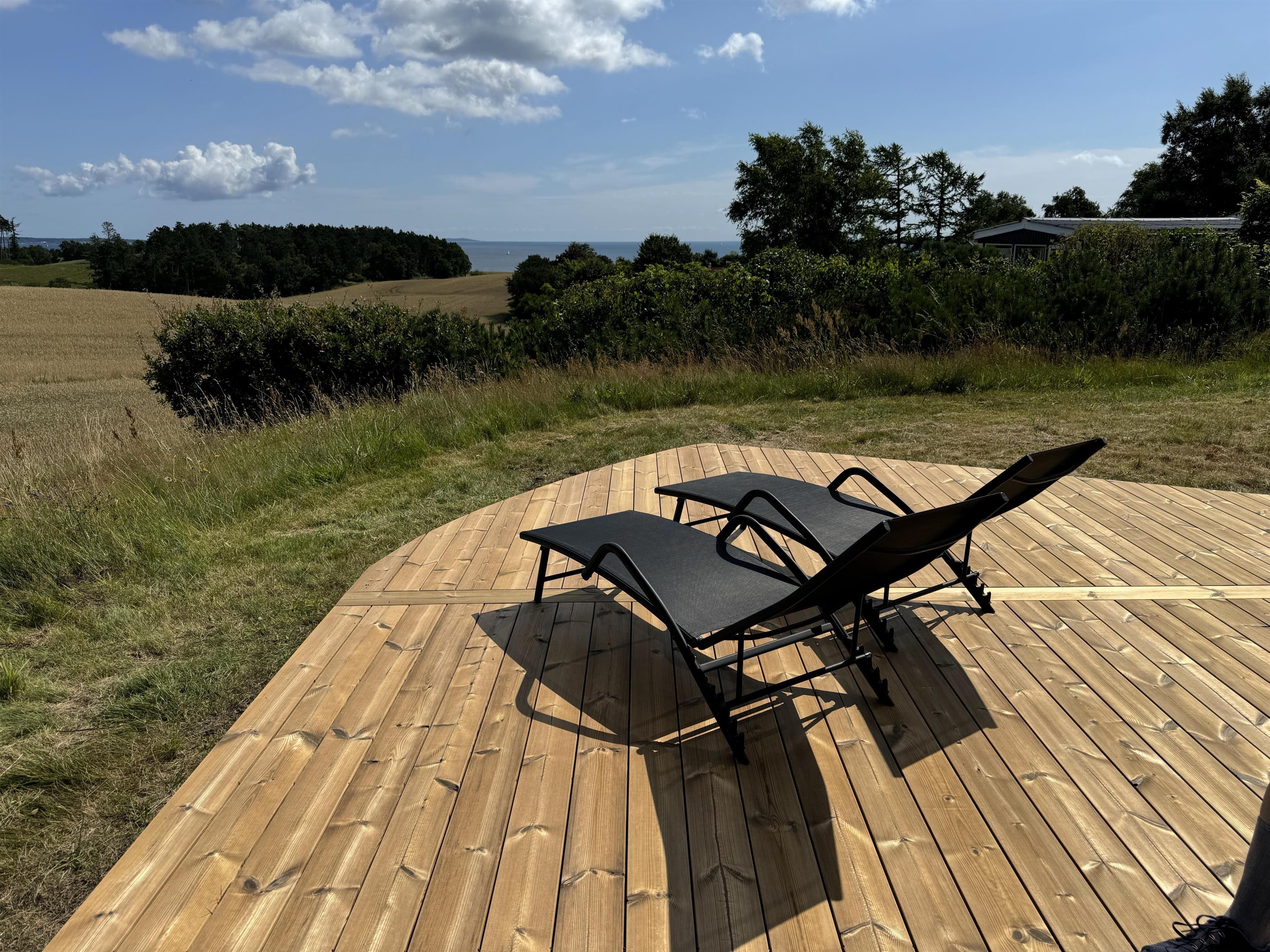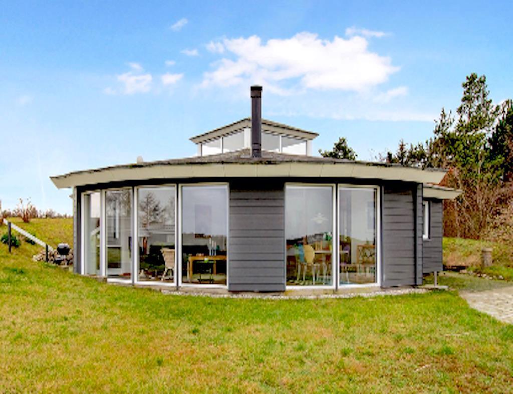 On the beautiful peninsula, Helgenæs, this very special holiday home, with the most fantastic views over both green areas and the sea - from the terrace and also from the living room which has large panoramic windows, is located