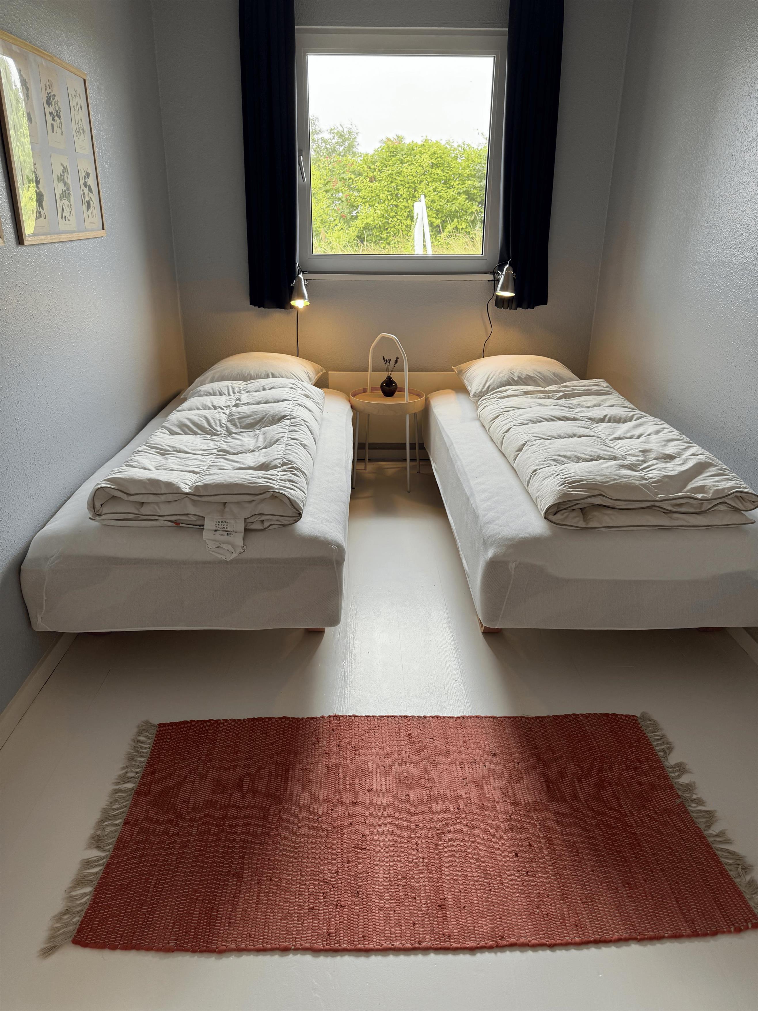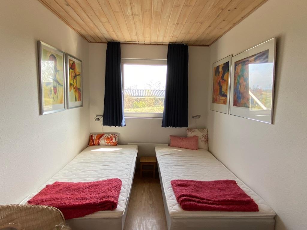 There are 3 bedrooms: one with a double bed and two with single beds.