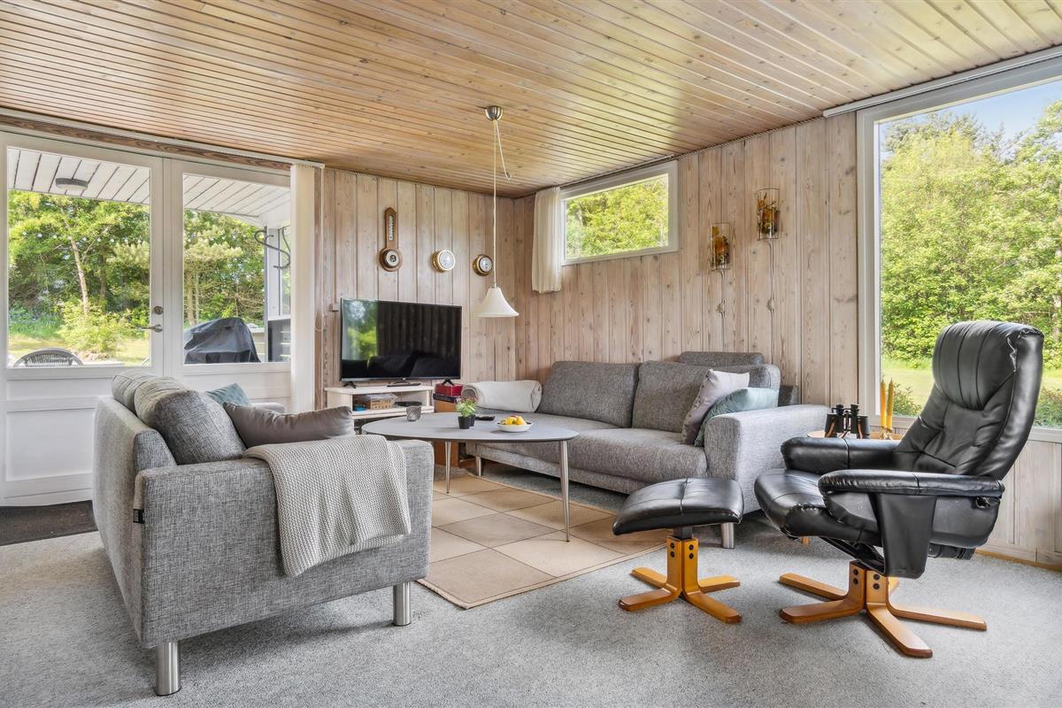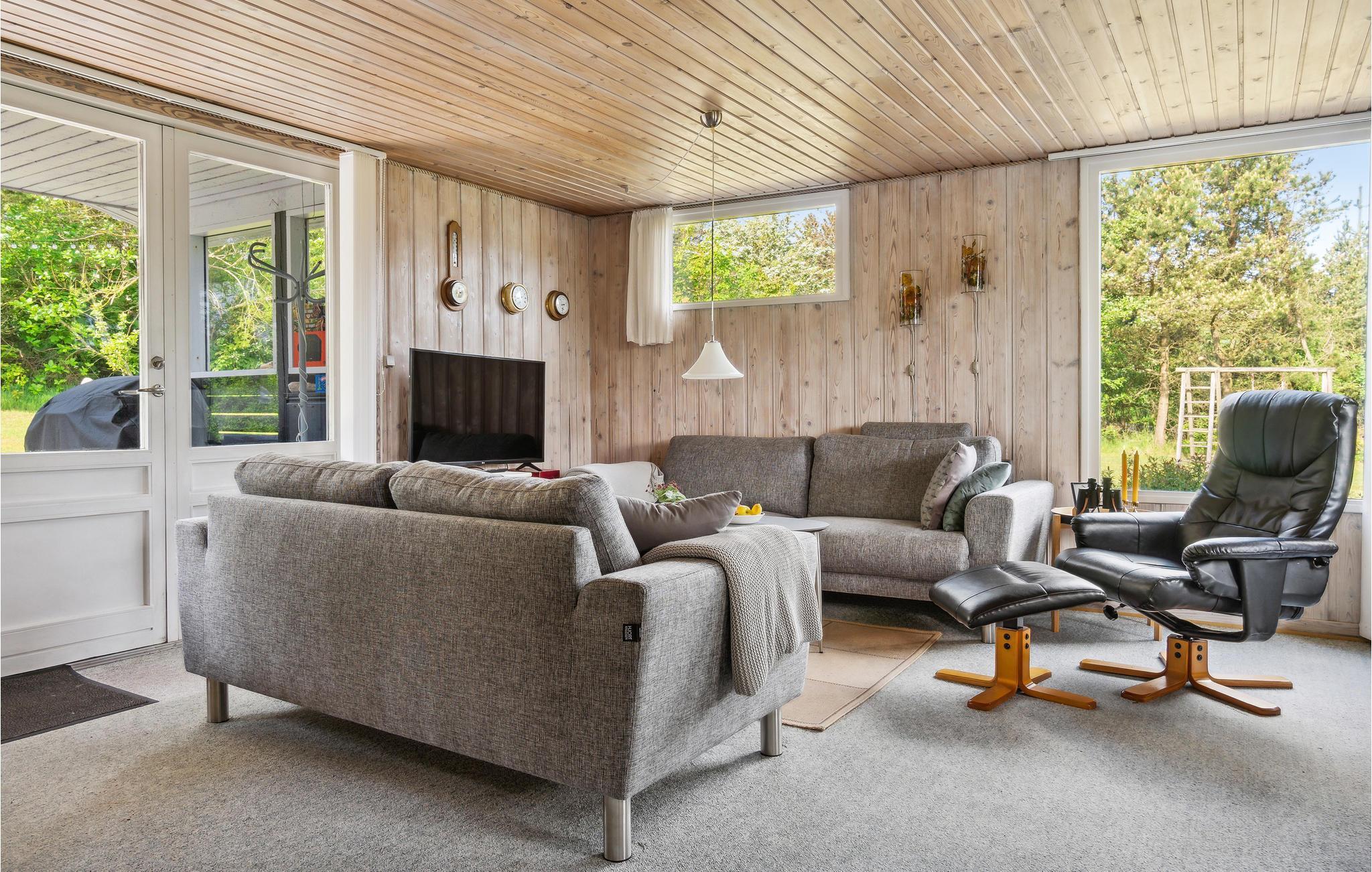 Het uitnodigende huis verwelkomt u omringd door bomen. Grote ramen laten veel licht binnen in de kamers met opvallende houten lambrisering en maken het vakantiehuis tot een oase van welzijn. Laat uw blik over de omgeving dwalen terwijl u ontspant op de bank. Na een heerlijke dag op het strand, maak het uzelf 's avonds comfortabel op de bank voor een filmavond, steek het vuur in de kachel aan en geniet van de gezellige sfeer.