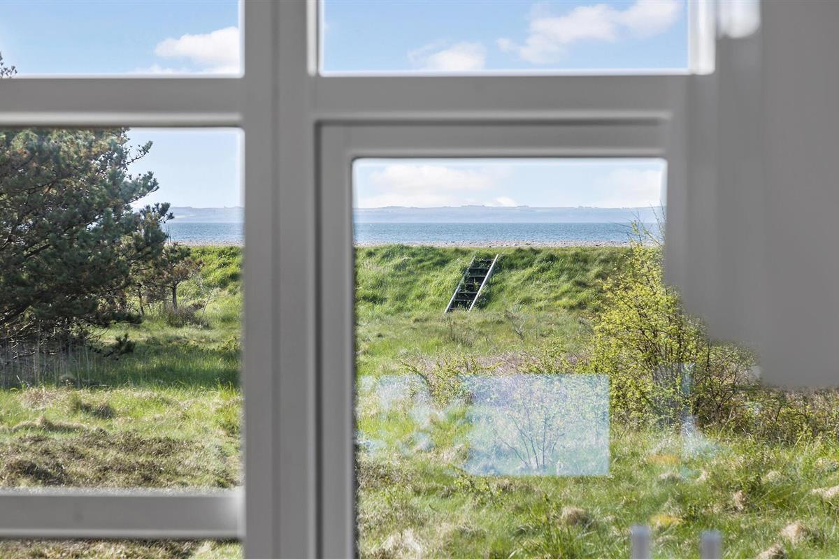 Architectonisch vakantiehuis aan Helligsø strand met panoramisch uitzicht op de Limfjord en directe toegang tot het stenen strand.