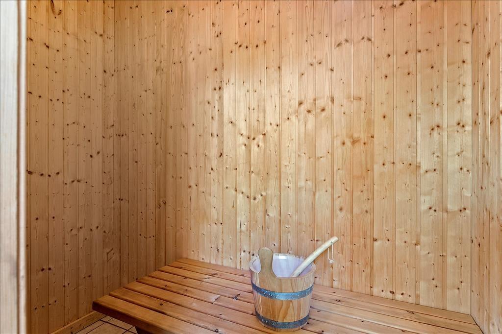 Wenn Sie sich nicht am Strand aufhalten oder einen Ausflug in der reizvollen Umgebung unternehmen, können Sie Ihren Urlaub in diesem gepflegten 100 m² großen Ferienhaus genießen. Im Wohnzimmer können Sie sich im sonnenverwöhnten Glasvorbau niederlassen, auf dem Sofa einen spannenden Film auf dem Flachbild-TV anschauen oder beim Knistern des Kaminofenfeuers den Gedanken freien Lauf lassen. Ihre Mahlzeiten bereiten Sie in der offenen Küche zu. Erholungsmöglichkeiten bietet Ihnen das große Badezimmer, das mit Whirlpool und Sauna ausgestattet ist. Die Schlafplätze verteilen sich auf drei gute Schlafzimmer, von denen eines mit einem Doppelbett, eines mit einem Etagenbett und das dritte mit zwei Einzelbetten eingerichtet ist.