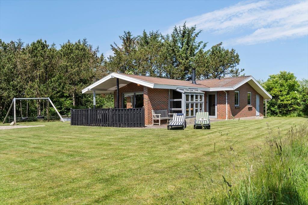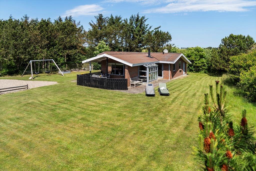 Das 1.500 m² große Ferienhausgrundstück ist von einer ansprechenden Randbepflanzung eingerahmt. Diese sorgt für Windschutz und schützt Sie vor den Blicken Ihrer Nachbarn. Ihren Pkw können Sie in der mit Schotter versehenen Einfahrt abstellen. Die Grasfläche animiert Groß und Klein zum gemeinsamen Ballspiel. Die jüngsten Urlauber dürfen sich auf eine Sandkiste und eine Schaukel freuen. Während Ihre Kinder vergnügt spielen, machen Sie es sich auf einem der Gartenstühle und dem sonnigen und teilweise überdachten Terrassenareal gemütlich.