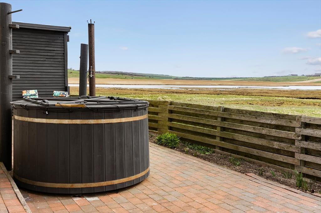 Wenn das Wetter mitspielt, sind die Terrasse und das große Grundstück ein herrlicher Ort, um Zeit miteinander zu verbringen. Auf der Terrasse befindet sich ein Hot Tub, in dem ihr euch entspannen und die Aussicht auf die umliegende Natur genießen könnt. Es ist auch der perfekte Platz zum Grillen, draußen essen oder einfach die Sonne genießen. Vom Ferienhaus aus sind es nur wenige Schritte bis zum Strand, sodass ihr schnell ins Wasser springen oder schöne Steine und Muscheln sammeln könnt. Das Grundstück ist groß und weitläufig – ideal zum Spielen oder Entspannen im privaten Garten. Für Angler gibt es gute Möglichkeiten, den Fang direkt vor Ort zu reinigen, wenn das Glück auf eurer Seite ist. Hier gehen Entspannung und Aktivität Hand in Hand.