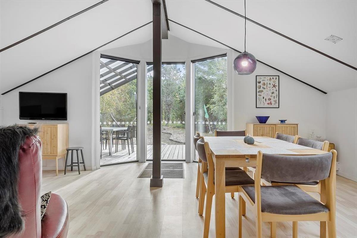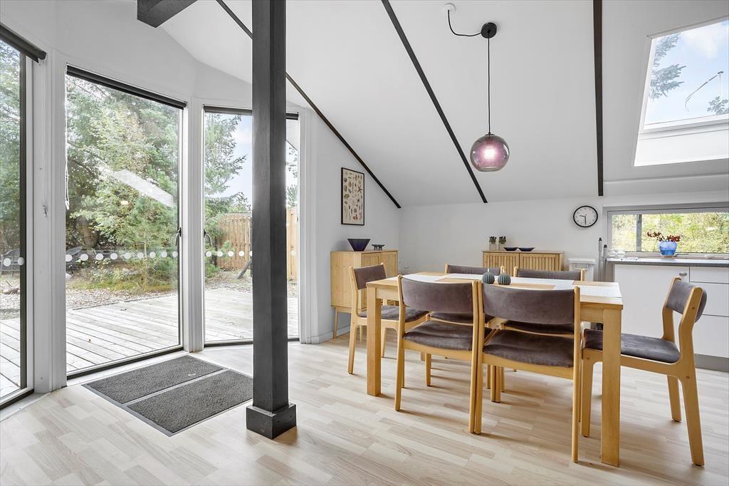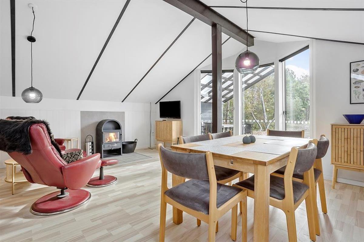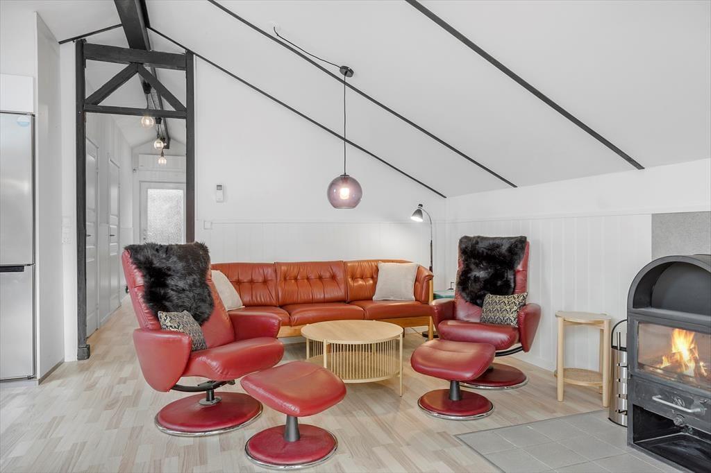 Die hellen Farbtöne, das mit Bedacht ausgewählte Mobiliar, die weiß gestrichene, hohe Decke und viele andere schöne Dinge tragen maßgeblich zu einladenden Wohnatmosphäre bei. Der Wohnraum und die Küche bilden eine offen verbundene Einheit. Der Kaminofen ist perfekt nahe der Polstersitzgruppe platziert. Während du dich im Wohnraum in vollen Zügen entspannst, blickst du durch die großen Fenster am Giebel hinaus auf das grüne Naturgrundstück. Ein Badezimmer mit Duschnische steht ebenso zur Verfügung wie drei Schlafräume. Insgesamt beherbergt dieses Ferienhaus bis zu sechs Gäste. Dein vierbeiniges Familienmitglied ist in diesem Haus ebenfalls willkommen und wird sich hier mindestens genauso wohlfühlen, wie der Rest der Familie.
