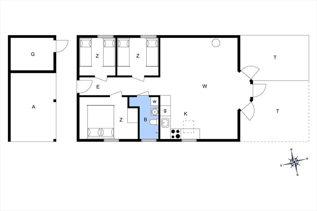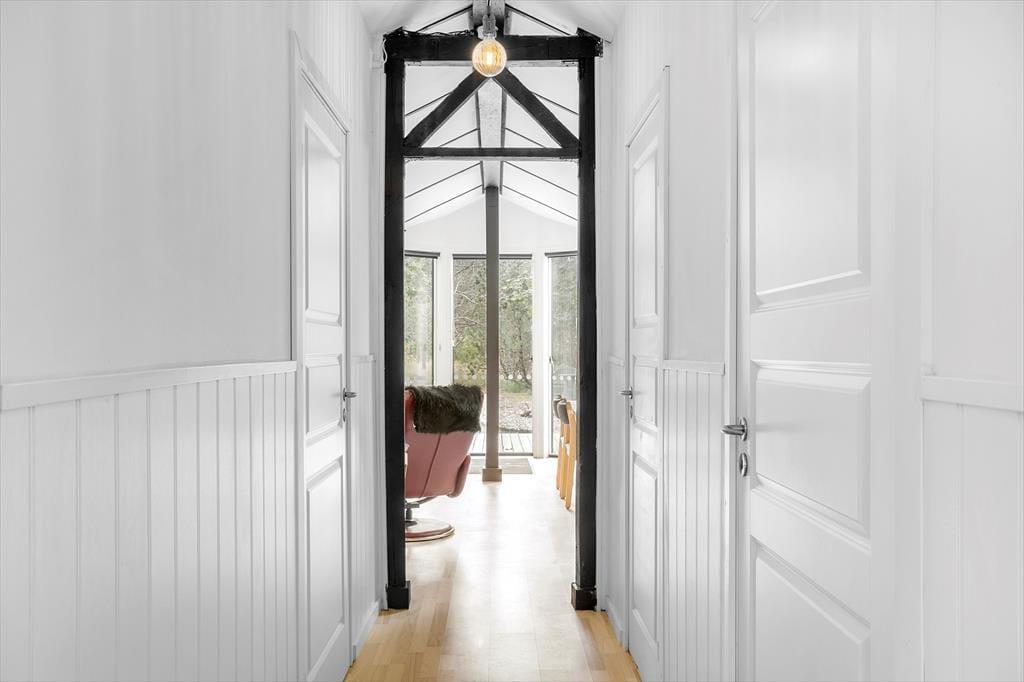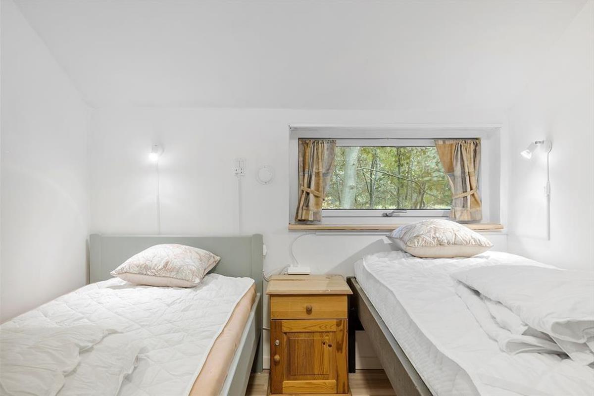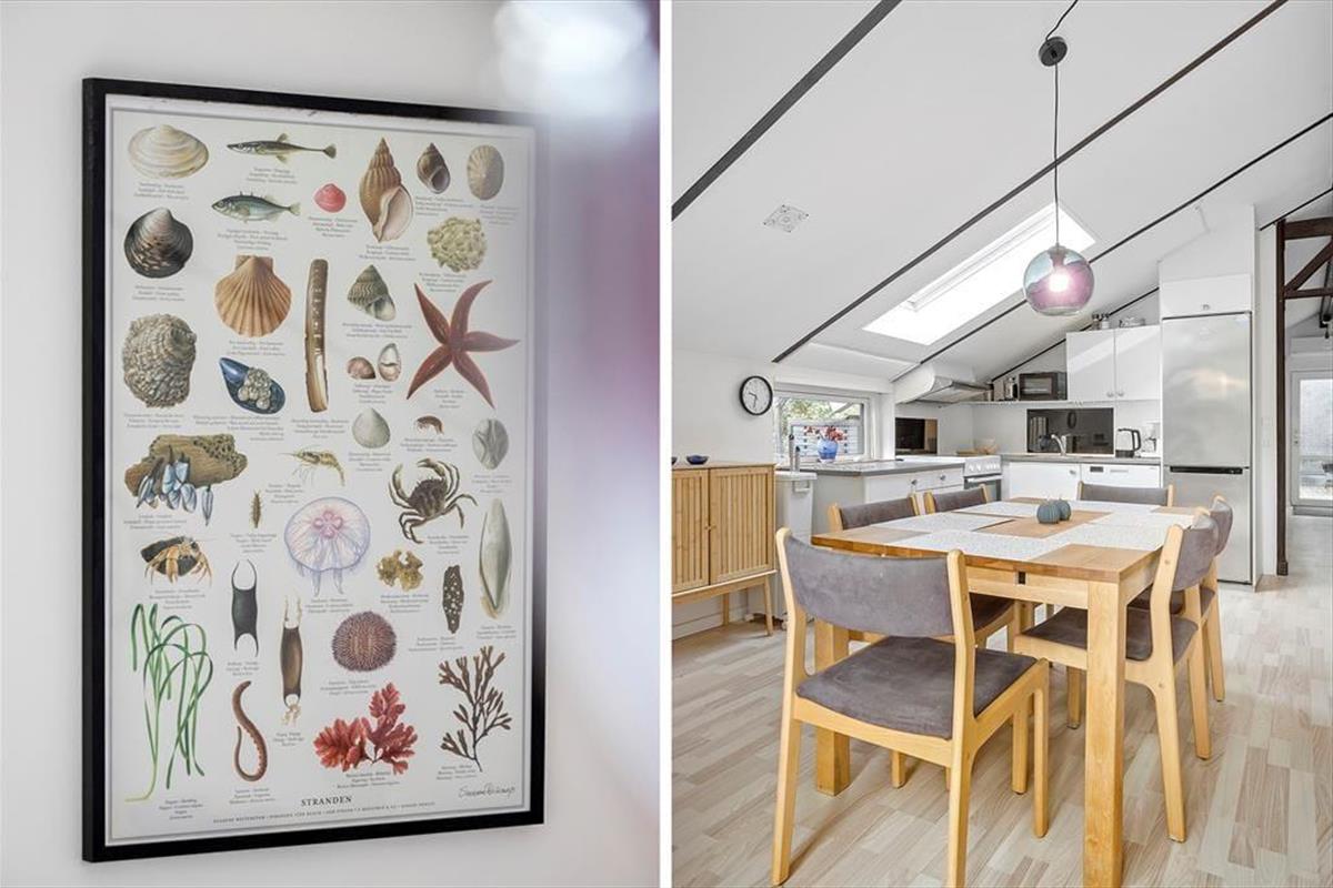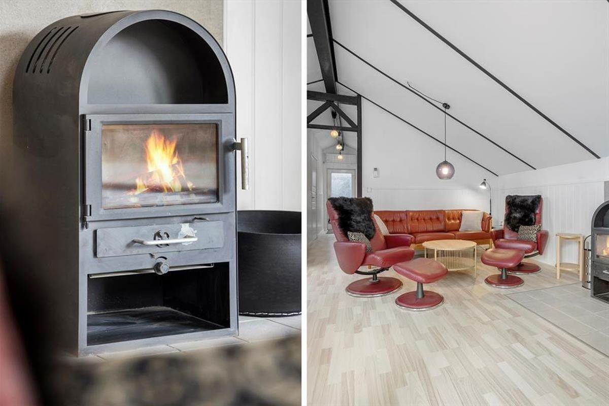 Die hellen Farbtöne, das mit Bedacht ausgewählte Mobiliar, die weiß gestrichene, hohe Decke und viele andere schöne Dinge tragen maßgeblich zu einladenden Wohnatmosphäre bei. Der Wohnraum und die Küche bilden eine offen verbundene Einheit. Der Kaminofen ist perfekt nahe der Polstersitzgruppe platziert. Während du dich im Wohnraum in vollen Zügen entspannst, blickst du durch die großen Fenster am Giebel hinaus auf das grüne Naturgrundstück. Ein Badezimmer mit Duschnische steht ebenso zur Verfügung wie drei Schlafräume. Insgesamt beherbergt dieses Ferienhaus bis zu sechs Gäste. Dein vierbeiniges Familienmitglied ist in diesem Haus ebenfalls willkommen und wird sich hier mindestens genauso wohlfühlen, wie der Rest der Familie.