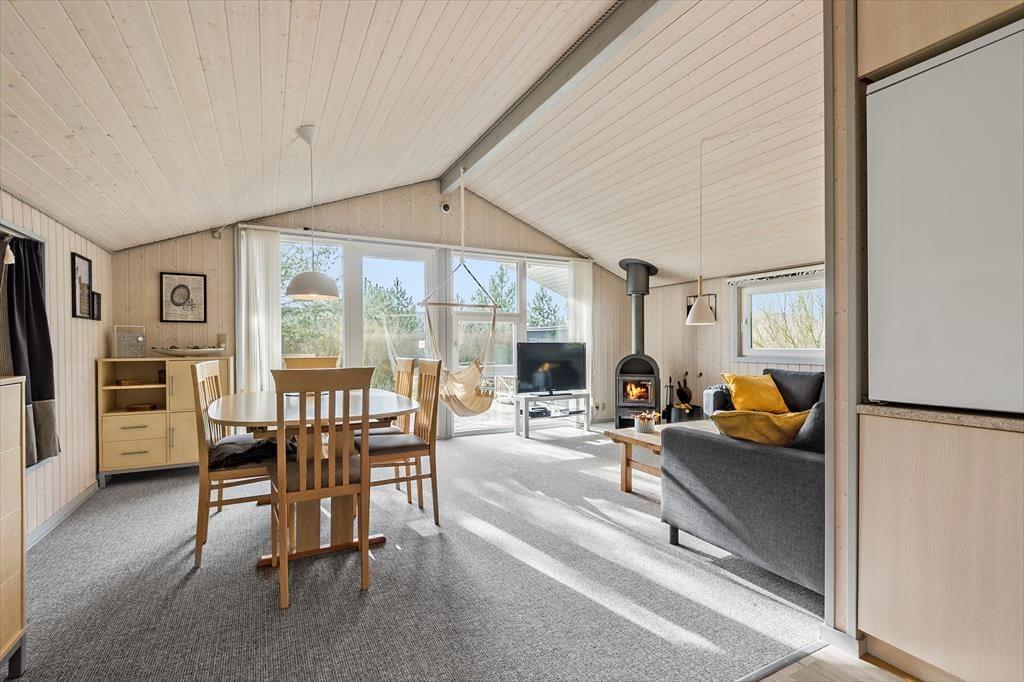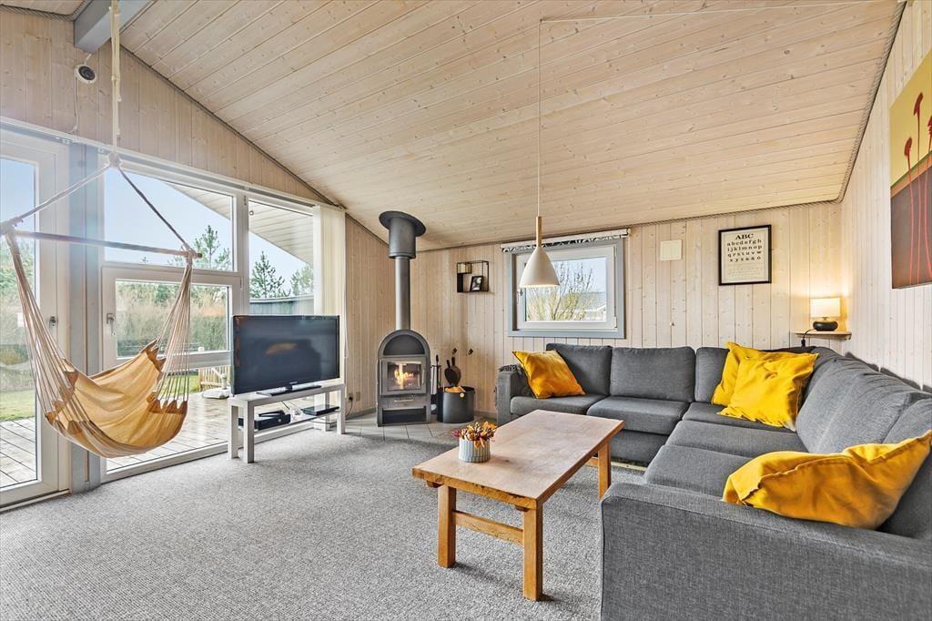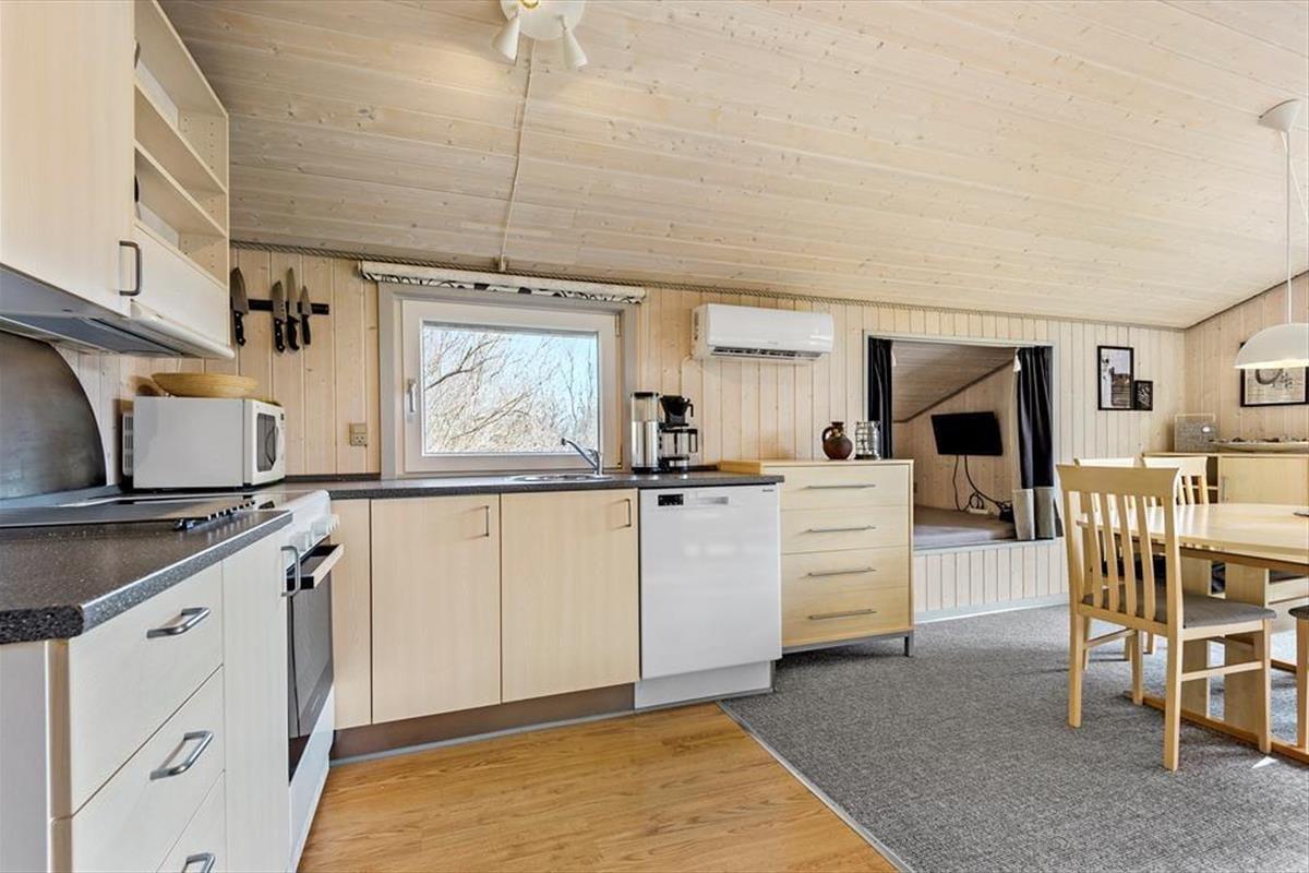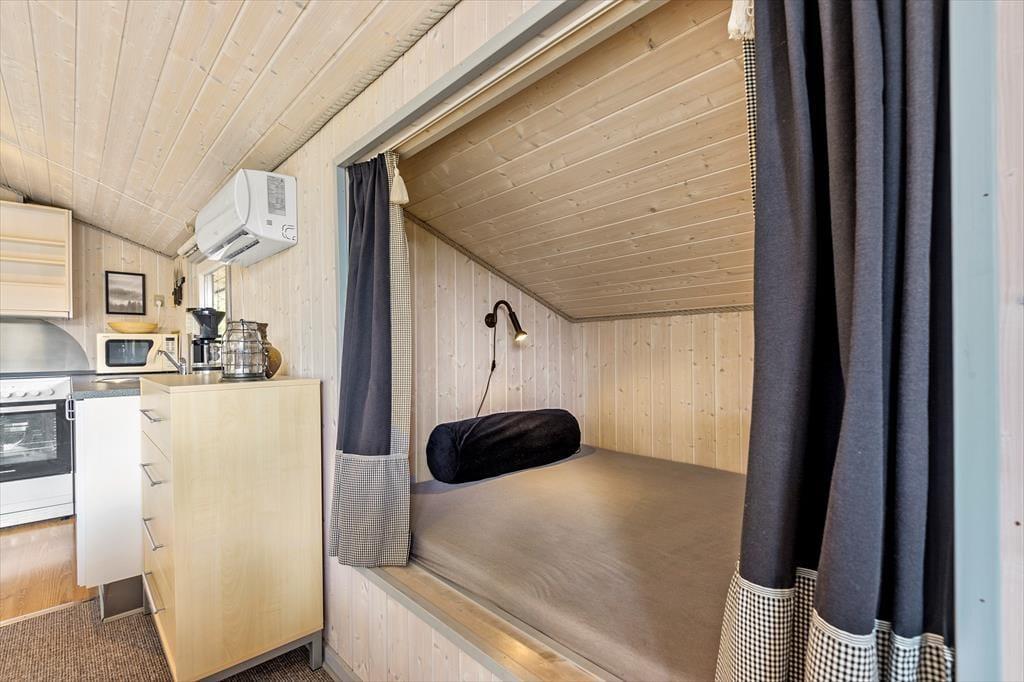 Die 61 m² umfassende Wohnfläche ist wohldurchdacht auf zwei Schlafräume, ein Badezimmer und einen Wohnraum mit integrierter Küchenabteilung aufgeteilt. Beide Schlafzimmer empfangen Sie mit je einem Doppelbett. Zwei weitere Schlafplätze bietet Ihnen die gemütliche Schlafnische im Wohnraum, sodass dieses Urlaubsdomizil insgesamt bis zu sechs Urlaubsgäste beherbergt. Im Tagesverlauf kann die Schlafnische auch als gemütliche Kuschelecke fungieren, in der Sie ein Mittagsschläfchen halten oder ein gutes Buch lesen können. Für echte dänische Ferienhausstimmung sorgt der Kaminofen.