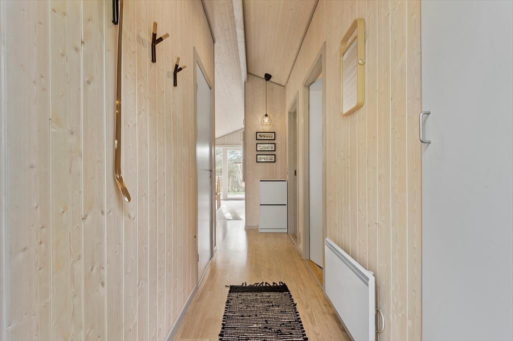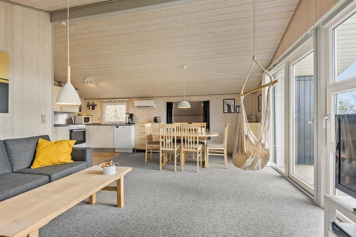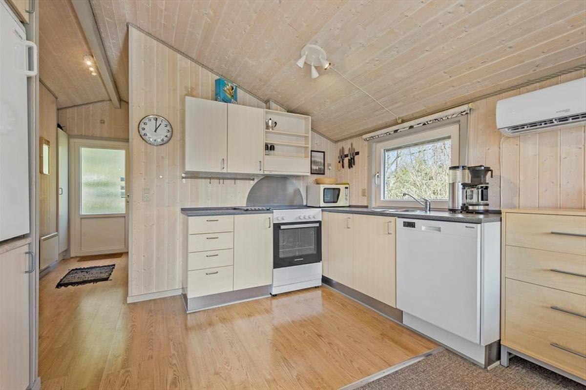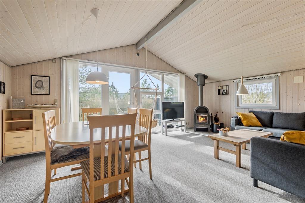 Die 61 m² umfassende Wohnfläche ist wohldurchdacht auf zwei Schlafräume, ein Badezimmer und einen Wohnraum mit integrierter Küchenabteilung aufgeteilt. Beide Schlafzimmer empfangen Sie mit je einem Doppelbett. Zwei weitere Schlafplätze bietet Ihnen die gemütliche Schlafnische im Wohnraum, sodass dieses Urlaubsdomizil insgesamt bis zu sechs Urlaubsgäste beherbergt. Im Tagesverlauf kann die Schlafnische auch als gemütliche Kuschelecke fungieren, in der Sie ein Mittagsschläfchen halten oder ein gutes Buch lesen können. Für echte dänische Ferienhausstimmung sorgt der Kaminofen.