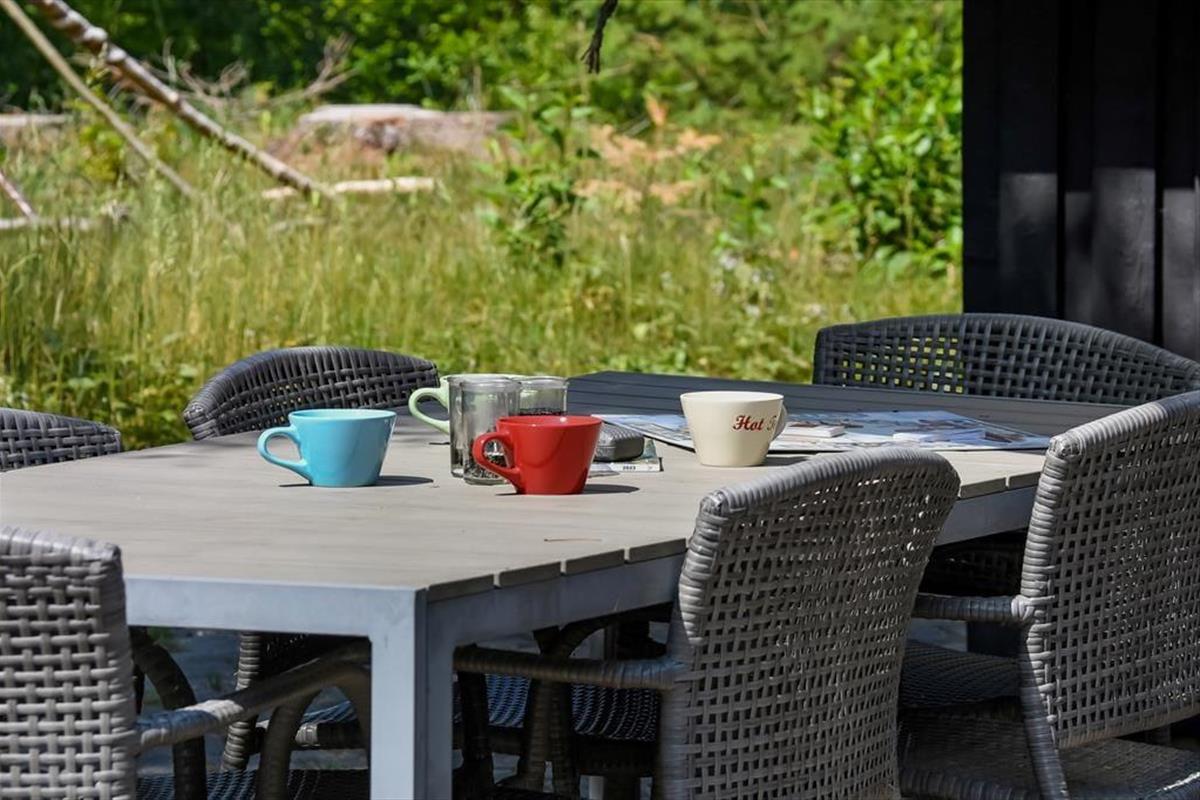 Das Ferienhaus liegt auf einem abgeschirmten Naturgrundstück, das von Laub- und Nadelbäumen umgeben ist – so gibt es zu jeder Jahreszeit eine schöne Aussicht. Wenn das Wetter warm und sonnig ist, könnt ihr es euch auf den Terrassen gemütlich machen, die sich um mehrere Seiten des Hauses erstrecken. Und falls ihr mit frisch gefangenem Fisch von der Fjordtour zurückkommt, könnt ihr ihn abends auf dem Grill zubereiten und ein festliches Essen unter freiem Himmel genießen.