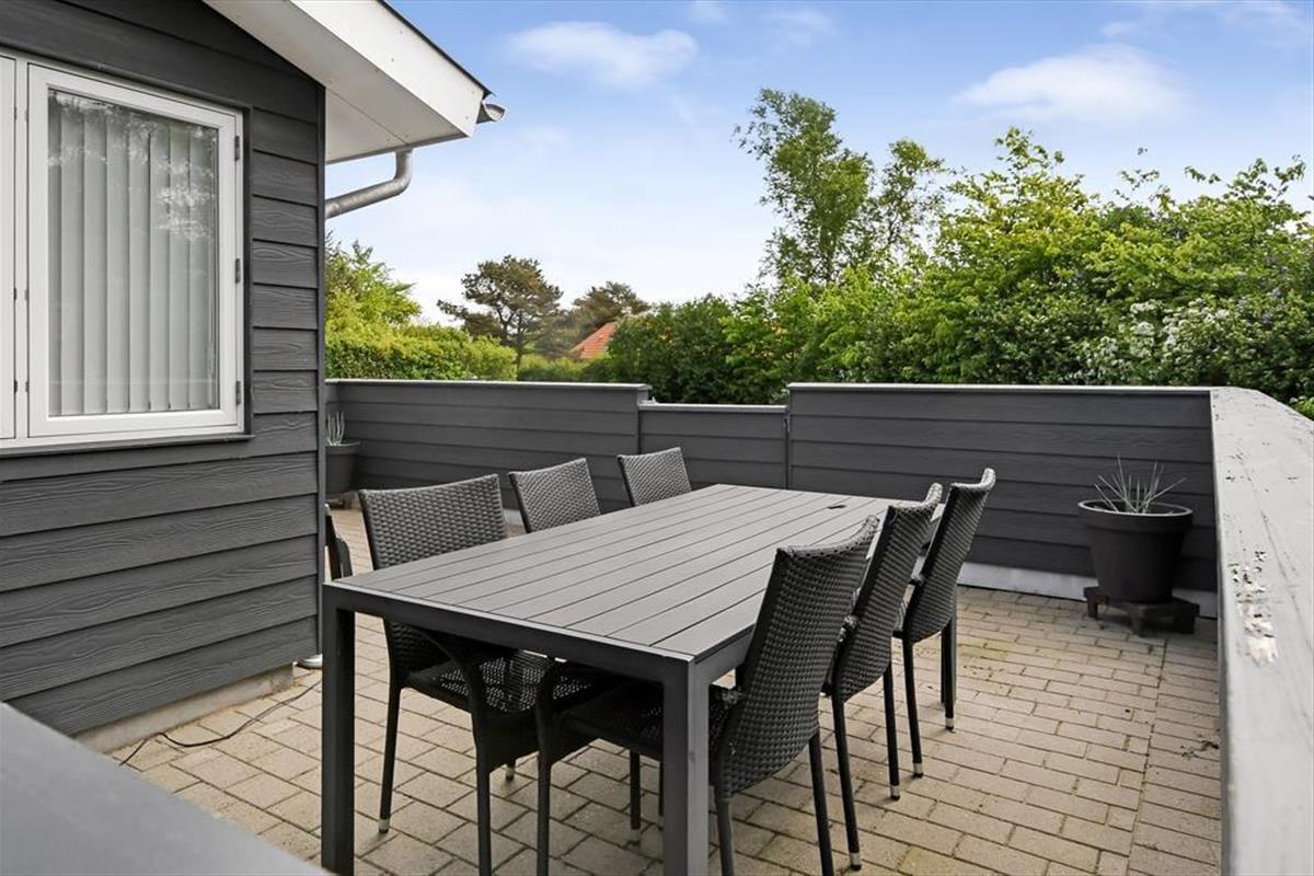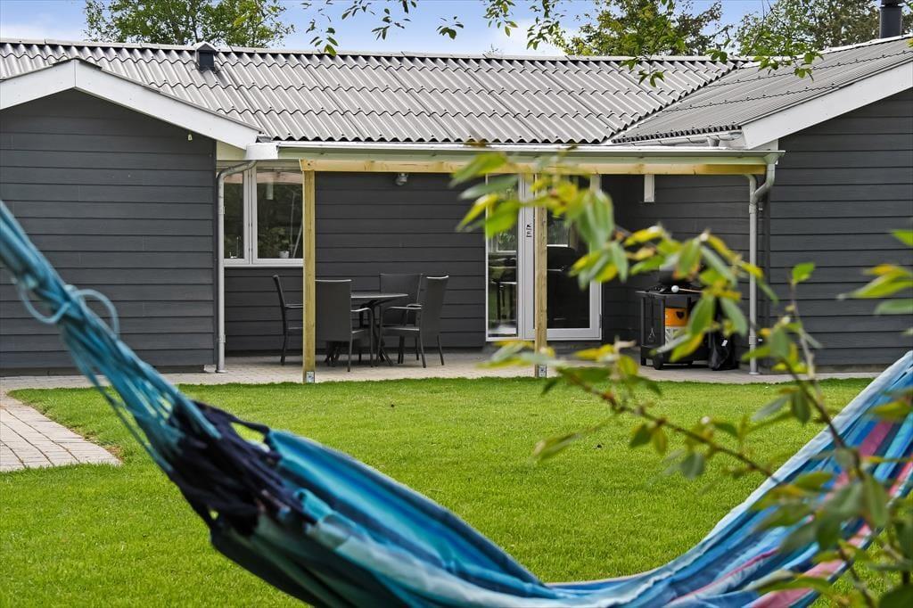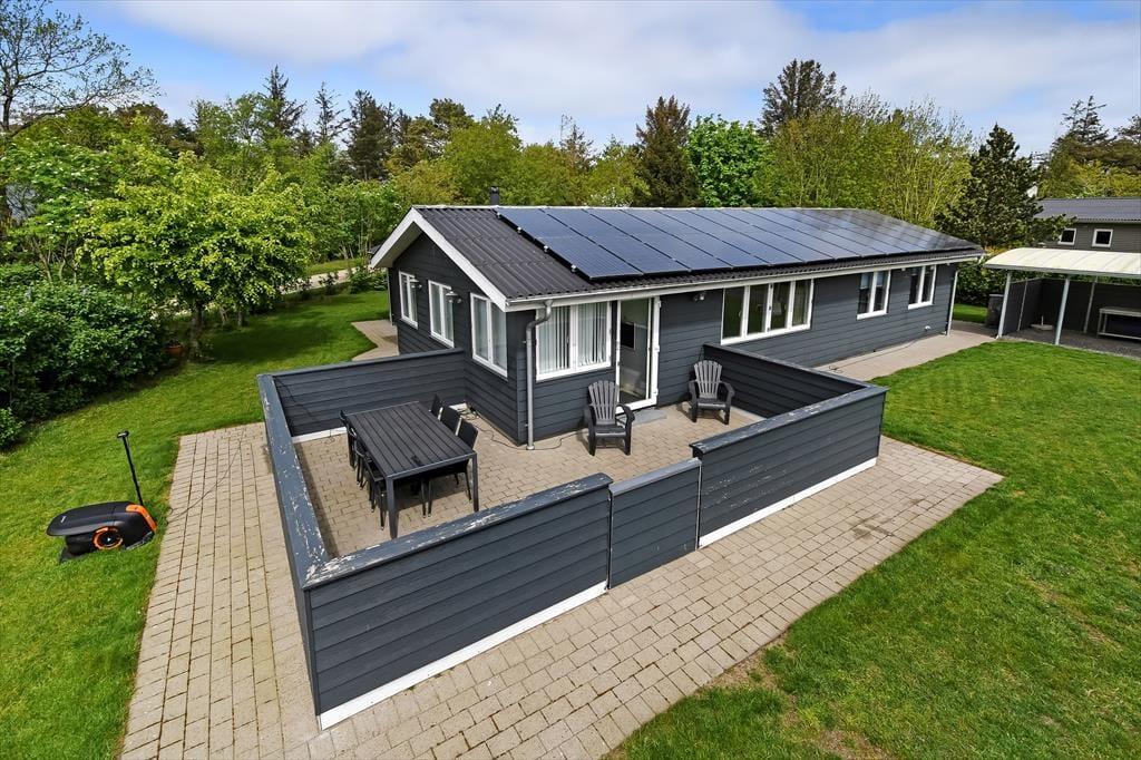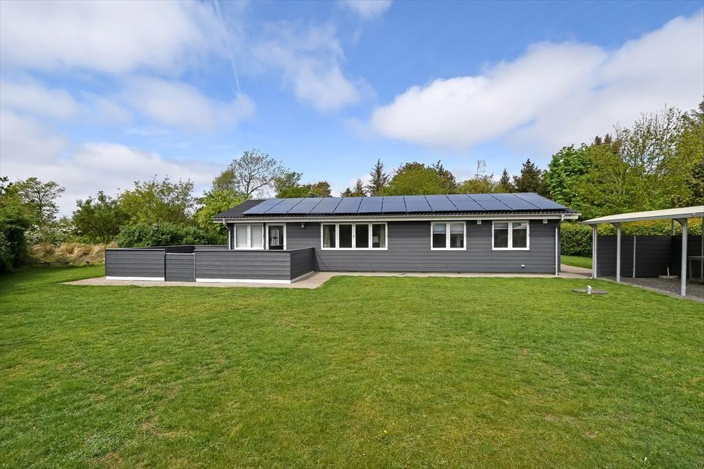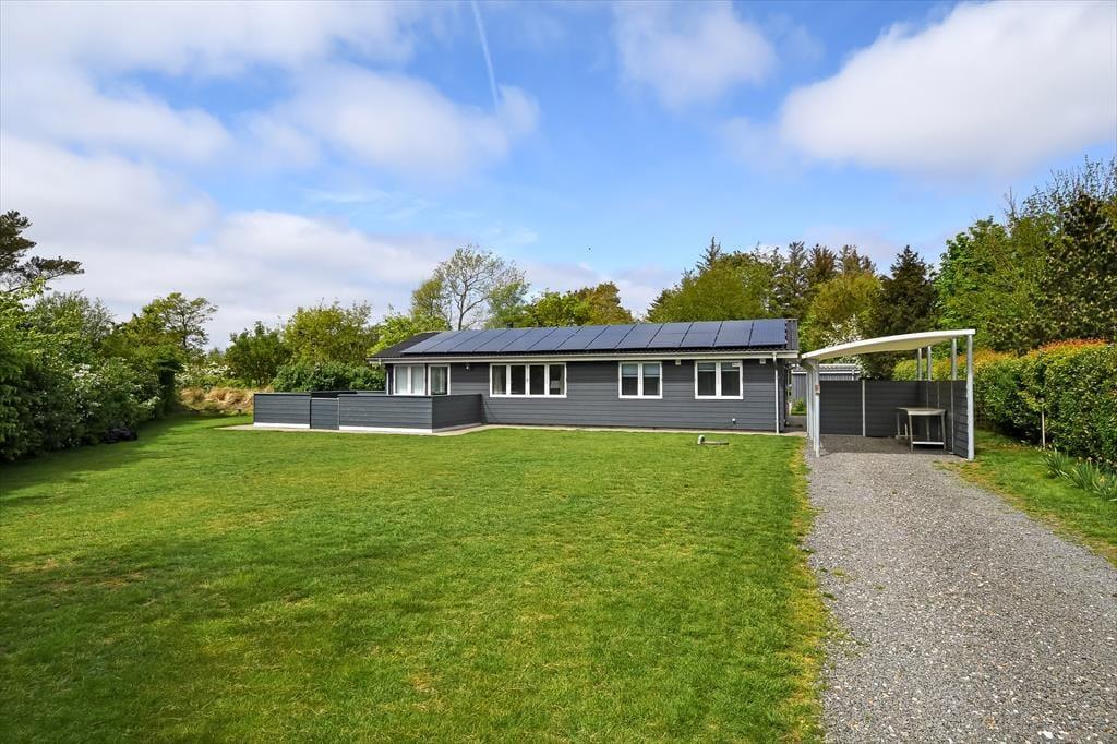 Helle Zimmer, komfortable Möbel und modernes Interieur. Sonnige Terrassen, eine grüne Wiese und nur 350 Meter bis zum Wasser. So klingt die sehr prägnante Präsentation dieses schönen Ferienhauses – und das ist eine kleine Auswahl der vielen guten Gründe, hier im Ildervej 10 bei Hemmet Strand Urlaub zu machen.