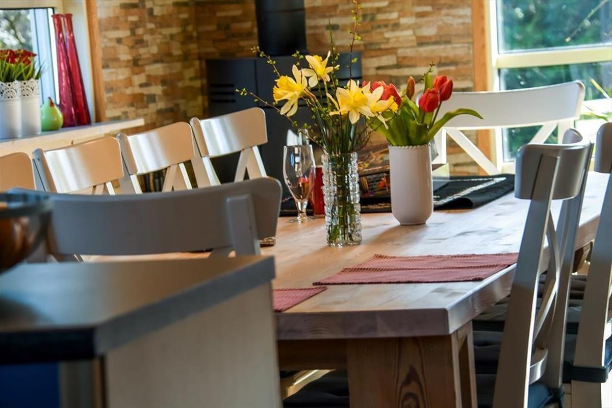 Im Inneren des Ferienhauses erwartet dich eine warme und einladende Atmosphäre, in der du dich sofort wie zu Hause fühlst. Das Wohnzimmer ist das Herz des Hauses und mit bequemen Möbeln ausgestattet, die zu gemütlichen Stunden einladen – sei es mit einem guten Buch in der Hand oder bei einem unterhaltsamen Spieleabend mit der Familie. Der Kamin verbreitet an kühleren Tagen wohlige Wärme und Gemütlichkeit, während die großen Fenster für einen herrlichen Lichteinfall und einen schönen Blick in den Garten sorgen. Die offene Küche ist direkt in den Wohnbereich integriert, sodass du auch beim Zubereiten des Abendessens am gemeinsamen Beisammensein teilhaben kannst. Nach einem erlebnisreichen Tag kannst du dich in die behaglichen Schlafzimmer zurückziehen, wo du vollkommen entspannen und neue Energie für einen weiteren wunderschönen Urlaubstag tanken kannst.